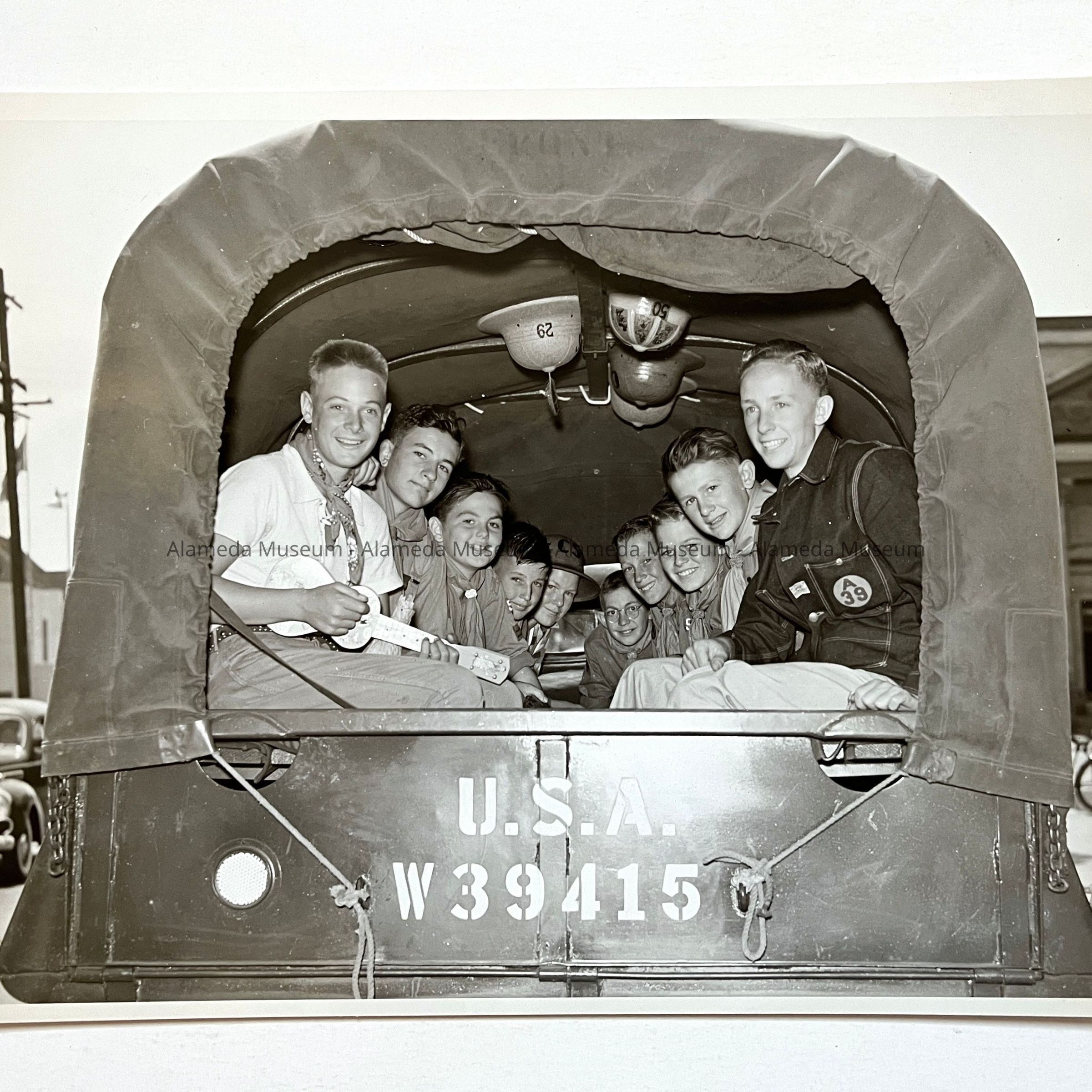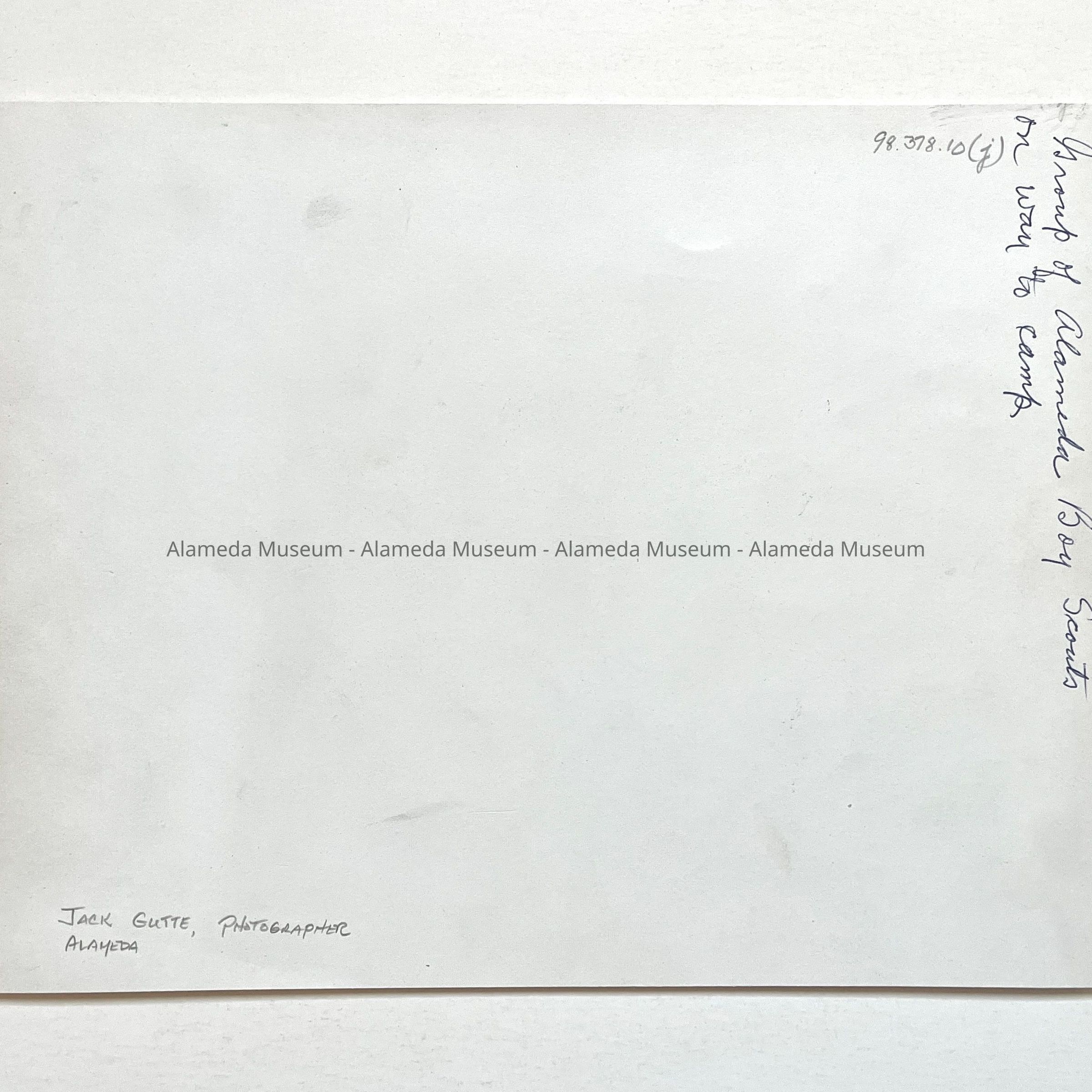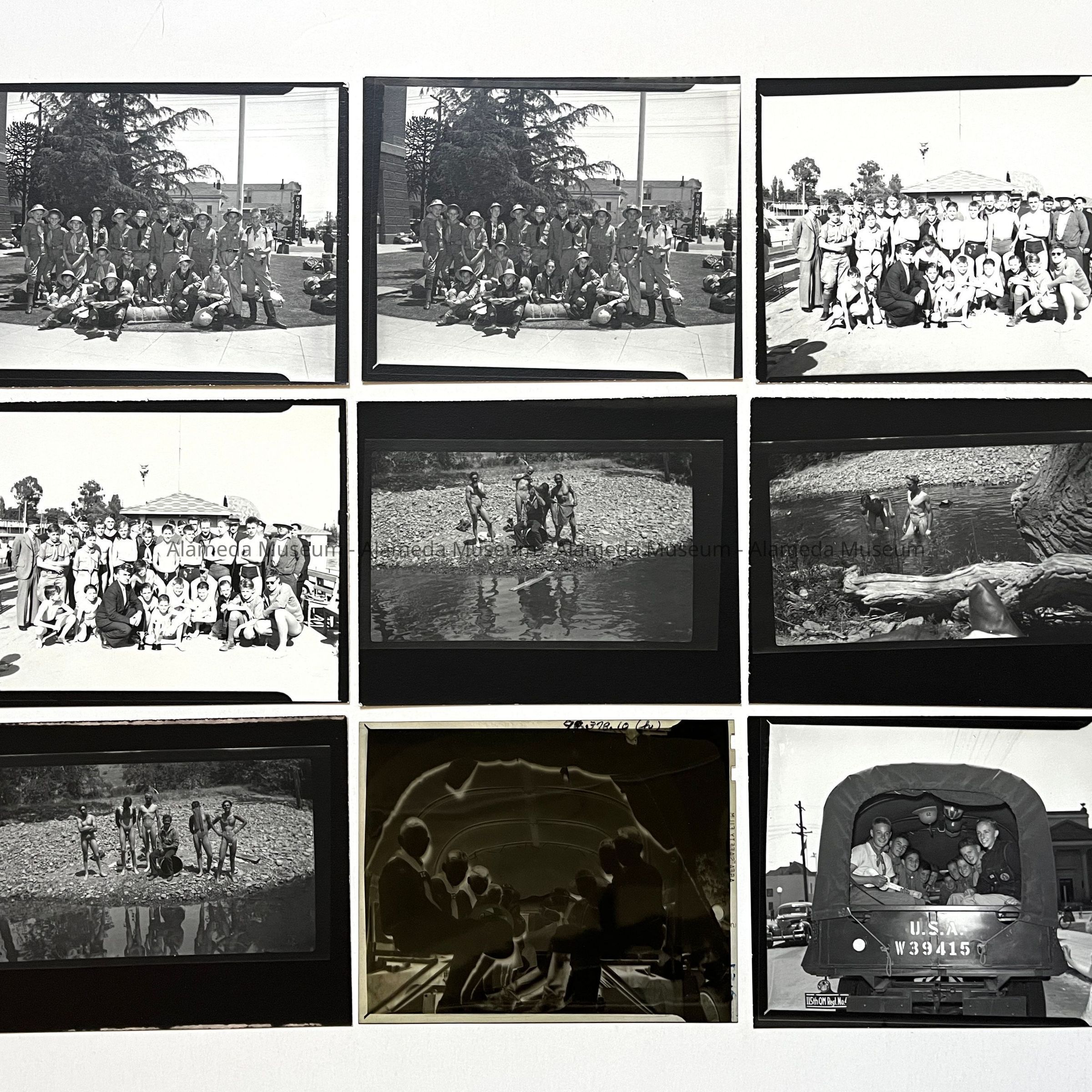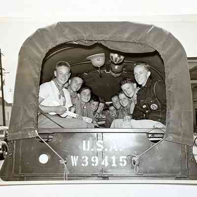 History of Object: Various scenes of Boy Scout activity:#a-b:group assembled by City Hall; #c-d: assembled by swimming pool (identical images); #e-g - swimming hole group; #h- (negative of #j) Scouts in an Army truck; #i - Scouts in an Army truck; #j - enlarged version of #i.