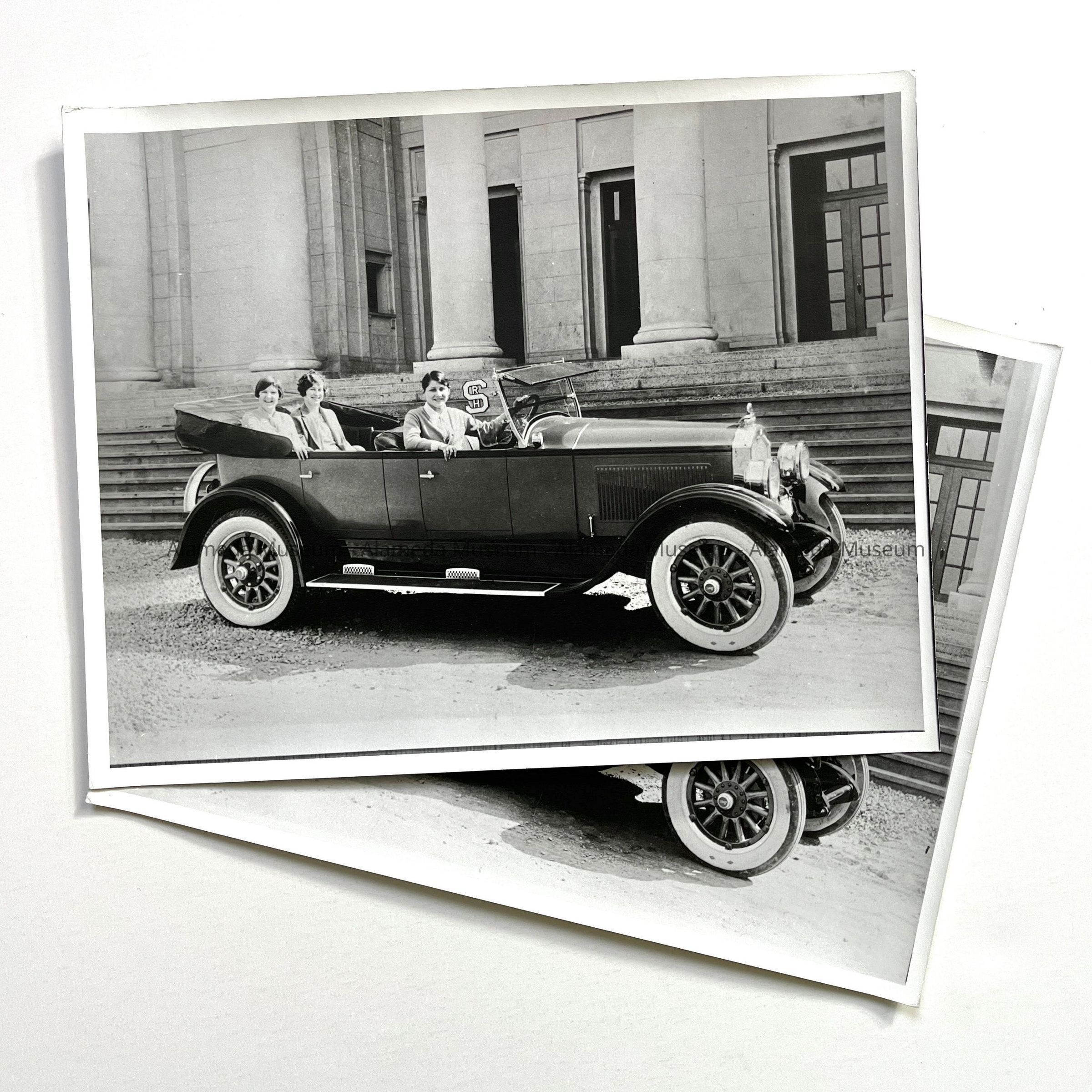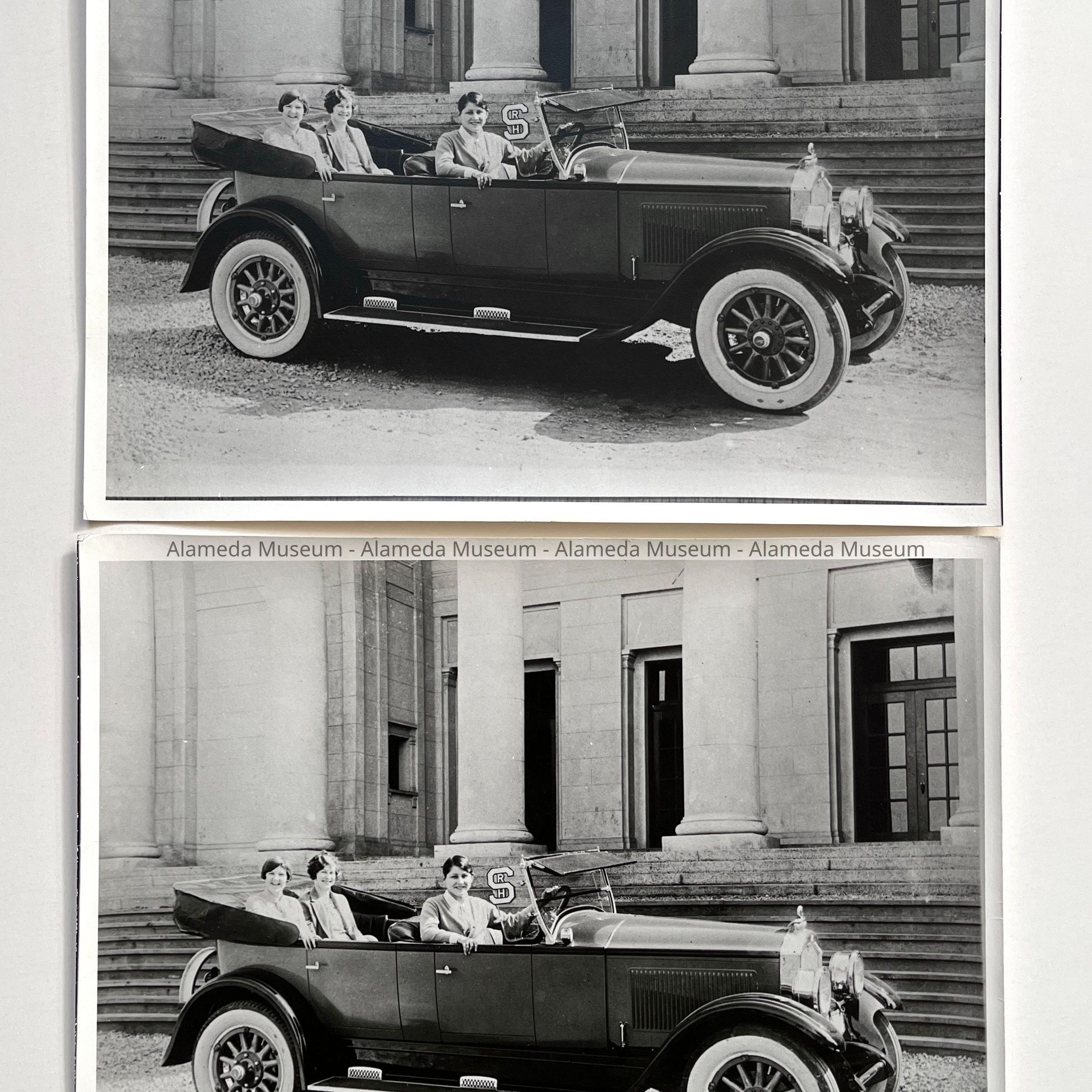 History of Object: Photograph depicting touring car with three teenage girls in front of main entrance of old Alameda High School. Ground in front of school unpaved so it appears it is during construction.