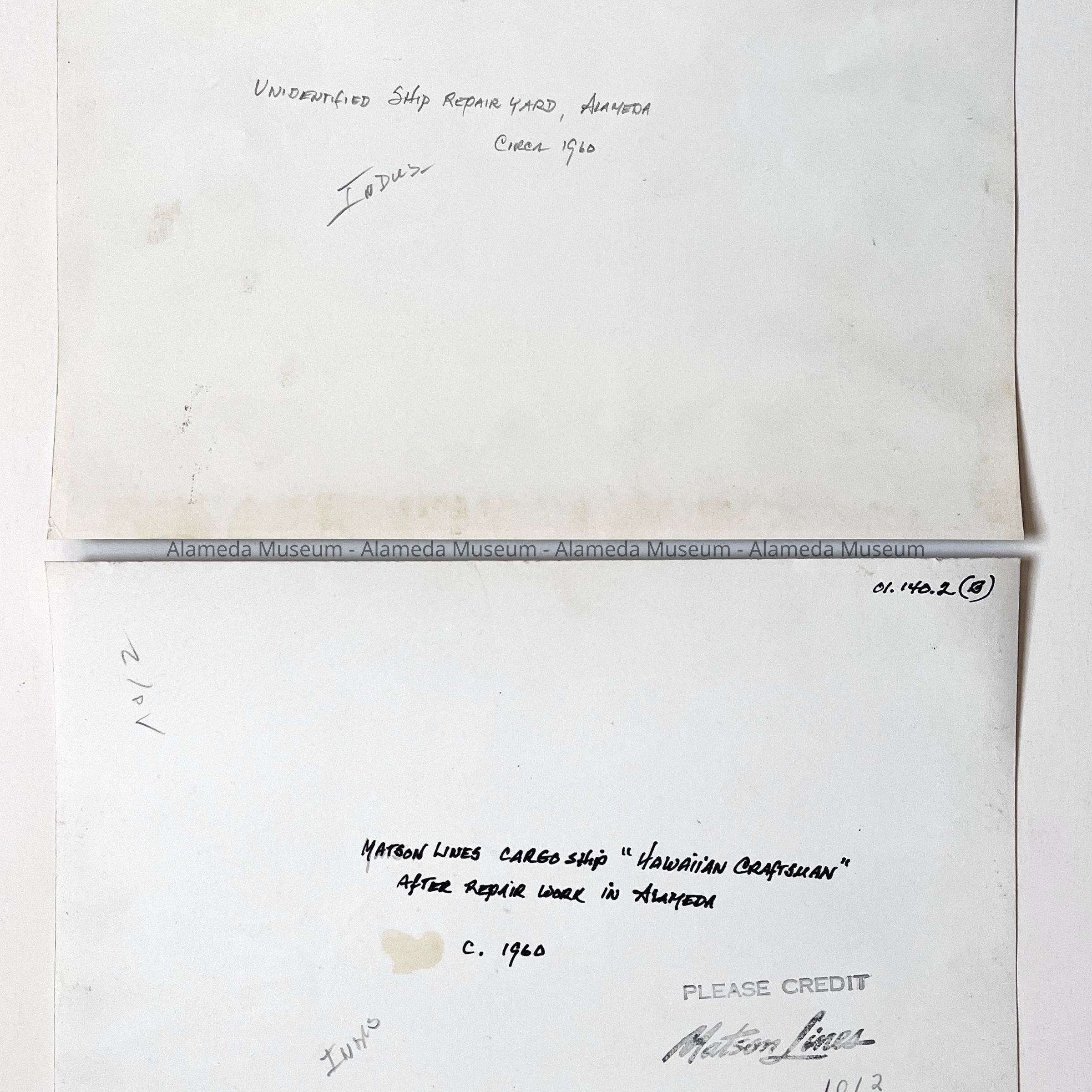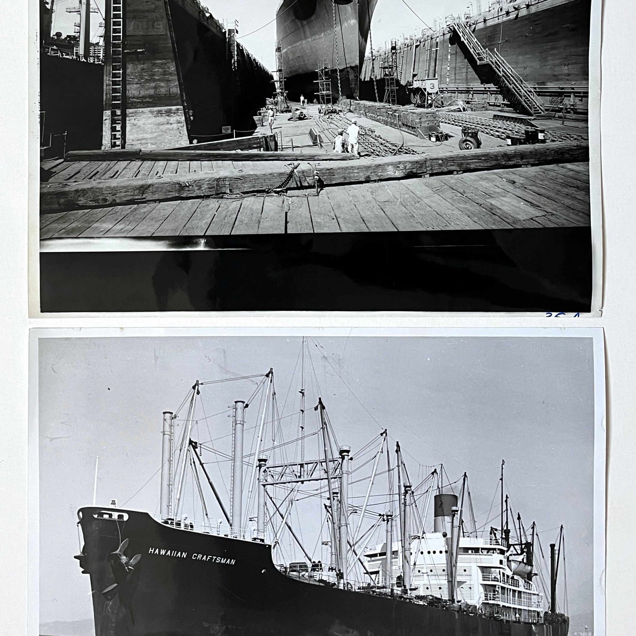 History of Object: View of (#A) a cargo ship at an unidentified Alameda drydock and (#B) a Matson Lines cargo ship "Hawaiian Craftsman" in S.F. Bay, presumably after having undergone work at an Alameda facility.