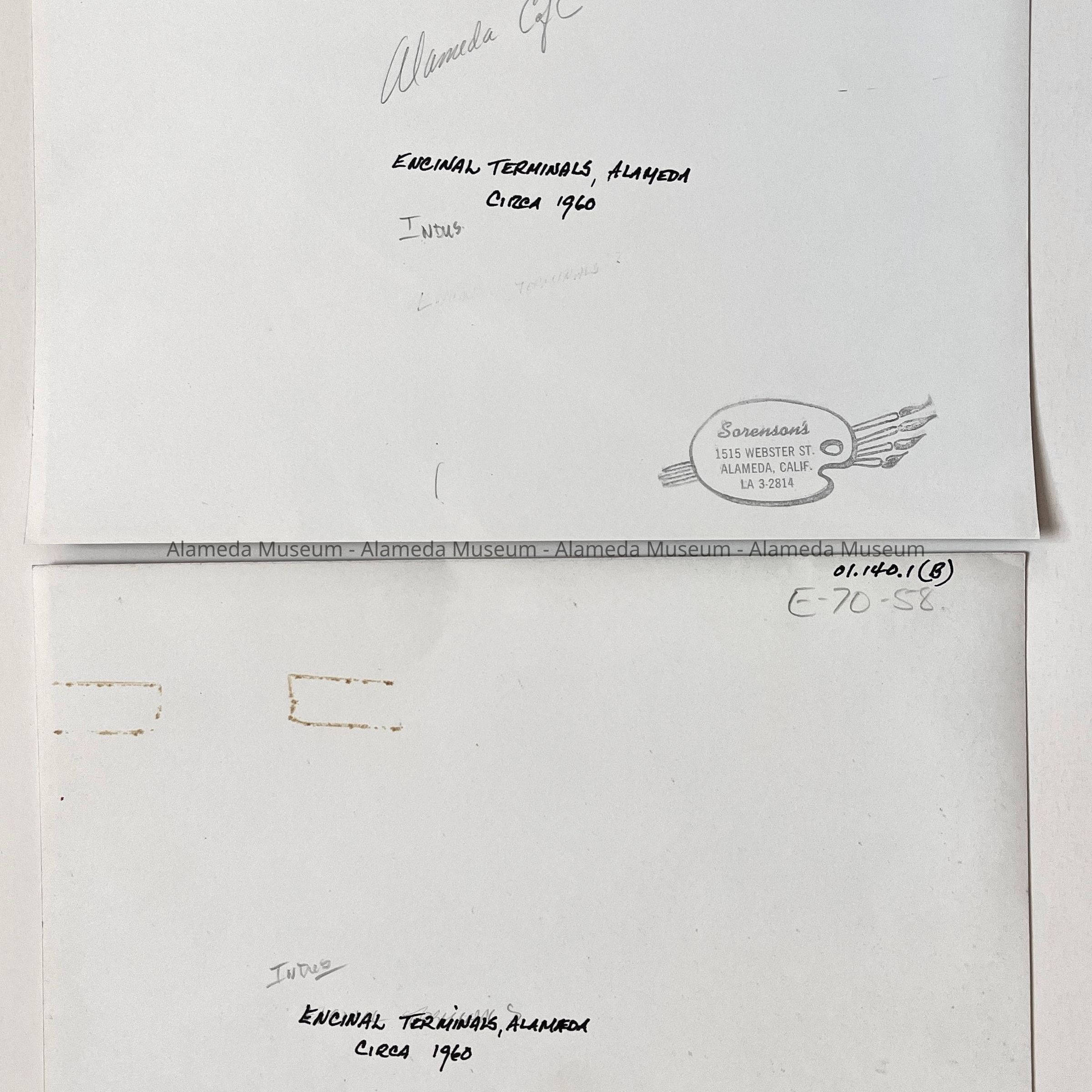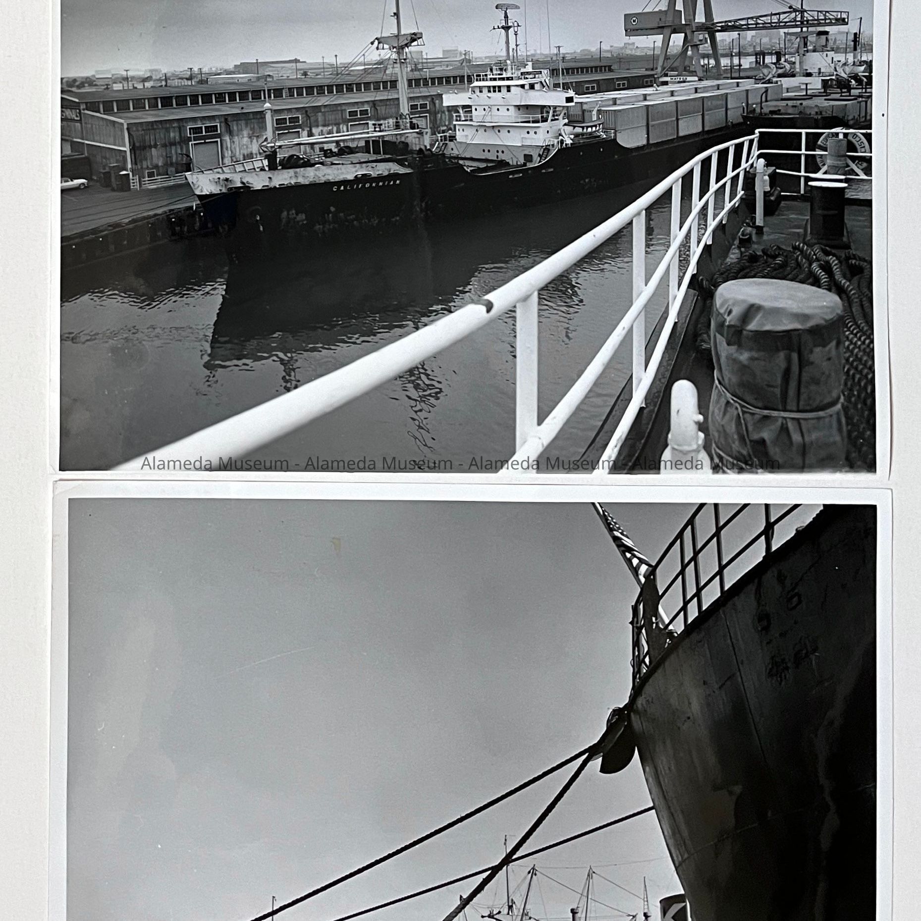 History of Object: Two views of cargo ships docked at the Encinal Terminals.