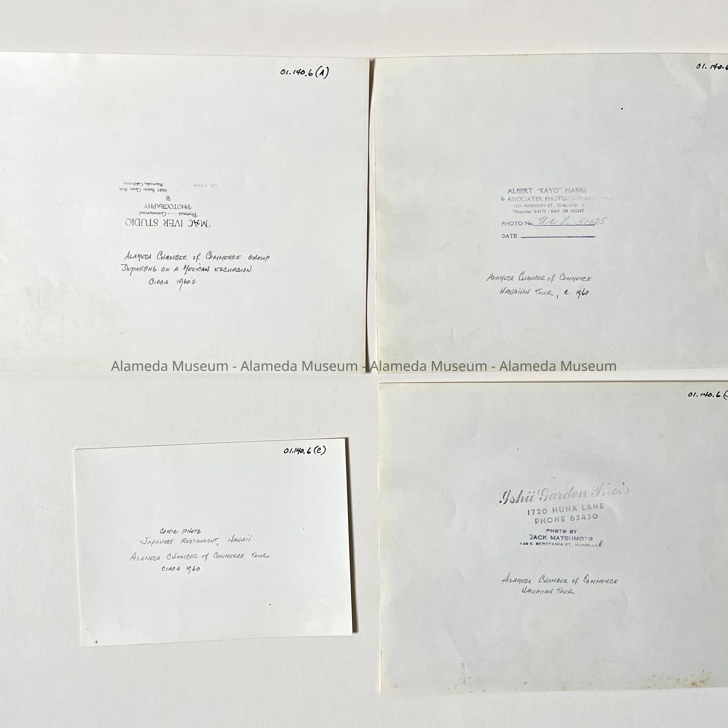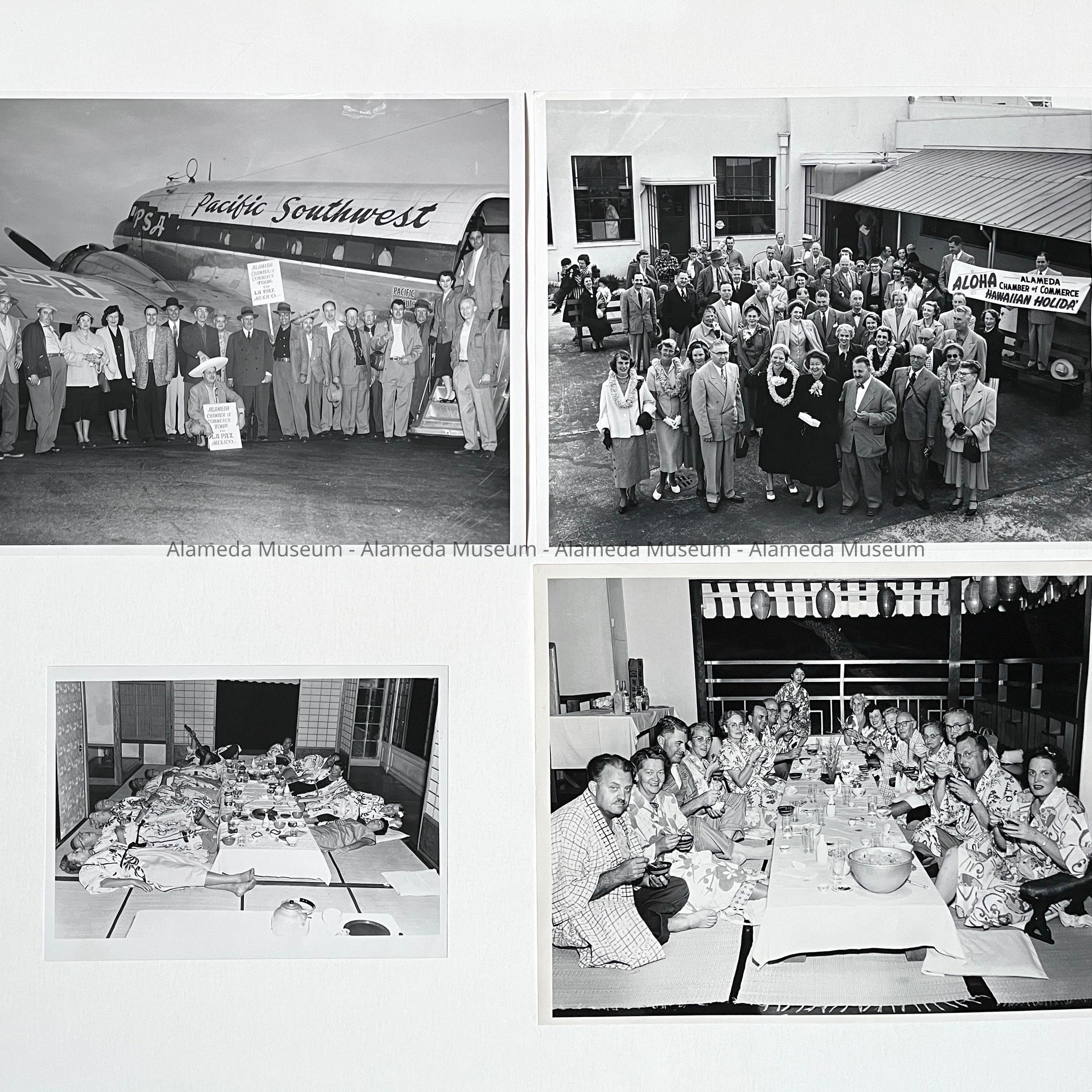 History of Object: Views of various Alameda Chamber of commerce activities: (A) Mexican holiday airport departure; (B) Hawaiian holiday airport departure; (C) comic scene in a Hawaiian Japanese restaurant; (D) dining in another Japanese restaurant; (E-F) tour members posed in front of the edgewater Hotel, Honolulu; (G) a Chamber of commerce banquet held in Alameda.