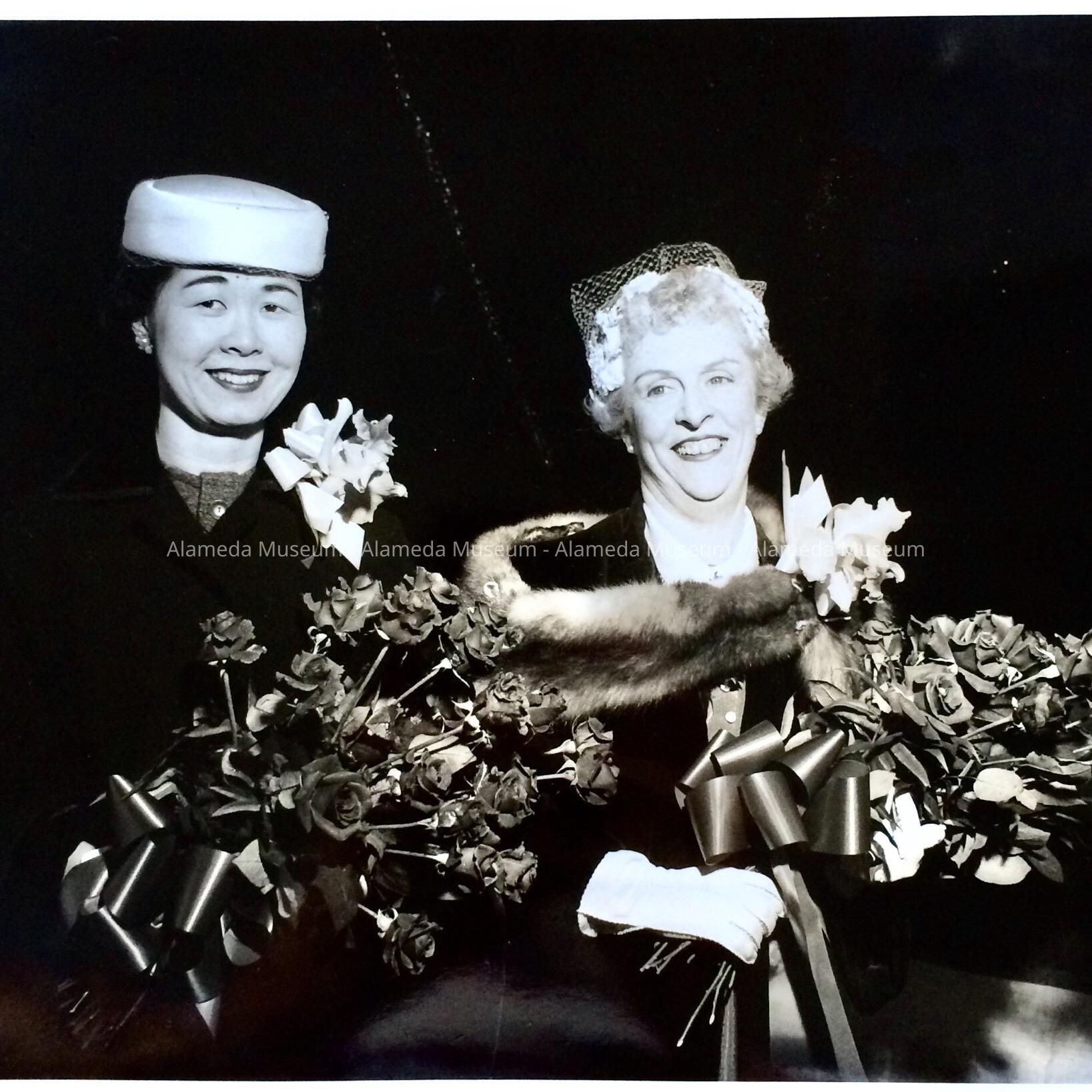 b: 3/15/57: Madeline Martin (with fur) and Kitty Hirai (with fur toque) posing with flowers