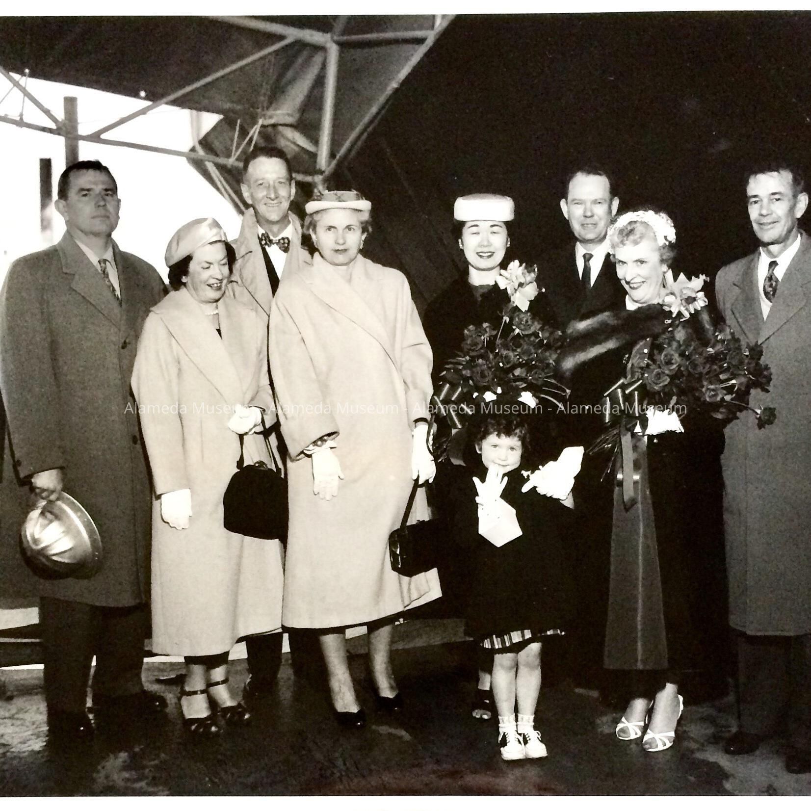c. 3/15/57: Group photo with Dean Ramsden, Geo, Gen, and Mary Anne Landis (little girl), Bill Hall and Mrs. Bill Hall, Madeline and Walt Martin, and Kitty Hirai.
