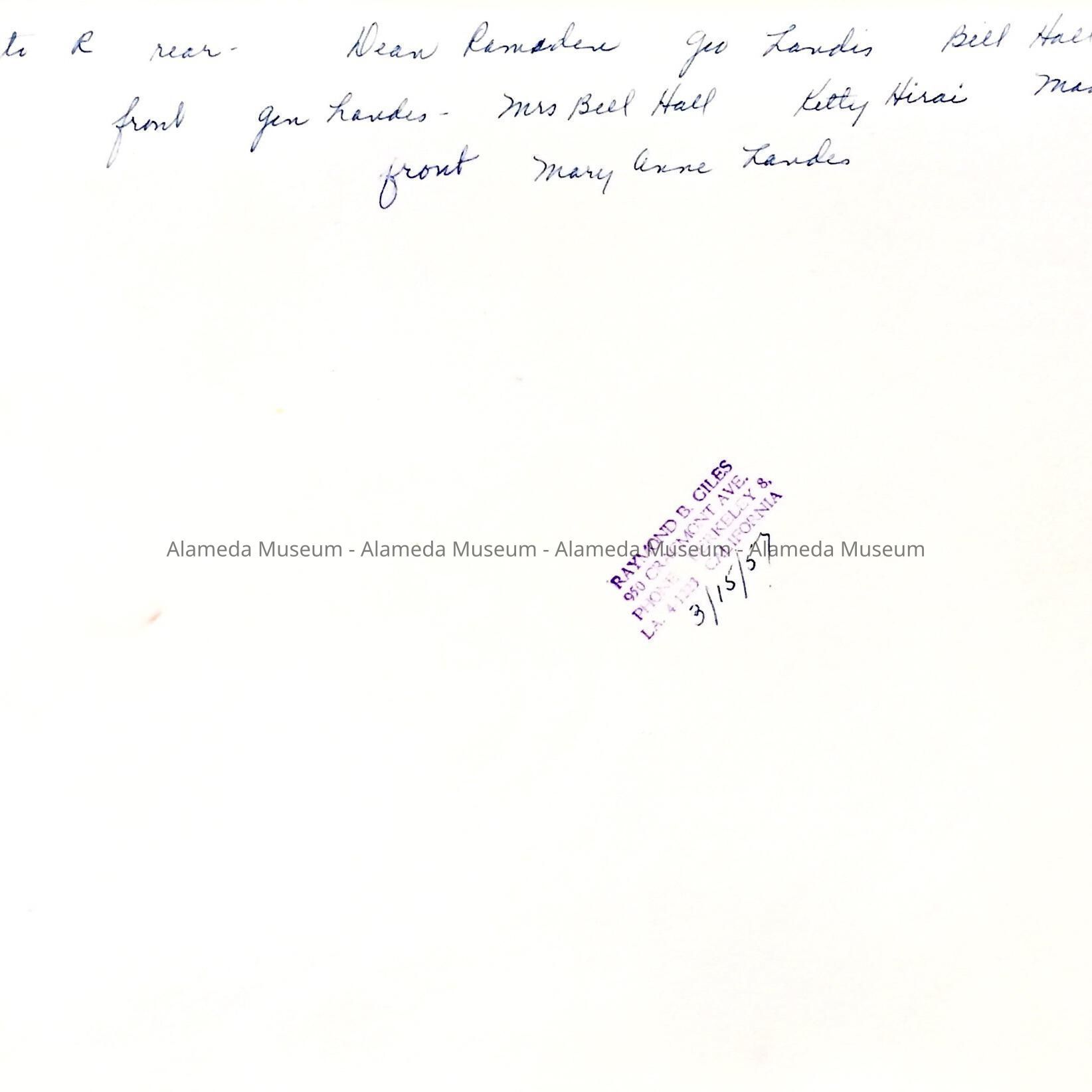 Description: Glossy black-and-white photographs. Dates on most photos and Identification of people on the reverse. Most are stamped by Raymond B. Giles, 963 Claremont Ave, Berkeley.
