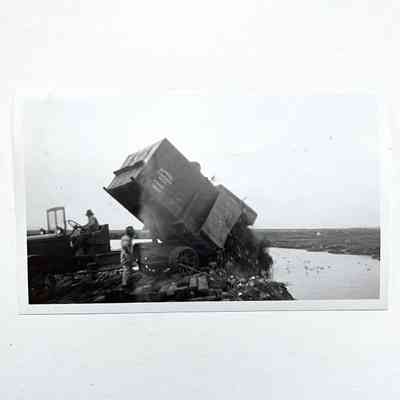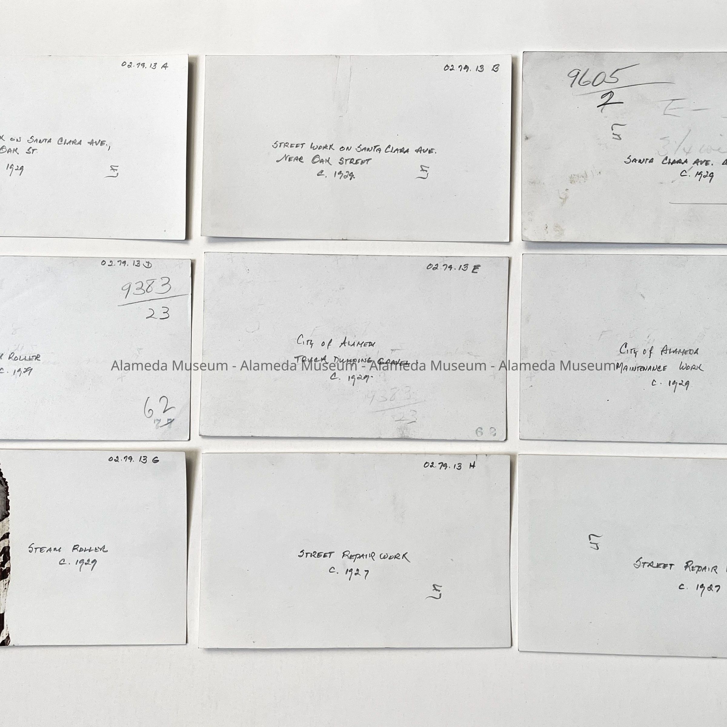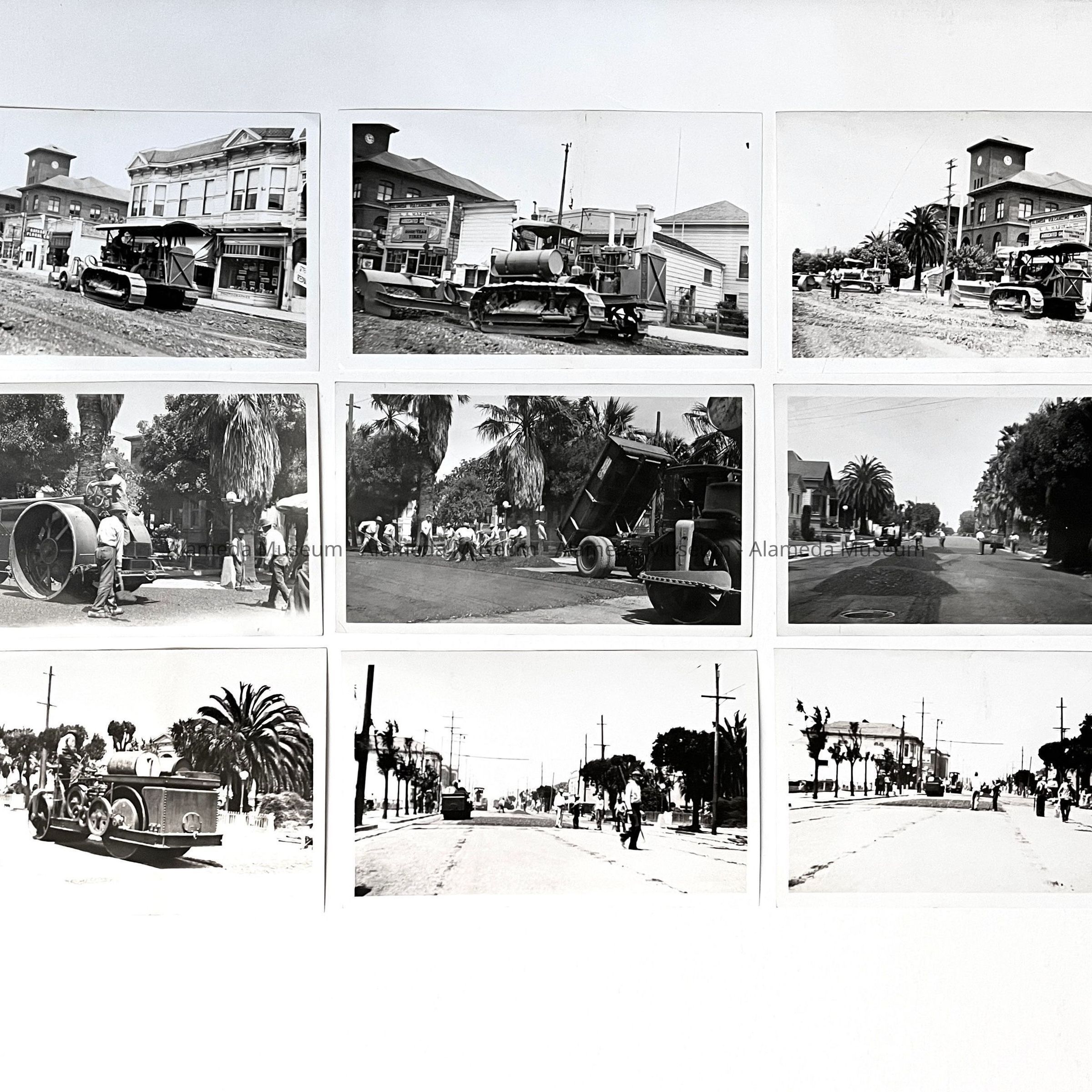History of Object: Various maintenance activity scenes: A-C) street repair work on Santa Clara Avenue near Oak street; D) steam roller; E) truck dumping gravel; F) street repair work; G) steam roller; H-I) street repair work; J) garbage truck dumping refuse on Bay Farm Island.