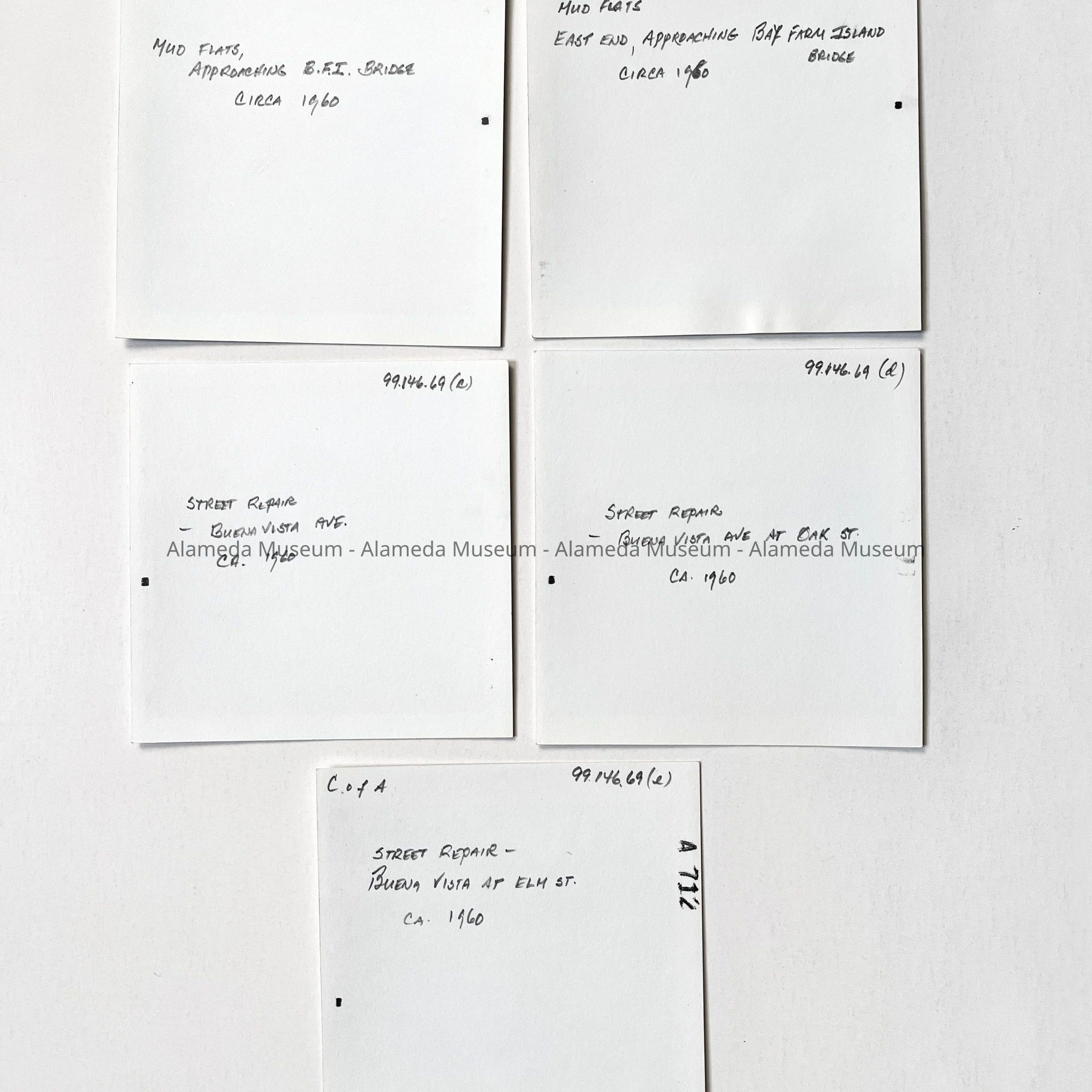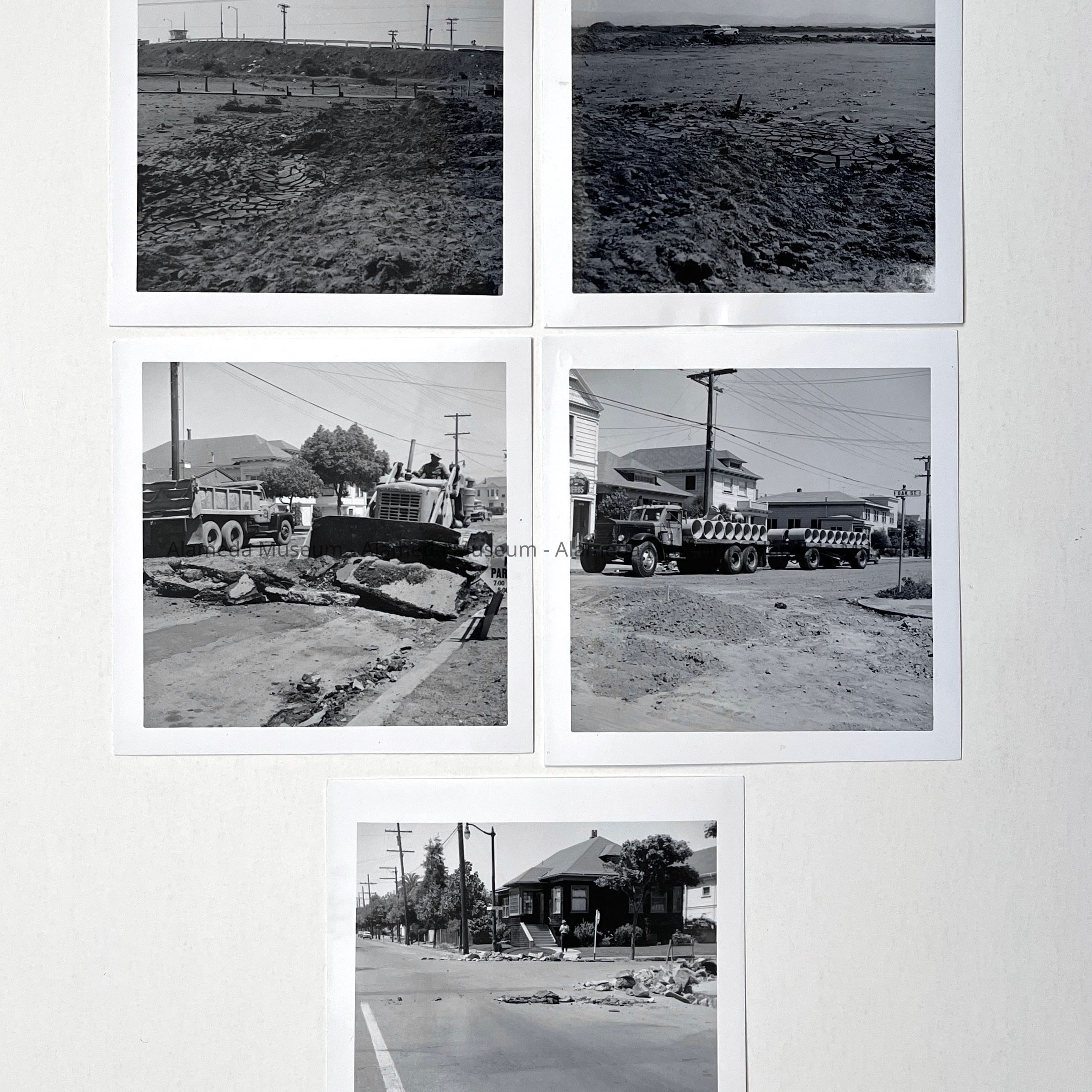 History of Object: Five views of civic maintenance projects: #a-b: mud flats in East End approaching the B.F.I. Bridge; #c-e: Buena Vista Avenue street work.