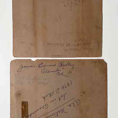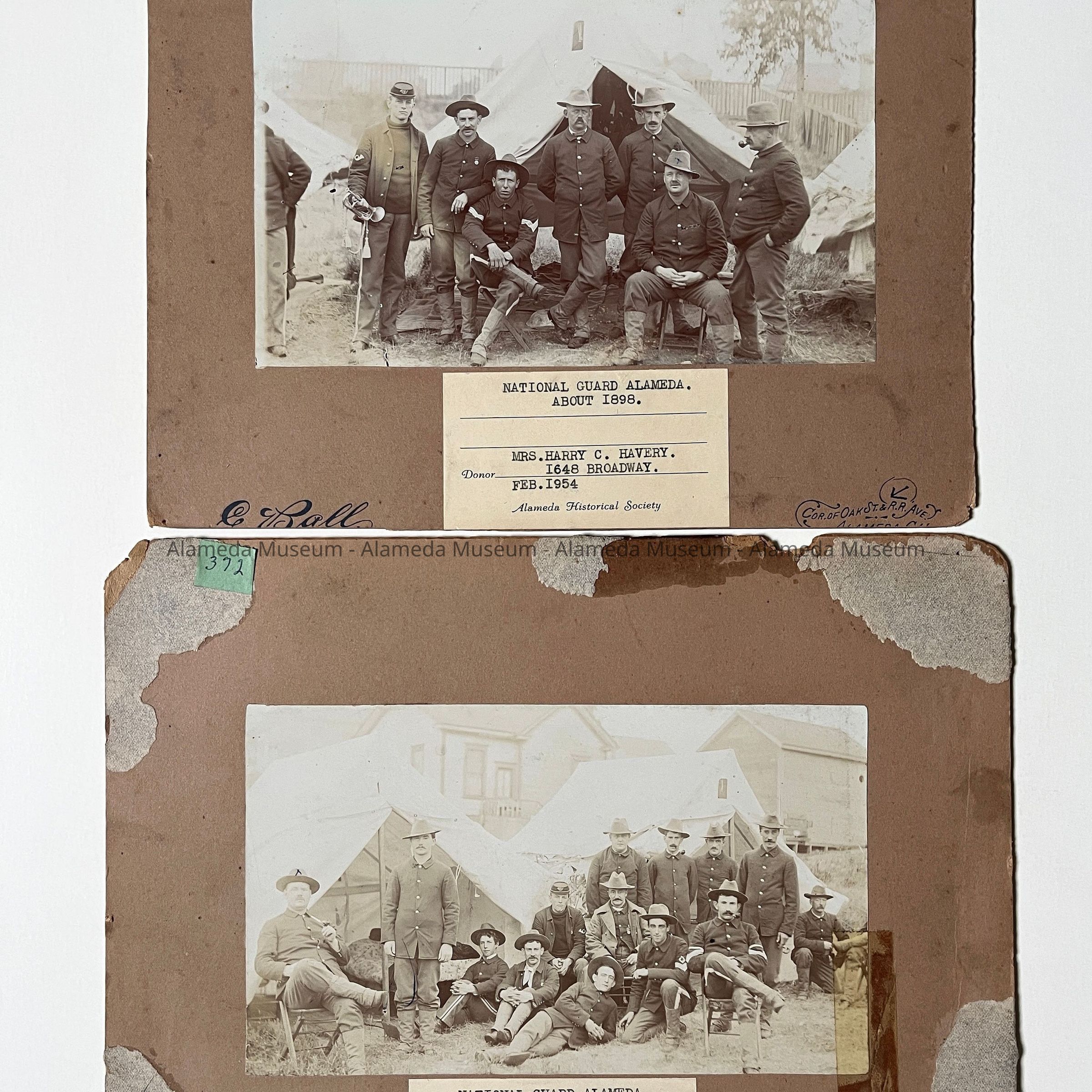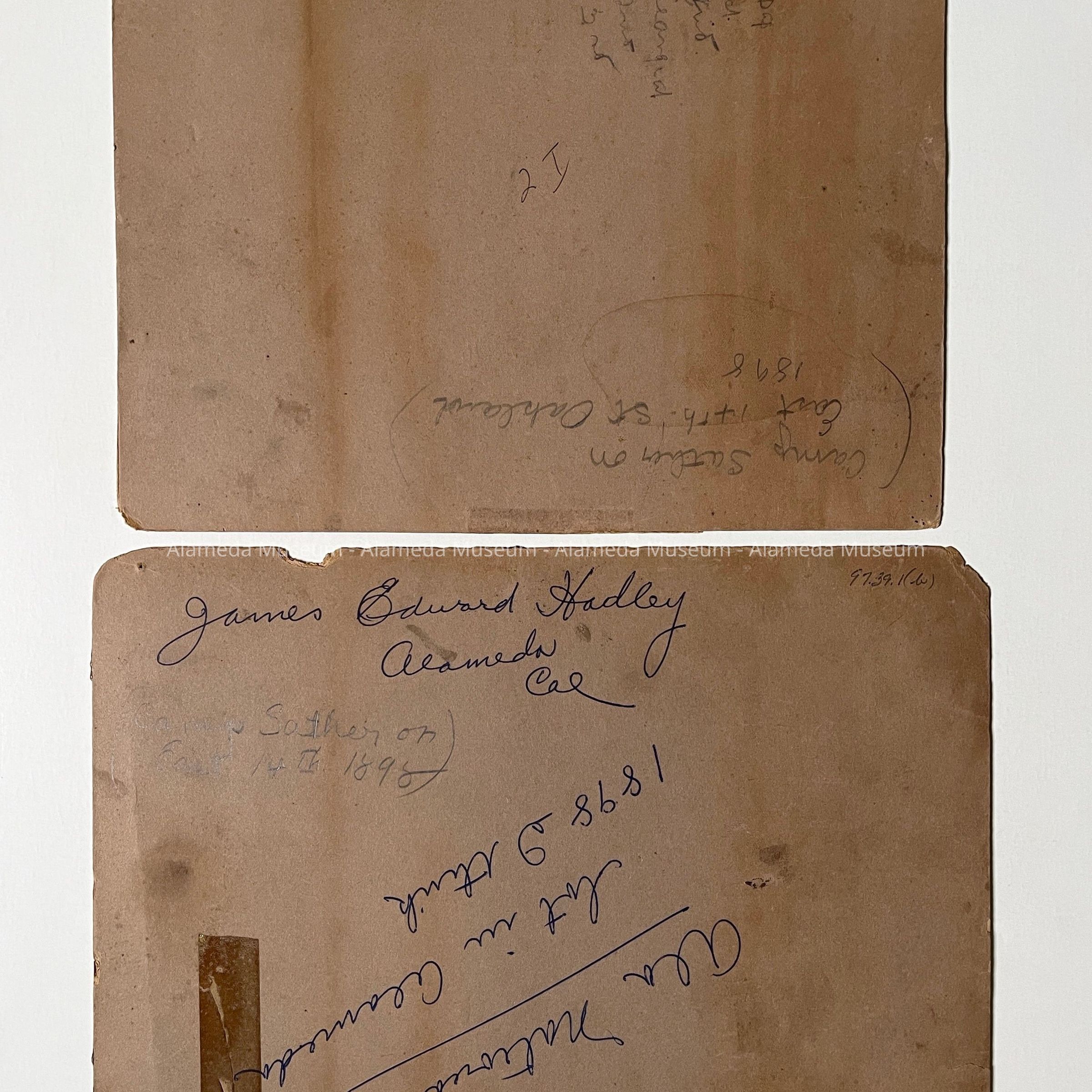 Description: Two sepia-toned albumen print photos, mounted on buff paperboard: Photographer: C. Ball, Alameda (printed in blue on the mounting bottom edge). Donor labels are affixed to the bottom margins.