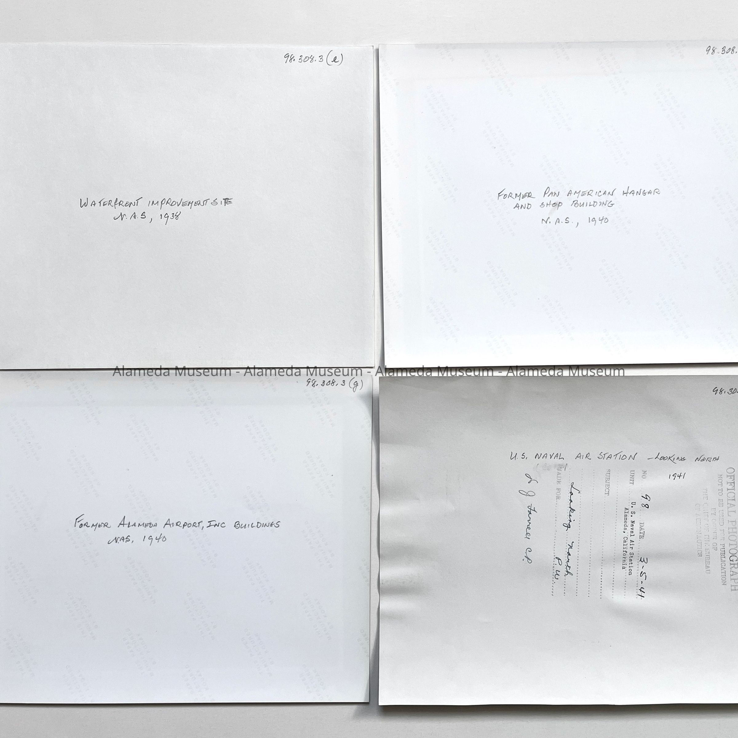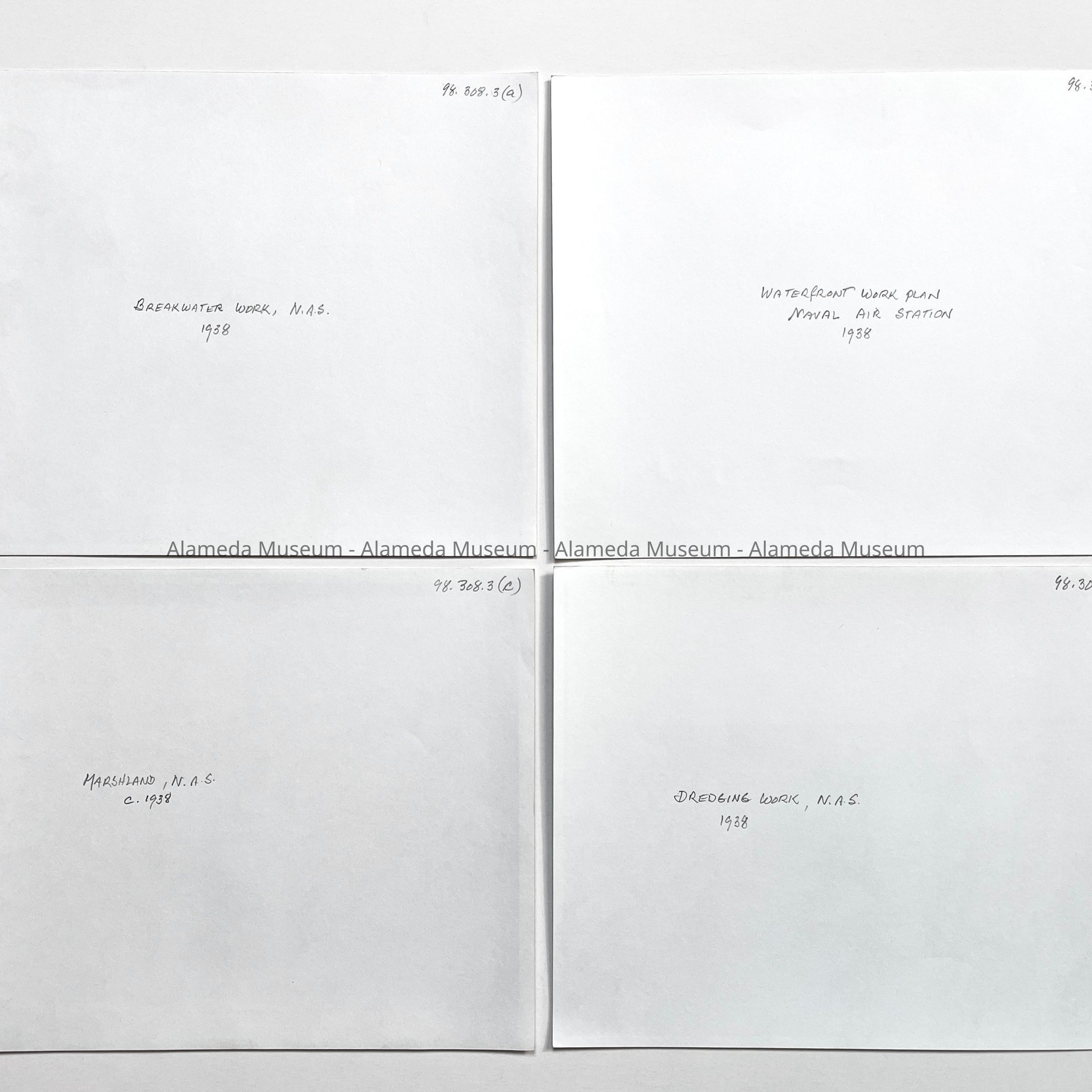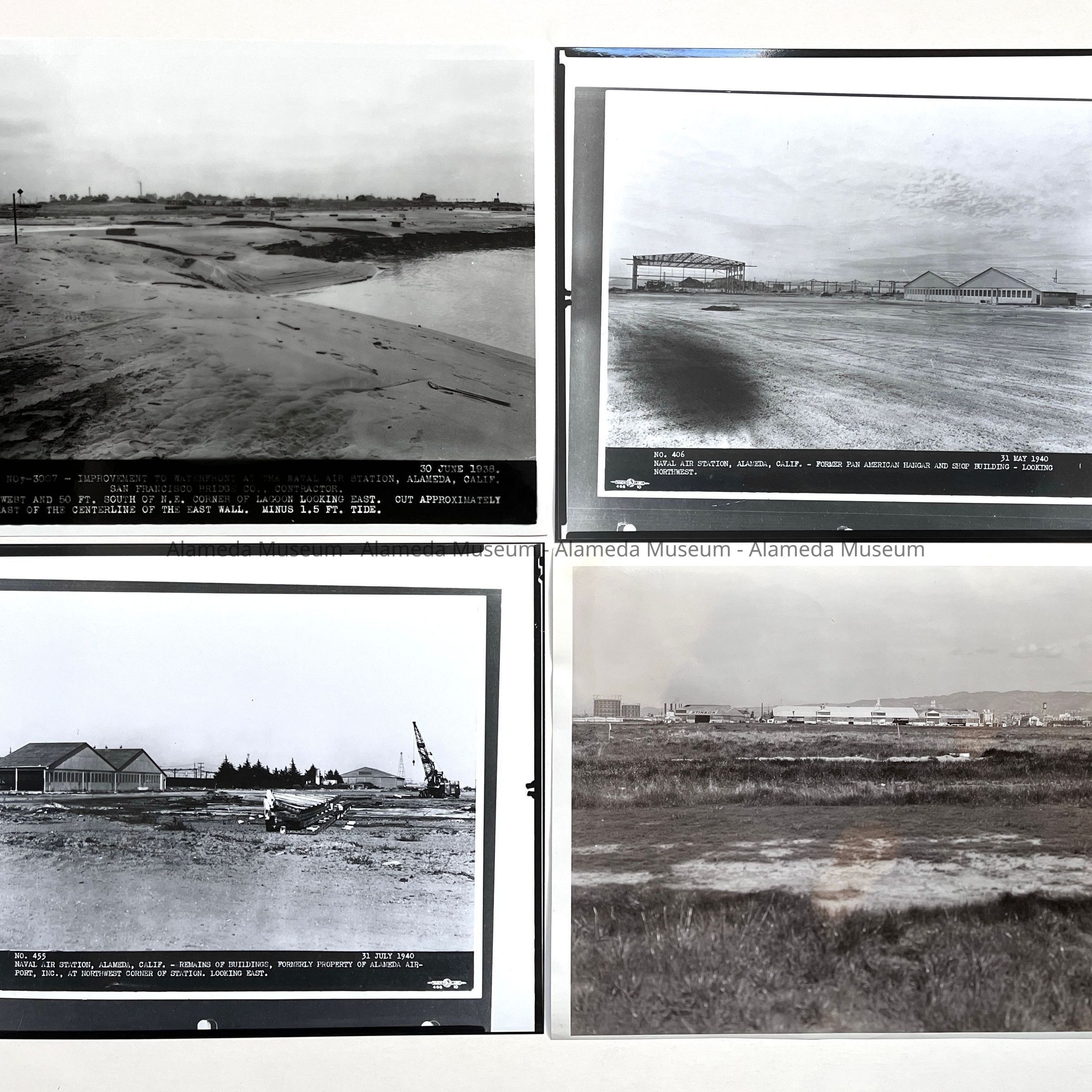 History of Object: Set of photos detailing construction activity occurring at Alameda Point as the Naval Air Station came into being: a) breakwater work; b) waterfront work project: c) marsh land; d) dredging work underway; e) waterfront improvement site; f) former Pan-Am buildings; g) former Alameda Airport, Inc. buildings; h) Naval Air Station, looking North.