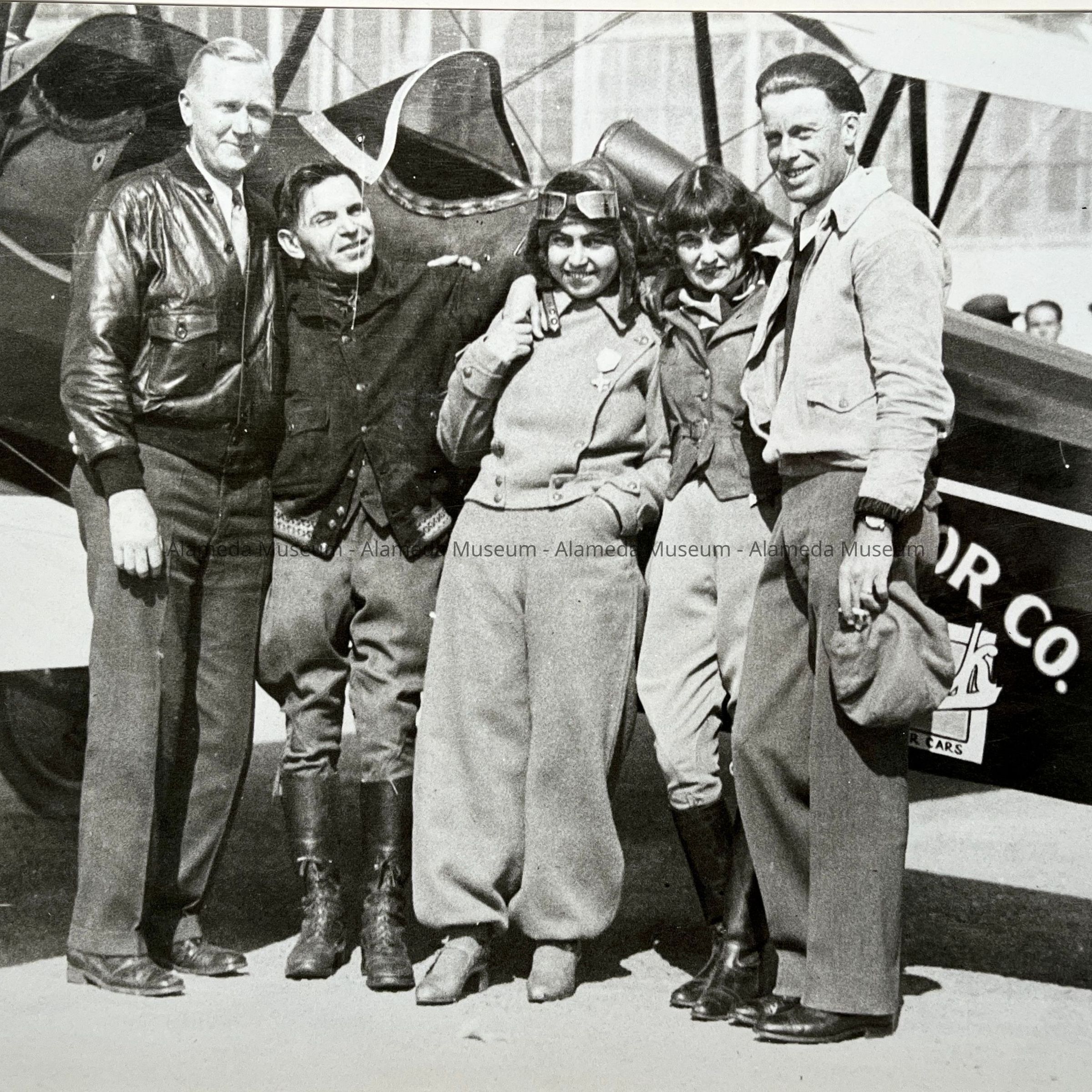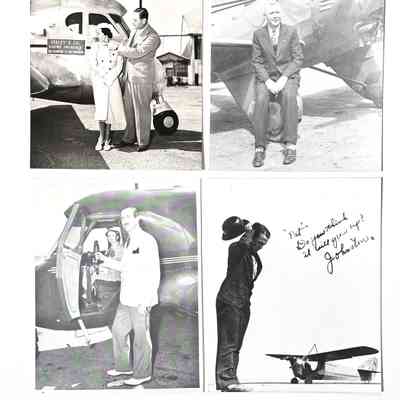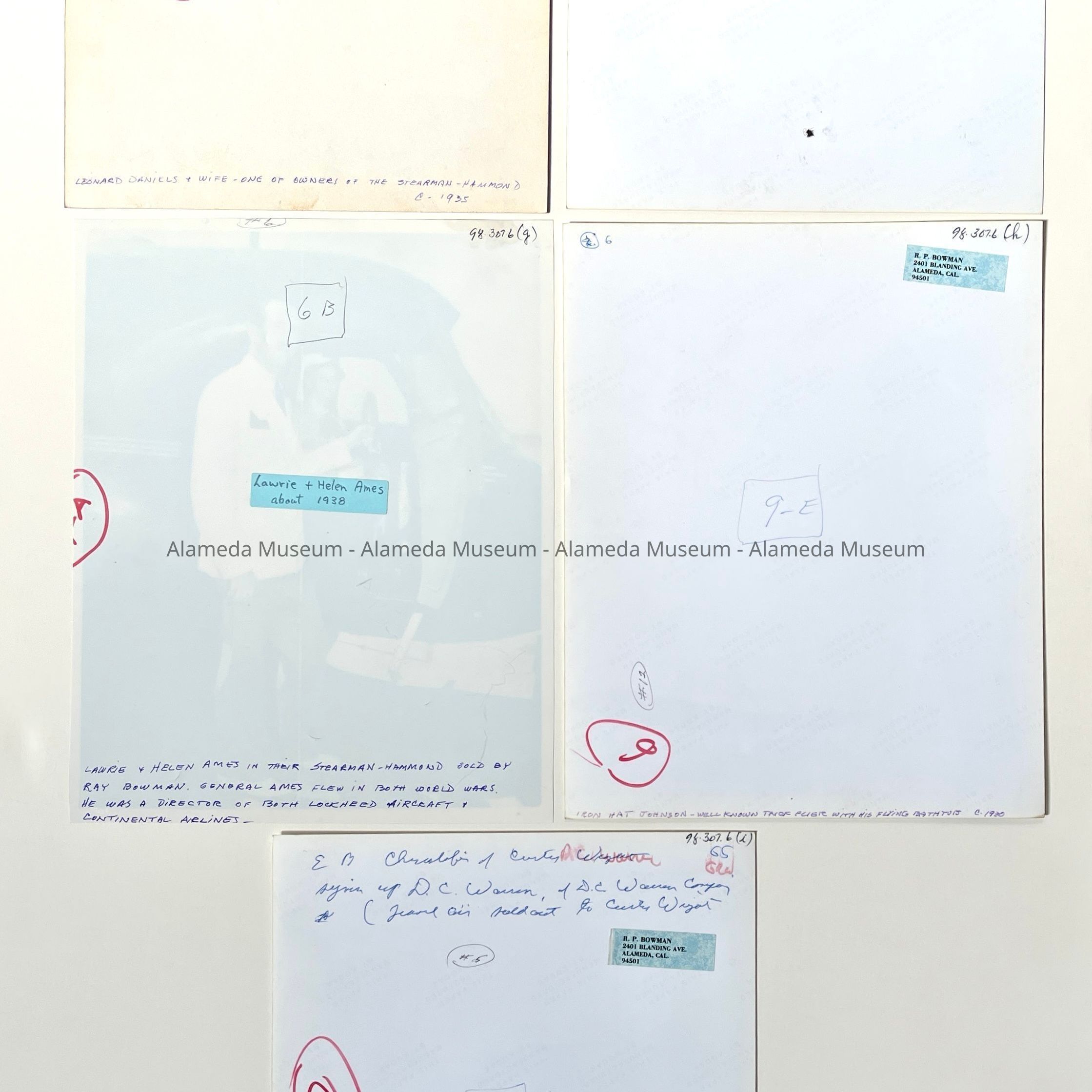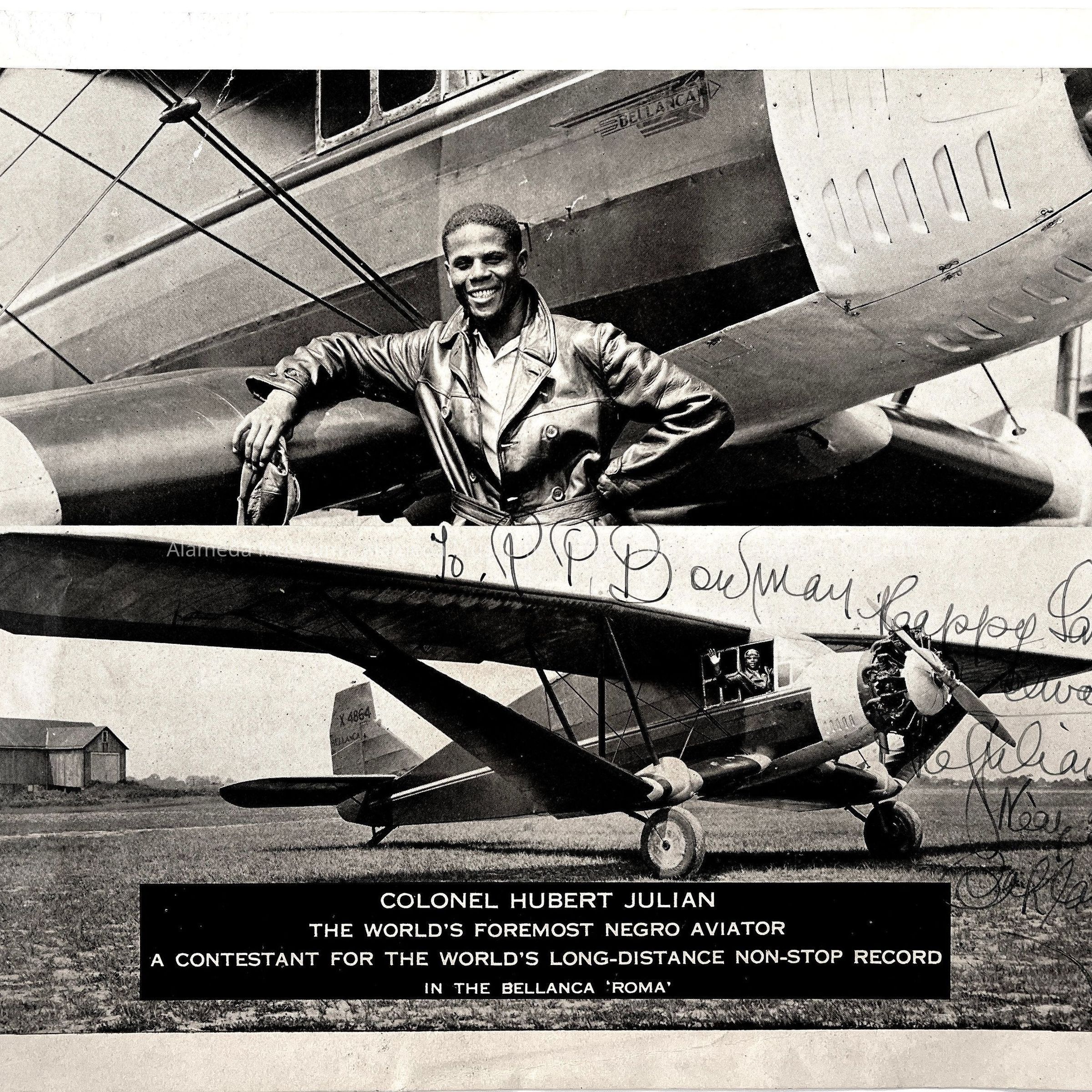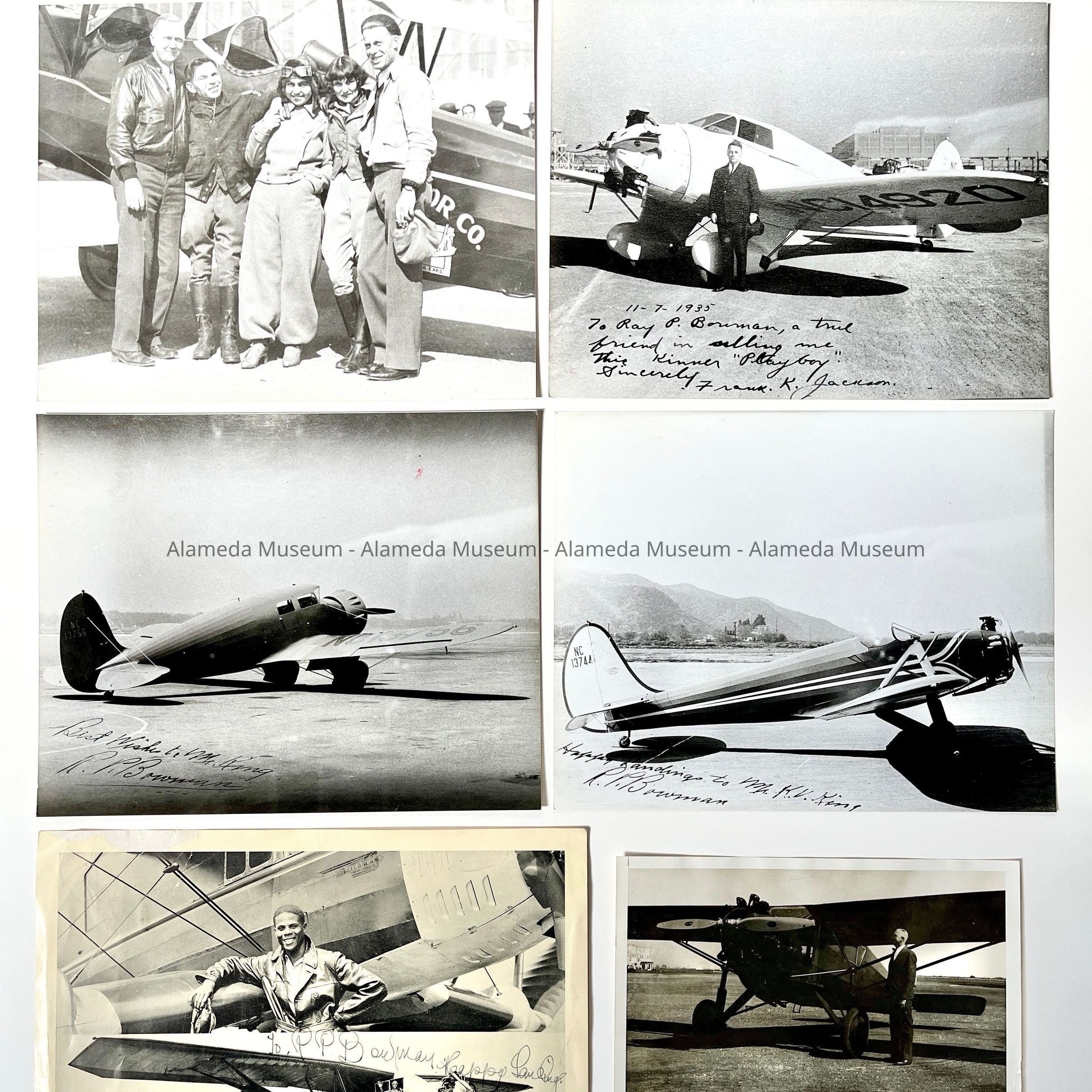 History of Object: Celebrities, businessmen and/or their airplanes with which Ray P. Bowman of the San Francisco Bay Airdrome, Alameda, dealt with as customers and/ or friends: a) Ray Bowman with his secretary, Miss Pat Kendall and others; b) Frank Jackson of Jackson Furniture, Oakland; c) Greg Hills of Hills Bros. Coffee w/his 4-Place Kinner airplane; d) H.V. King of Standard Oil w/his Kinner Sportster; e) Leonard Daniels & wife w/their Stearman-Hammond; f) Ray Bowman; g) Lawrie & Helen Ames w/their Stearman-Hammond; h): "Iron-Hat" Johnson, stunt flier; i) D.C. Warren & E.B. Christopher of the Curtis-Wright dealership; j) Ray Bowman w/ Curtis "Challenger"; k) Col Hubert Julian, "the World's Foremost Negro Aviator", autographed in ink.