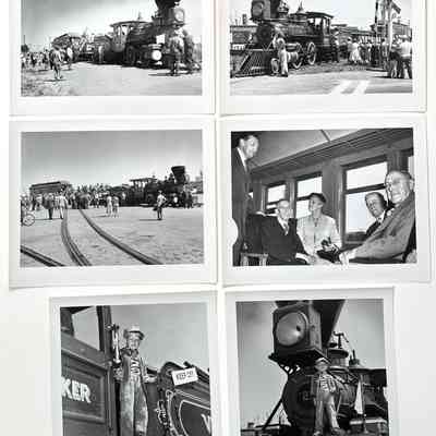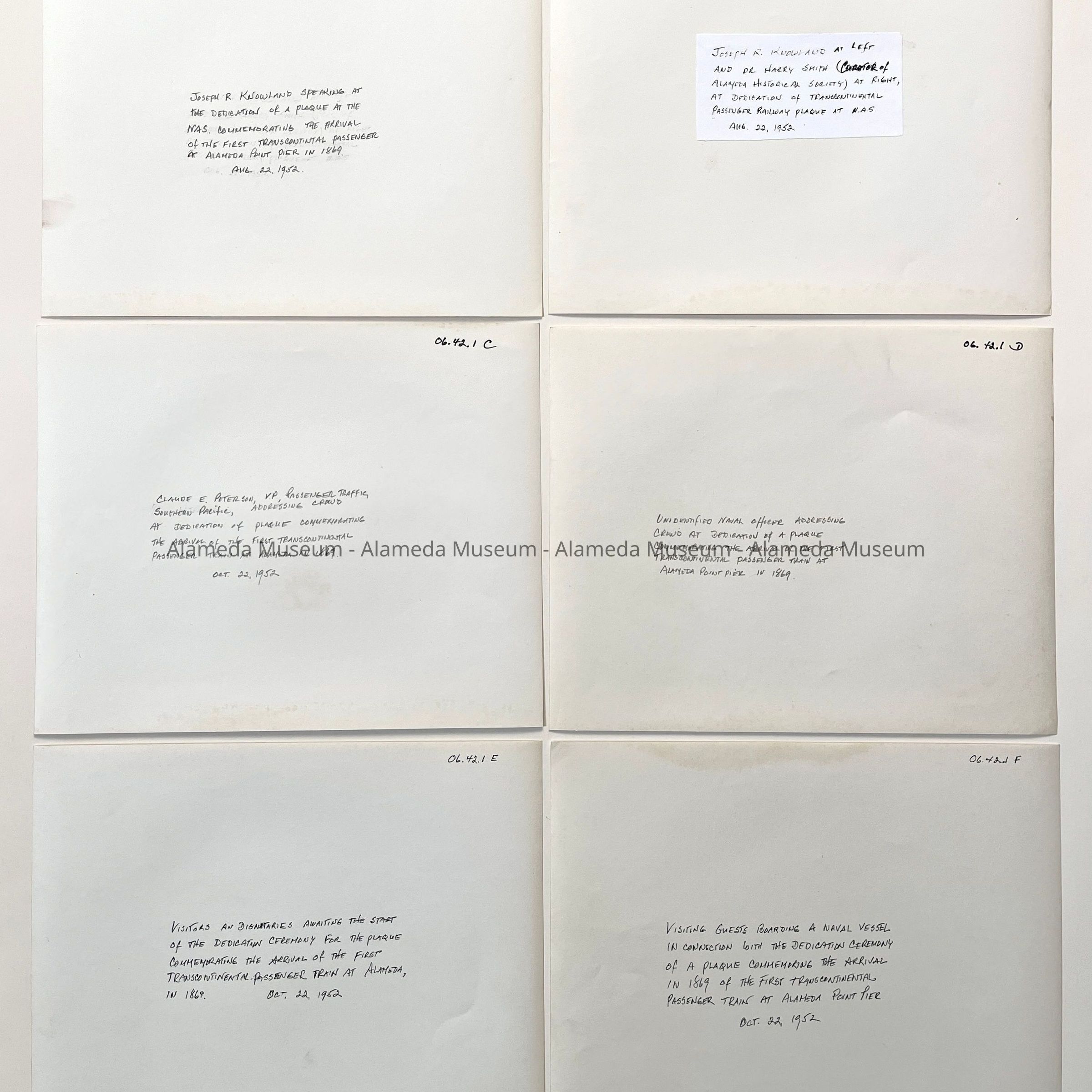 History of Object: A series of images taken at the dedication of a plaque on Oct. 22, 1952, at the Alameda Naval Air Station commemorating the arrival of the first transcontinental passenger train at Alameda Point pier on February 6, 1869: A) Sen. Joseph R. Knowland addressing the crowd; B) Sen. Knowland and Dr. Harry Smith (the Alameda Museum curator); C) Mr. Claude E. Peterson, Southern Pacific VP addressing the gathering; D) Unidentified Naval officer addressing the crowd; E) Visitors and dignitaries seated, awaiting the start of the ceremony; F) Visitors boarding a Naval vessel; G) Antique steam locomotive and passenger car on view at the ceremony; H-I) The steam locomotive, other views; J) Distinguished guests seated in the antique passenger car; K-L) Young boy standing atop the antique steam locomotive.
