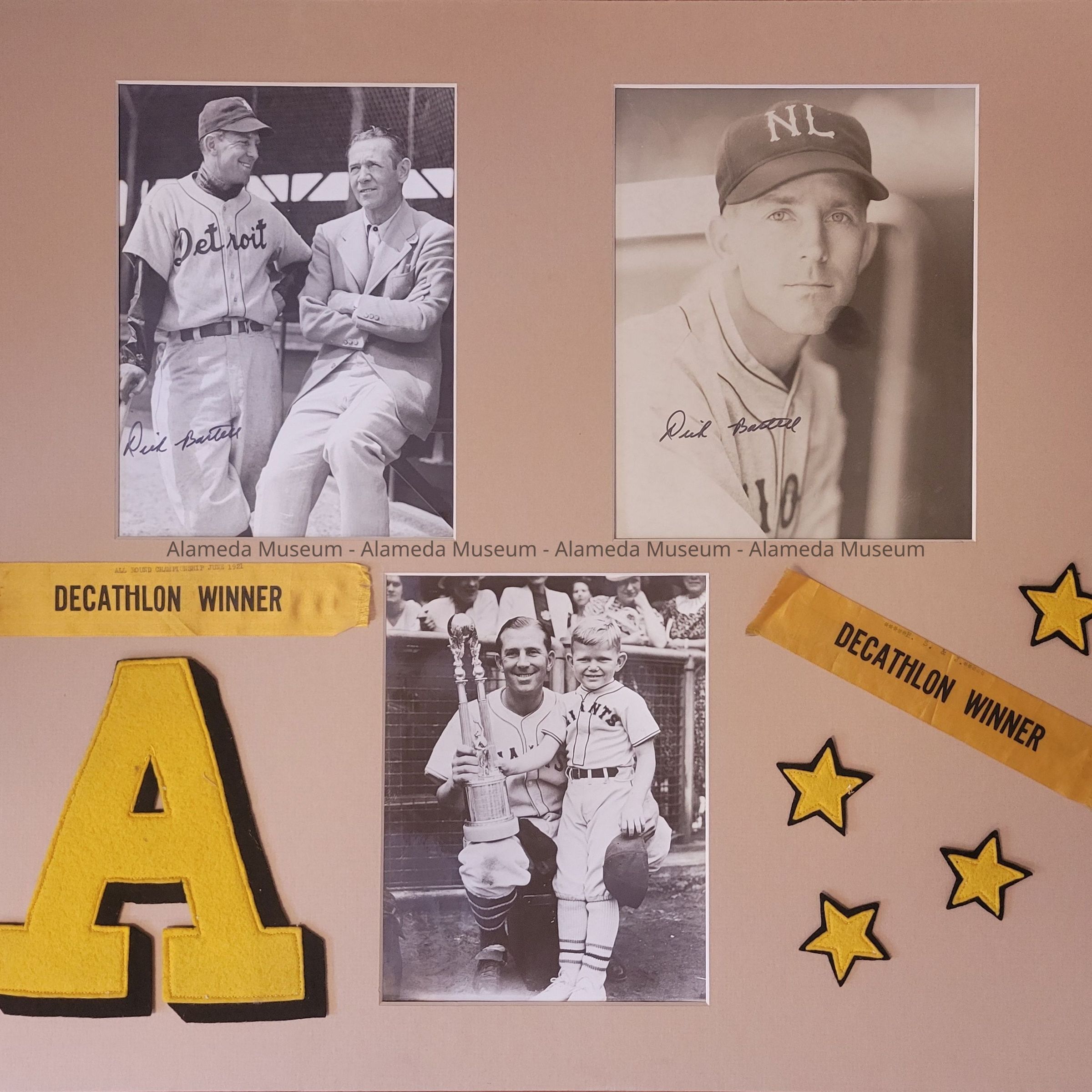 Description: Three photos are mounted along with an Alameda High School Block A and two decathlon ribbons. Both say "decathlon winner." One is dated 1921. The photos are numbered on their backs with descriptions.