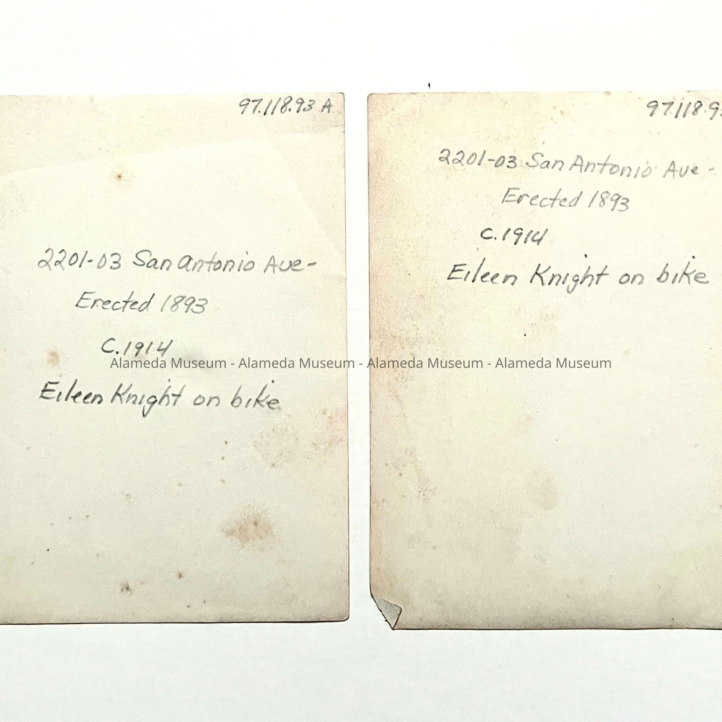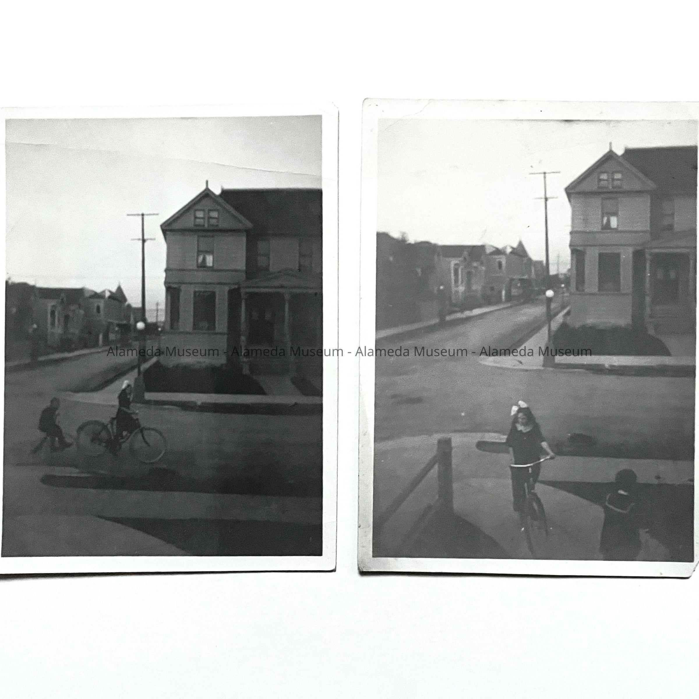 TWO PHOTOGRAPHS OF EILEEN KNIGHT ON A BICYCLE. IN THE BACKGROUND 2201-2203 SAN ANTONIO AVENUE, ALAMEDA (ERECTED IN 1893) CAN BE SEEN.