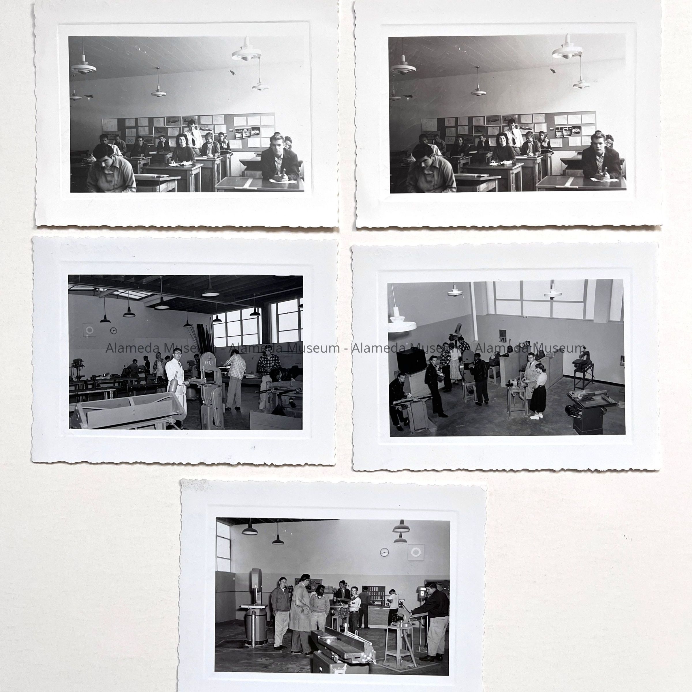 History of Object: Various vocational arts class scenes: (A-B) mechanical drawing; (C) metal shop; (D) craft shop; (E) wood shop.