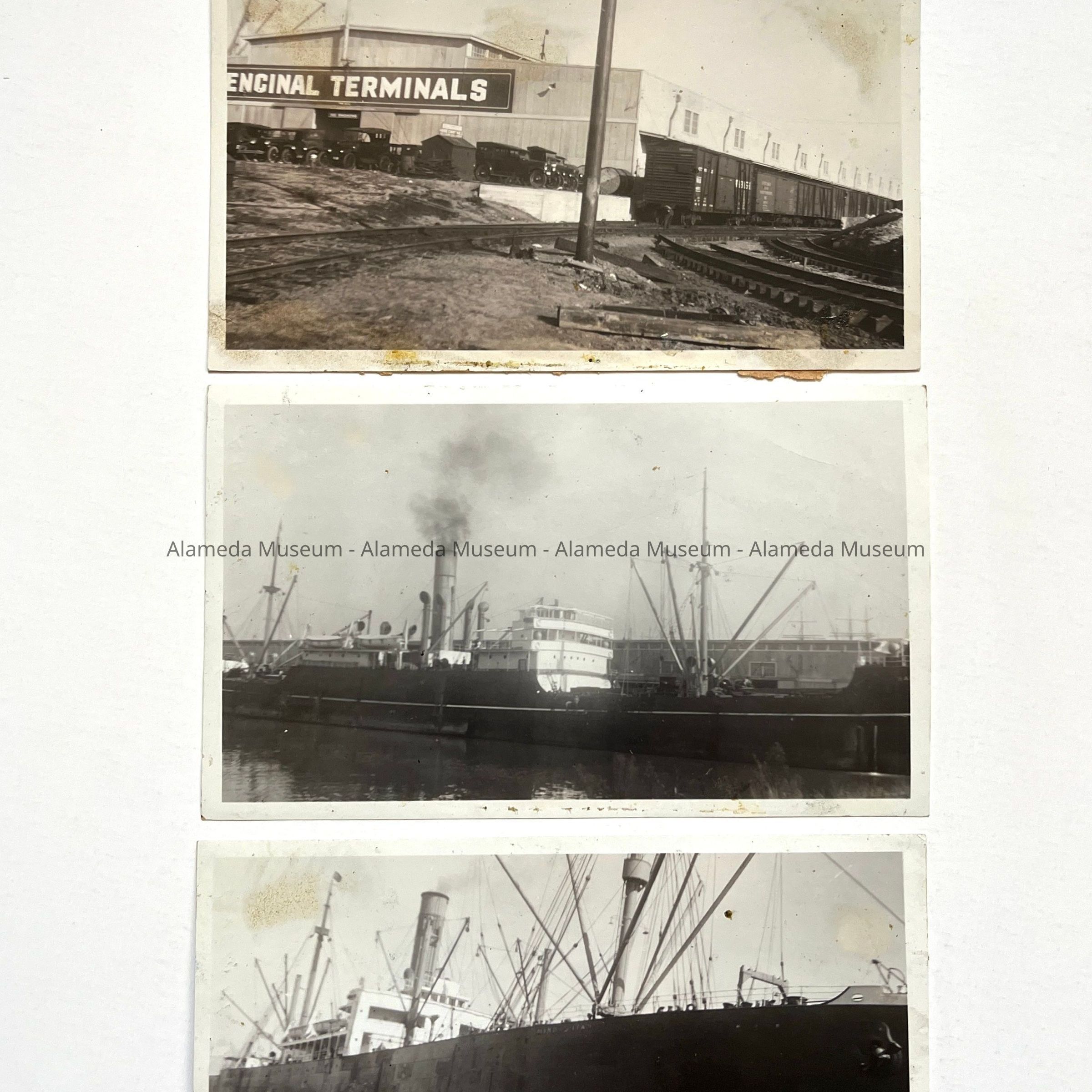 History of Object: Views of activity at the Encinal Terminals: a)front entrance, showing parked cars and the adjacent Belt Line Railroad; b) a cargo ship docked beside the Terminals; c) close-up of this cargo ship.