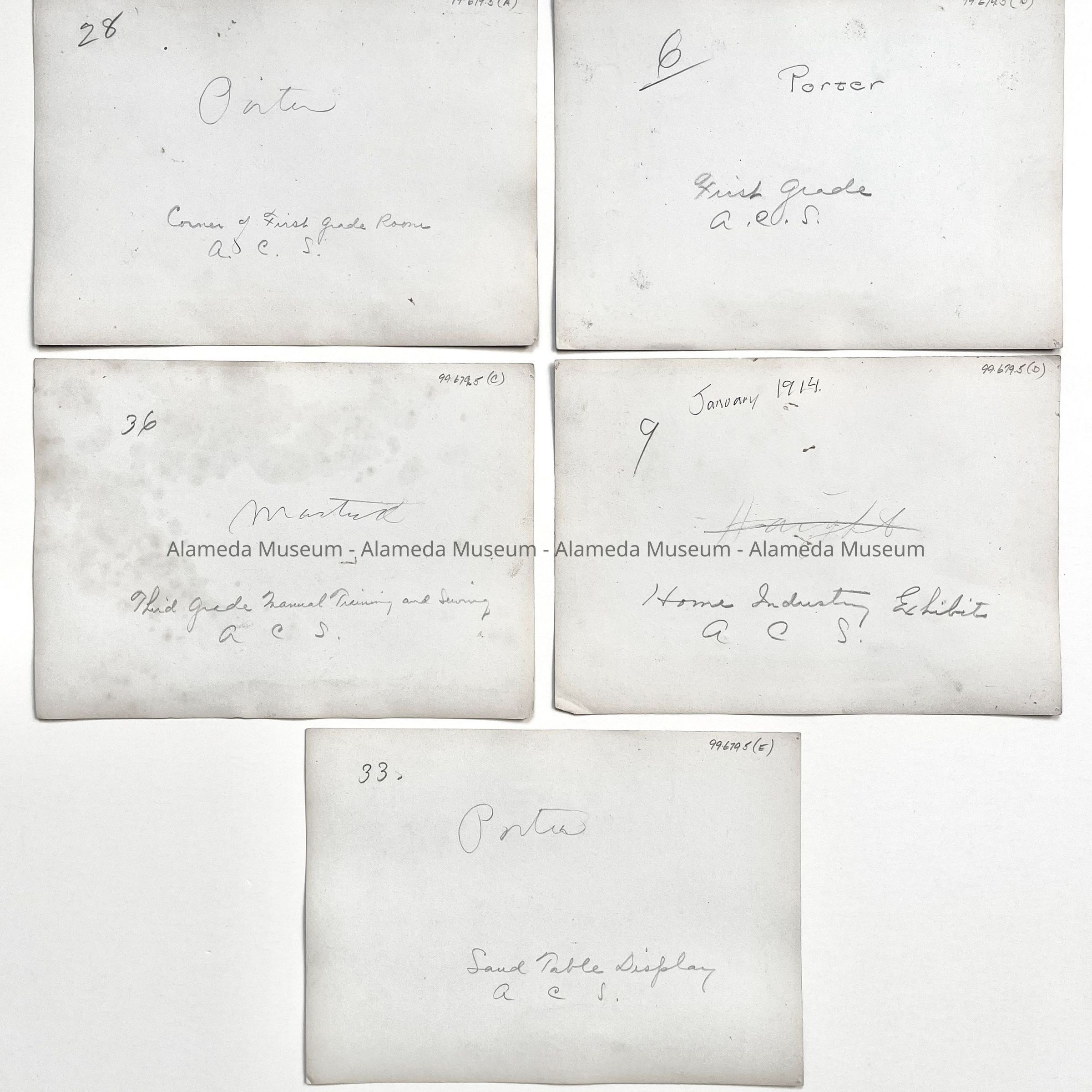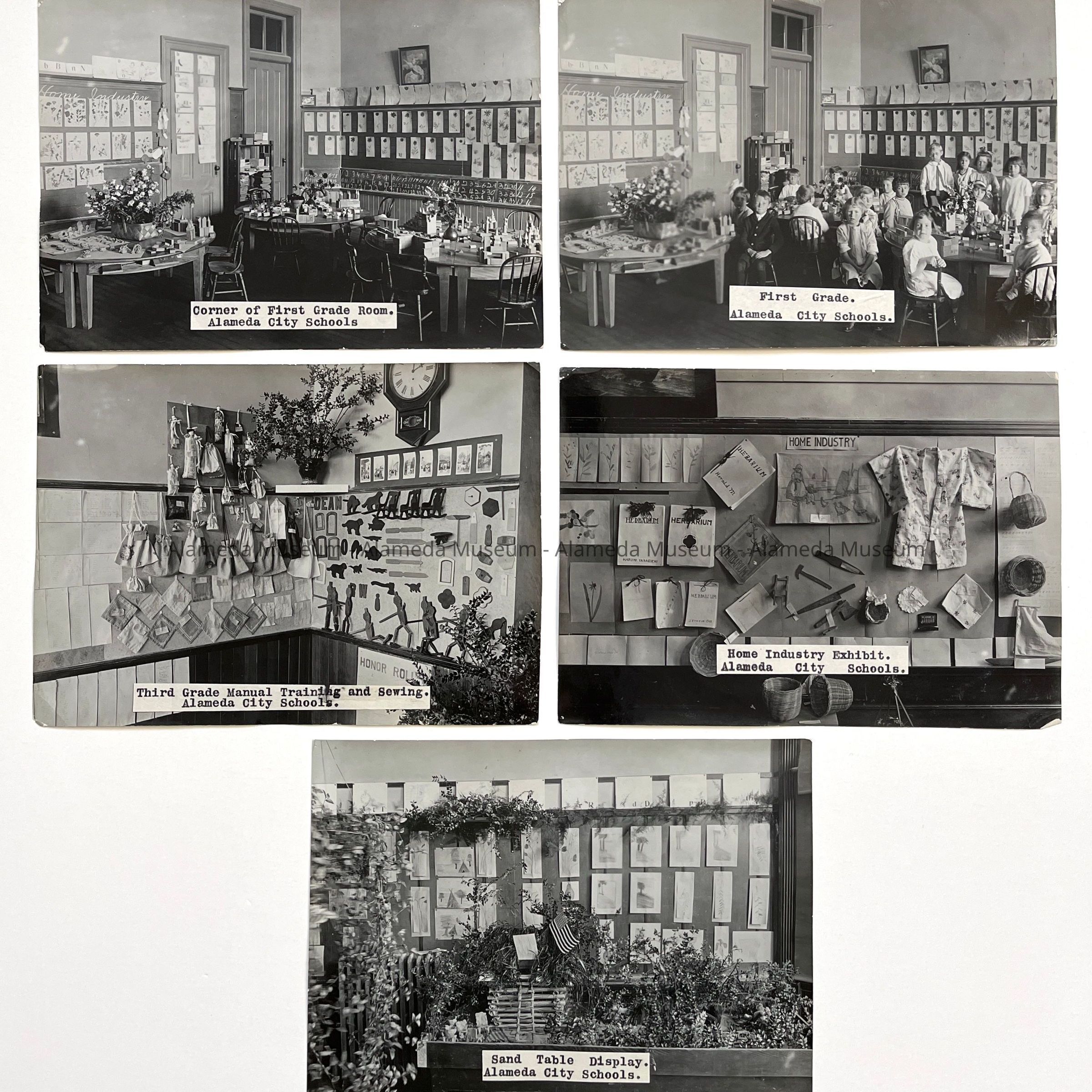 A) Corner of First Grade Room Porter School; B) Same room with students present; C) Third Grade manual training and sewing display; D) Home industry exhibit, Haight School; E) Sand table display, Porter School.