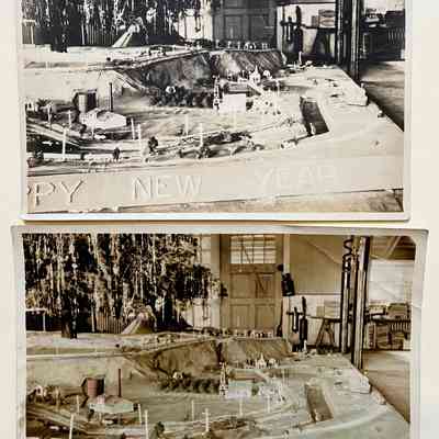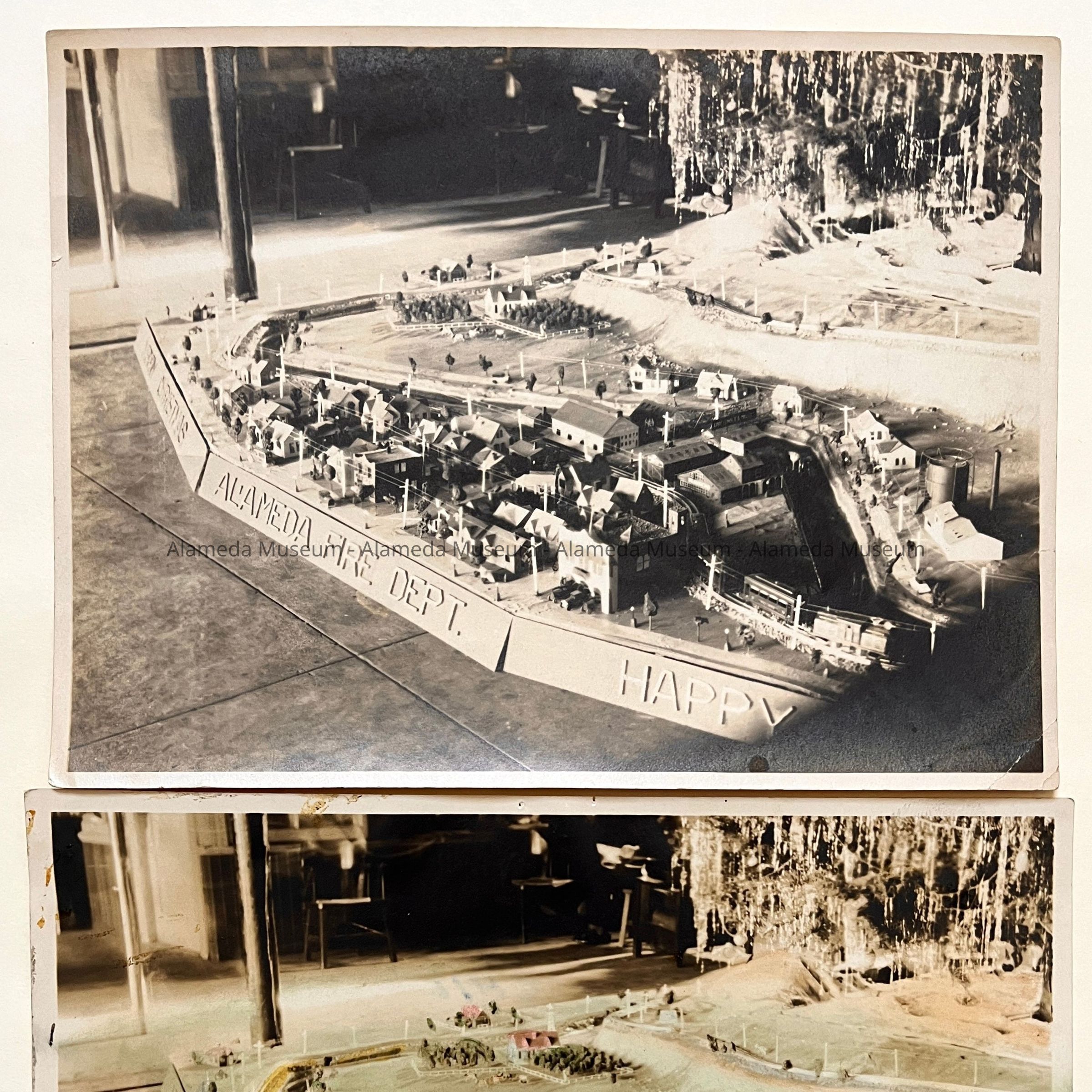 History of Object: Various scenes connected with a fire station Christmas tree display: (a): electric train passing through a miniature village; (b) same scene, tinted; (c) view of the train, tinted; (d) full view of the tree; (e) another view of the electric train set-up; (f) same scene, tinted; (g) same scene as #d, tinted.