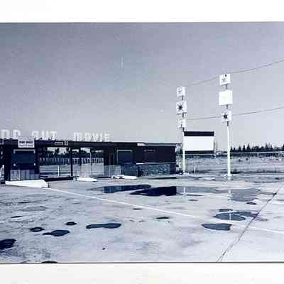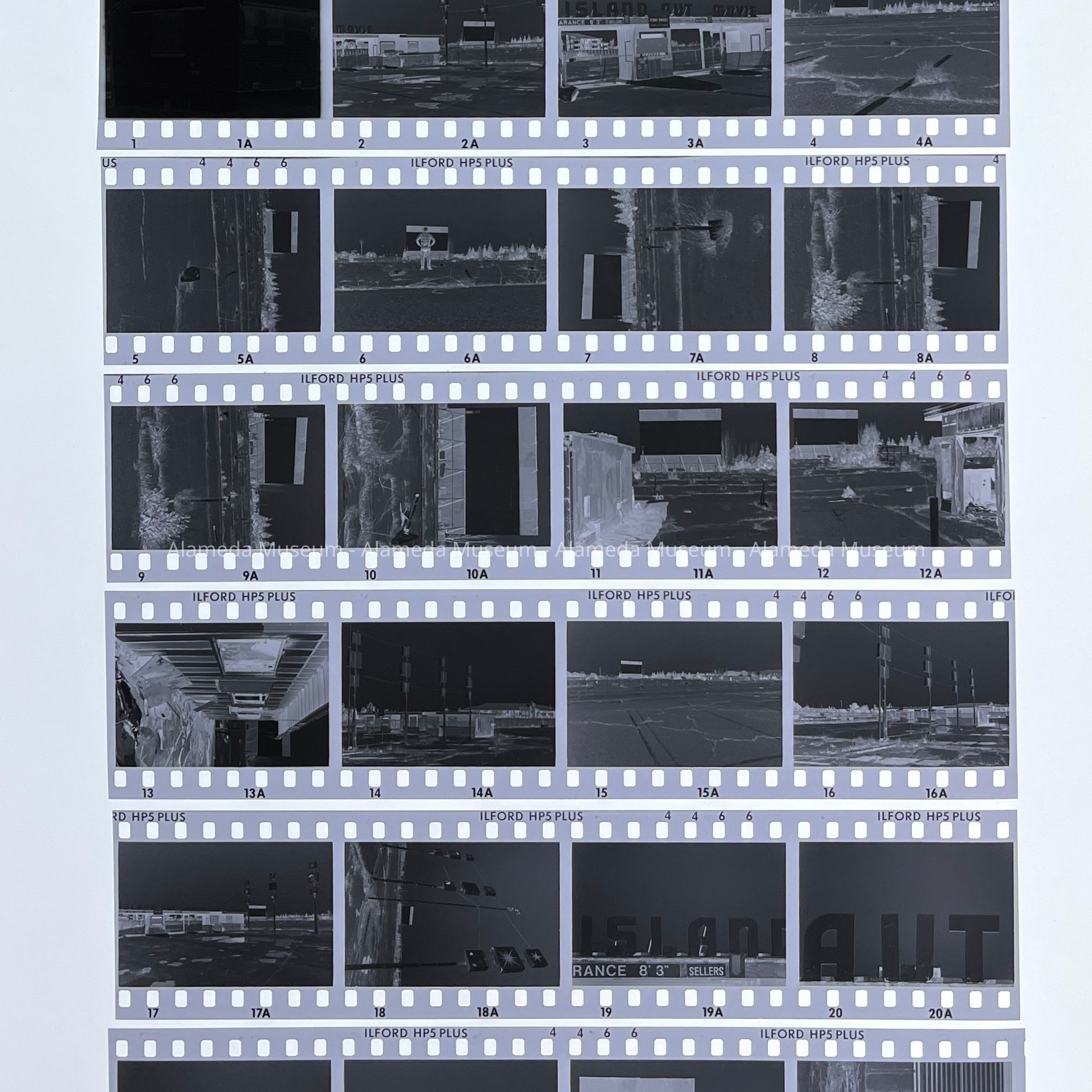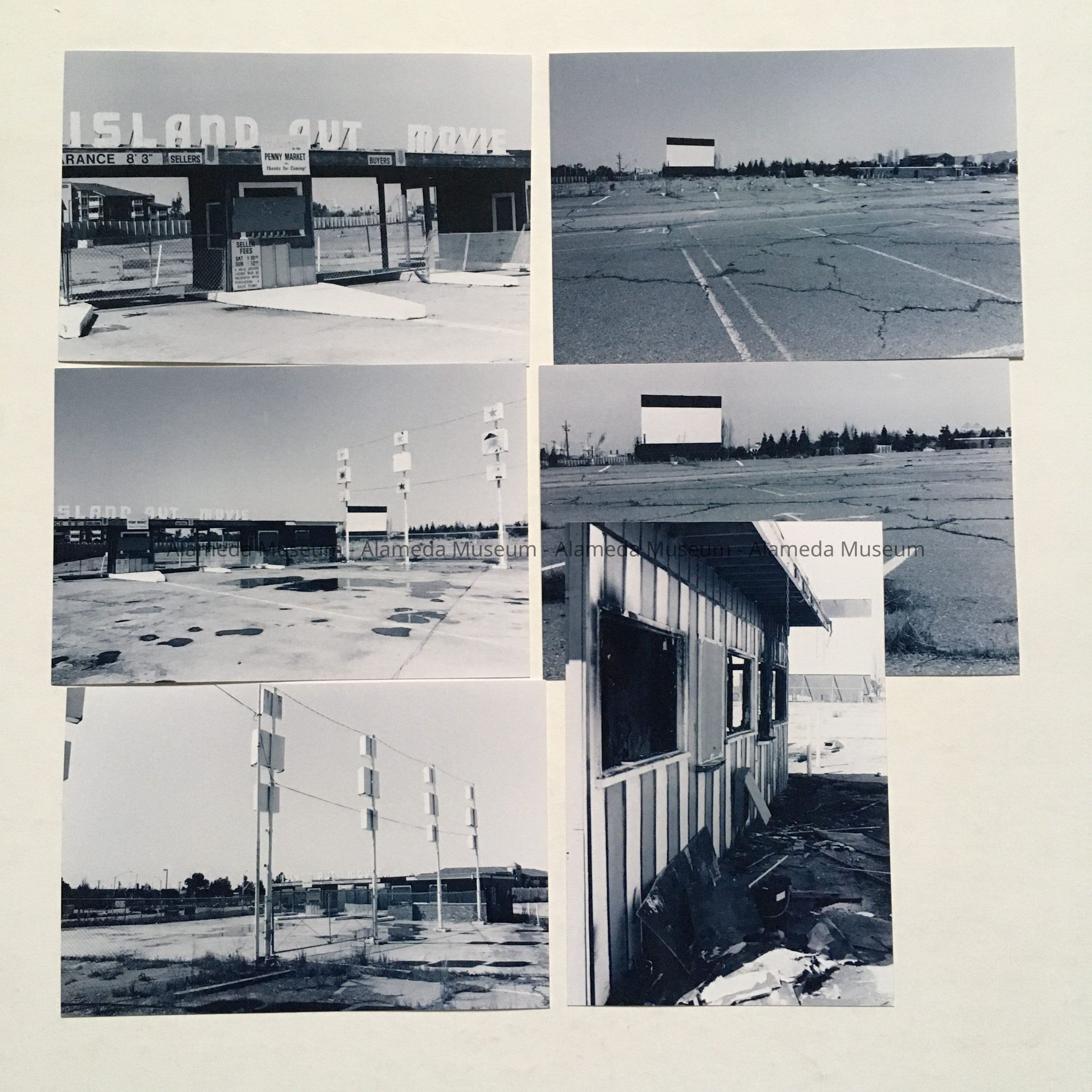 Description: 6 black-and-white photographs of a derelict drive-in theater, signage stating ’Island Aut Drive’.
