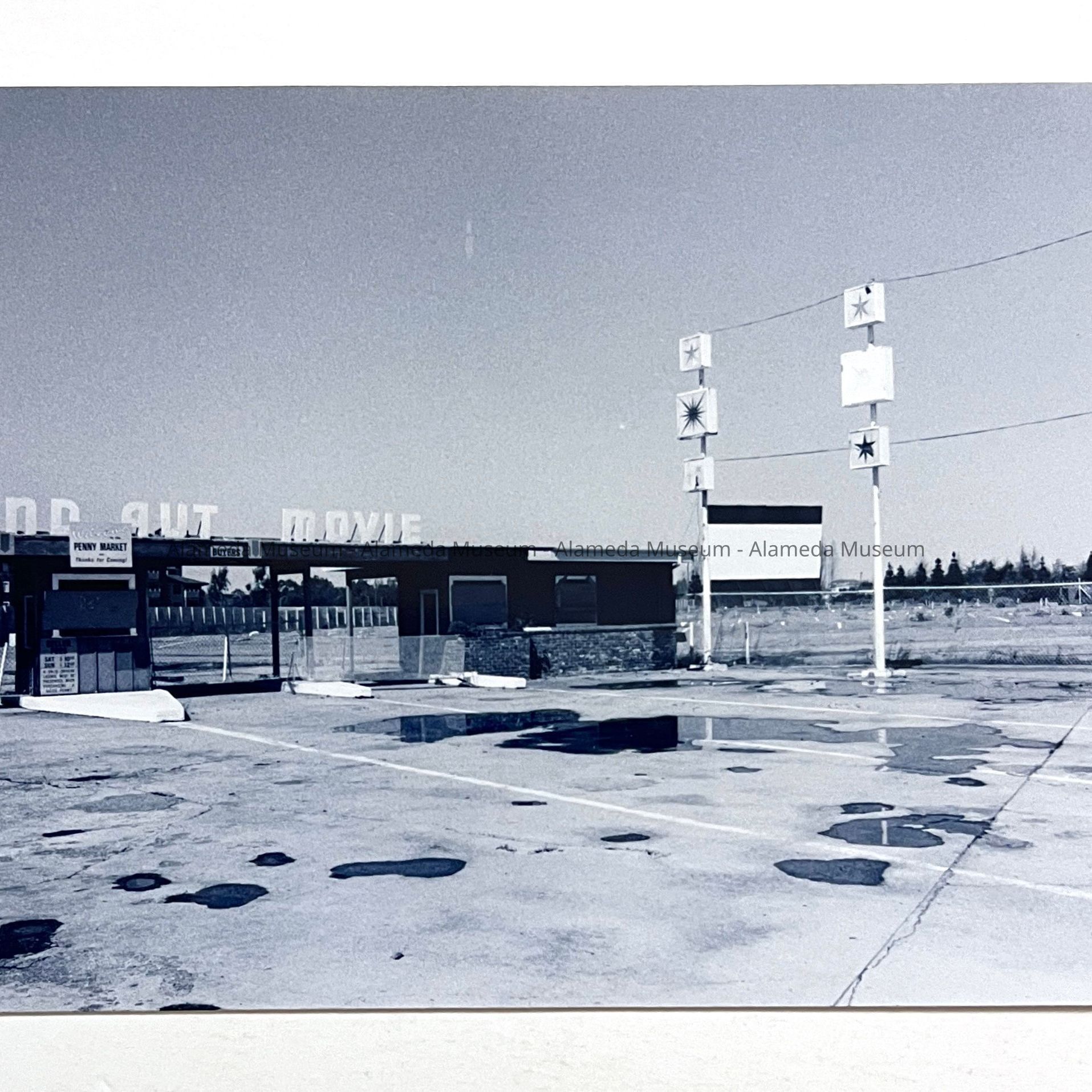 History of Object: photos of the Island Auto Movie Theater, Thau Way, before being demolished for housing. The ‘o’ has already disappeared, buildings are falling apart, weeds are growing in cracks in the concrete. The entrance gates have signage for the weekend Penny market that was operating here after the theater closed. The screen was damaged in 1981 and repaired, although never used again.