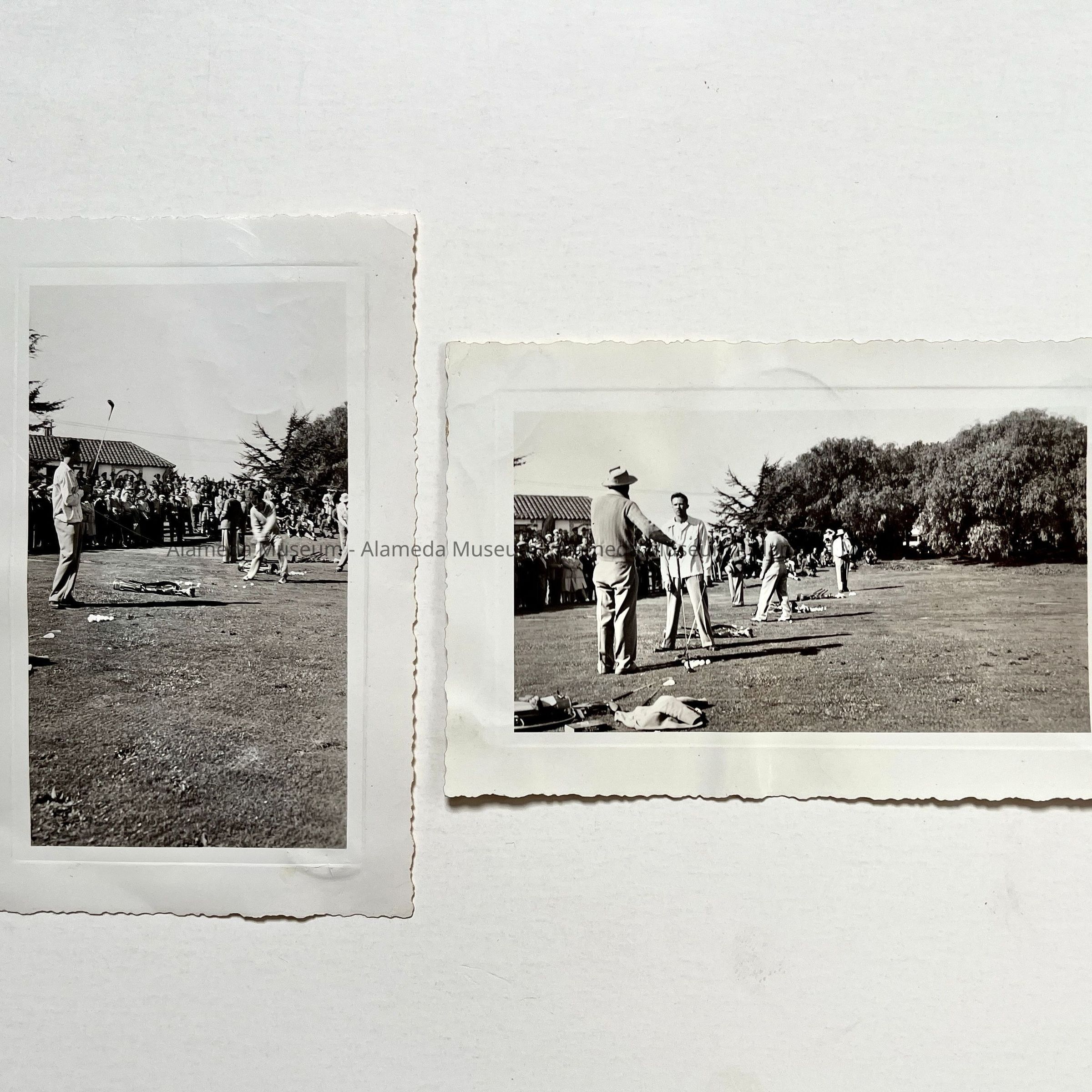 PHOTOGRAPHS OF UNIDENTIFIED GOLFERS AT THE ALAMEDA MUNICIPAL GOLF COURSE. THE CLUBHOUSE CAN BE SEEN IN THE BACKGROUND.