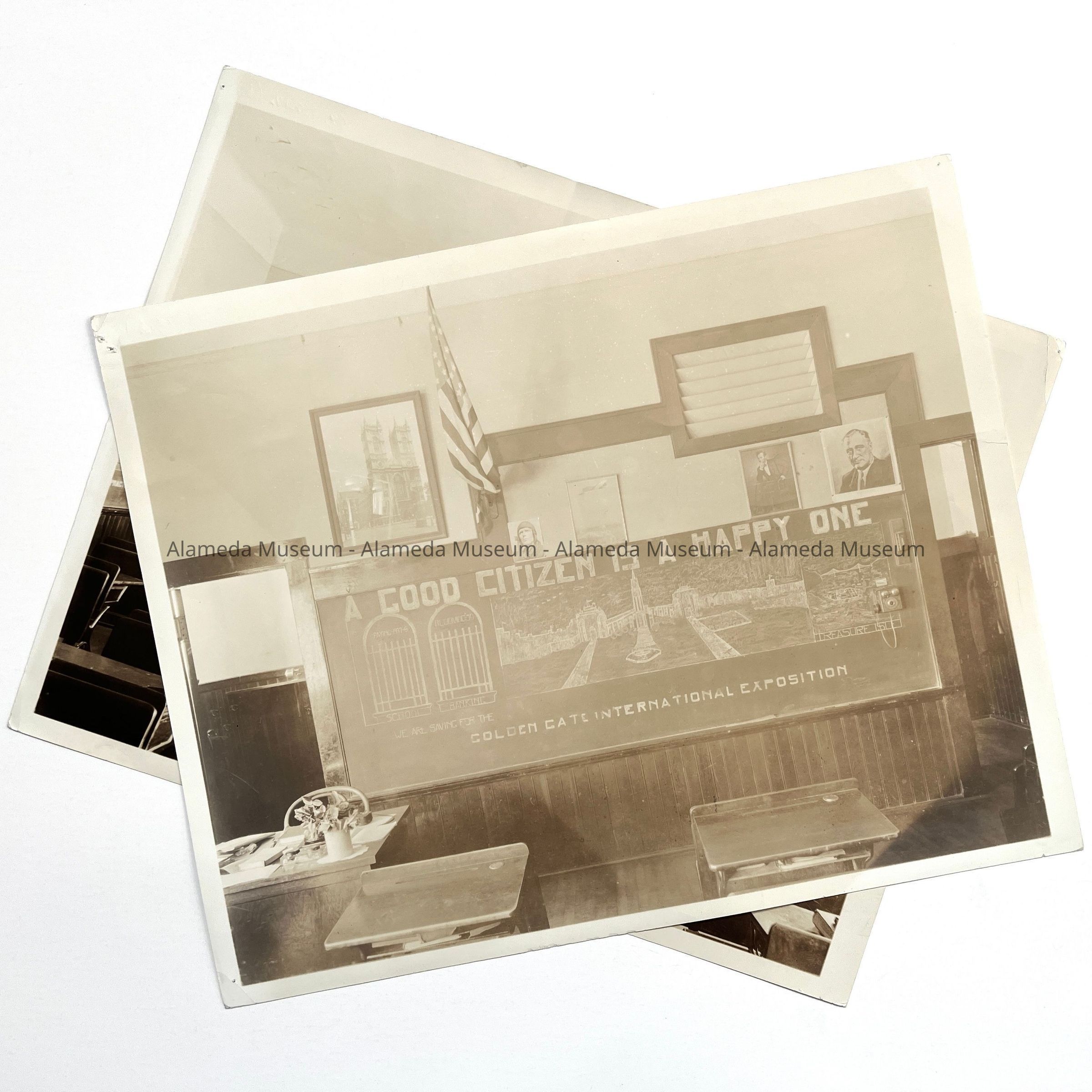 History of Object: Interior classroom views: #a - blackboard with chalk illustration dealing with the Golden Gate International Exposition; #b - another blackboard scene dealing with the Exposition.