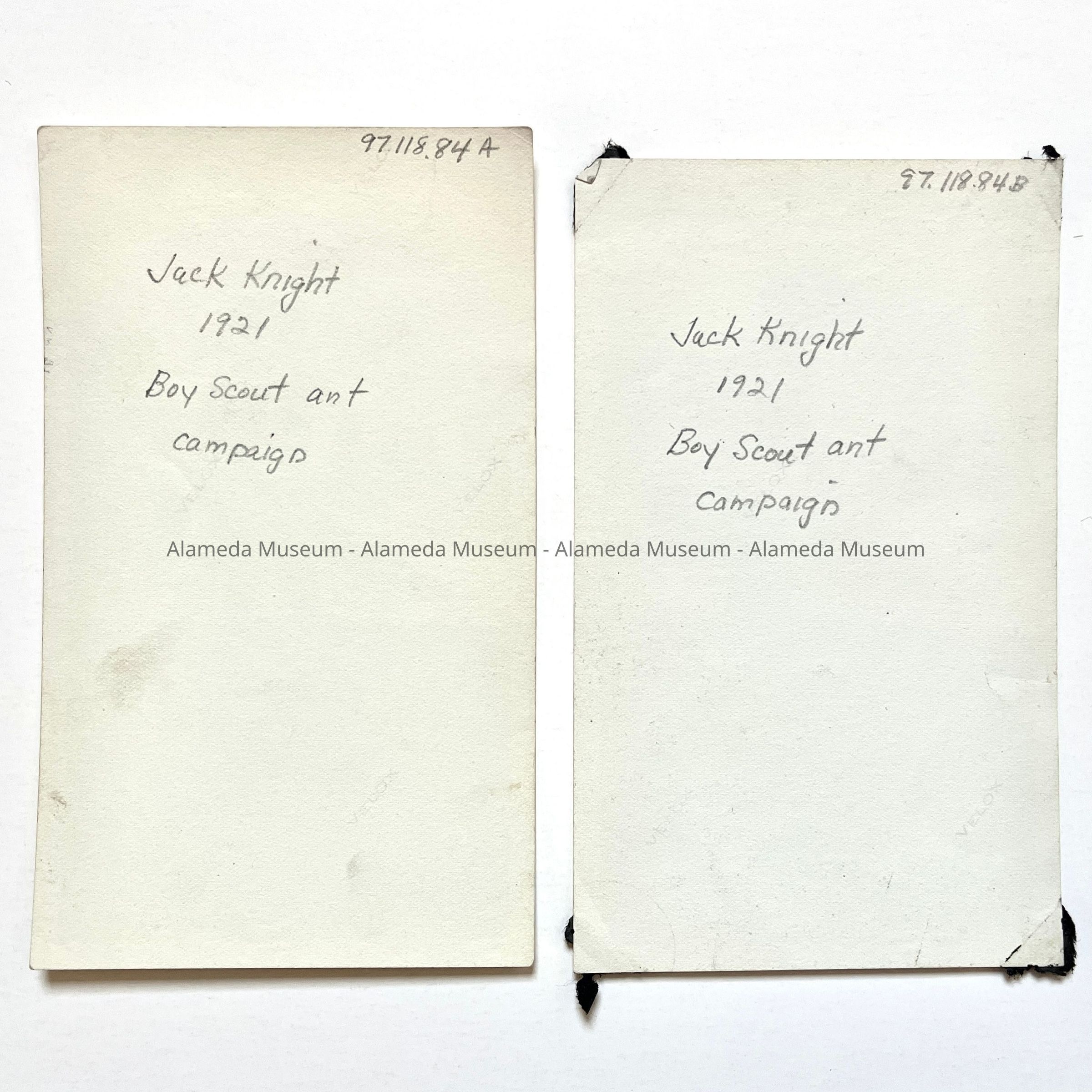 TWO PHOTOGRAPHIC POSES OF JACK KNIGHT IN HIS BOY SCOUTS UNIFORM, AS PART OF THE "ANT CAMPAIGN" OF 1921. THE ALAMEDA BOY SCOUTS ERADICATED AN INFESTATION OF RED ANTS IN ALAMEDA, CALIFORNIA.