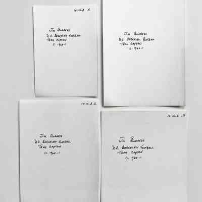 History of Object: All images portray Jim Burress in his UC Berkeley football uniform as team captain in various publicity poses: image "A" is a half-figure portrait; image "B" shows him posing alongside a large "C" letter; image "C" shows him with "Oskie", the Cal Bear figure mascot; image "D" portrays with six admiring young boys, one of whom is soliciting an autograph.
