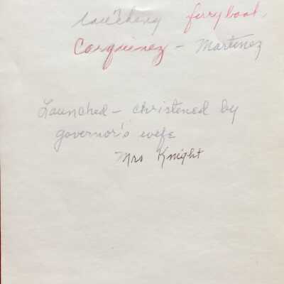 Photos taken of the launching on 9/27/1956 of the ferryboat Carquinez, built by PACECO, for the Benicia-Martinez ferry service. The ferry was christened by Mrs. Knight, wife of the governor at the time.