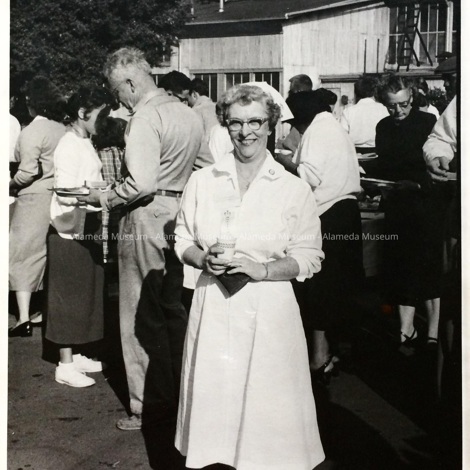 a: PACECO’s industrial nurse Madeline Martin in uniform on a sunny day, holding a drink, with people around a makeshift buffet behind her.