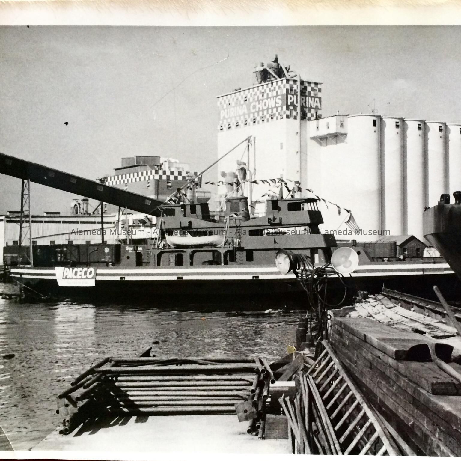 b: a picture of a ferryboat in water, with PACECO sign. Lumber and ladders in foreground, PURINA CHOWS silos, on the Oakland side of the estuary, visible behind.