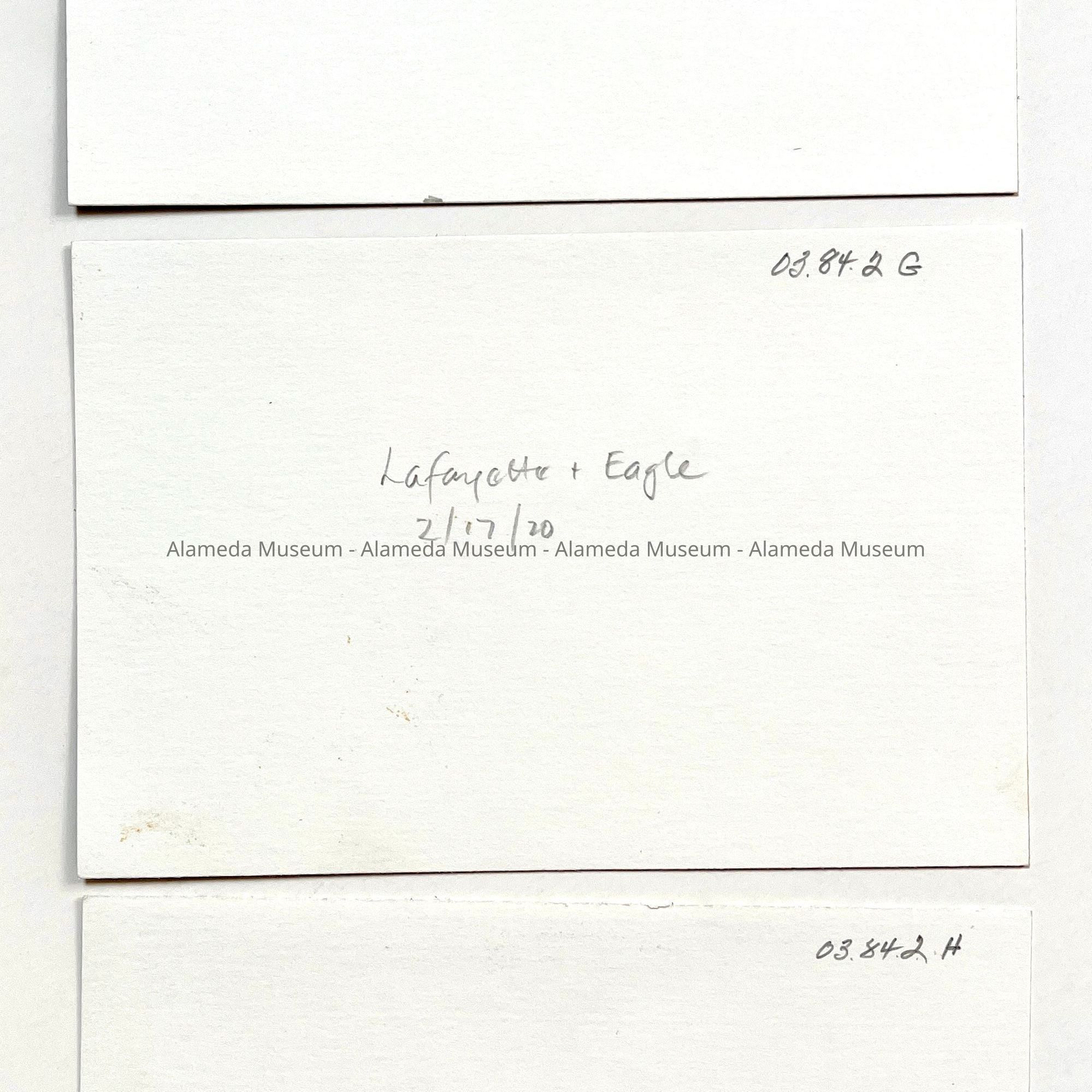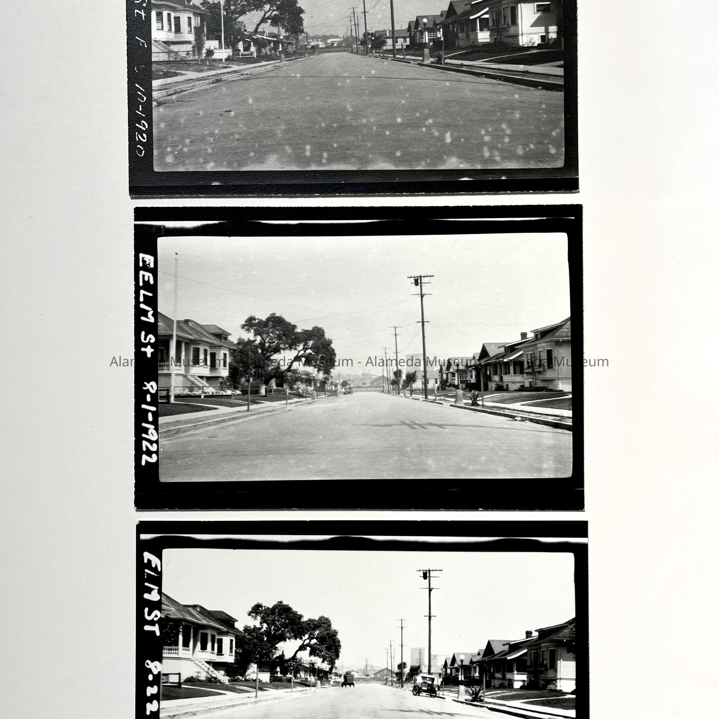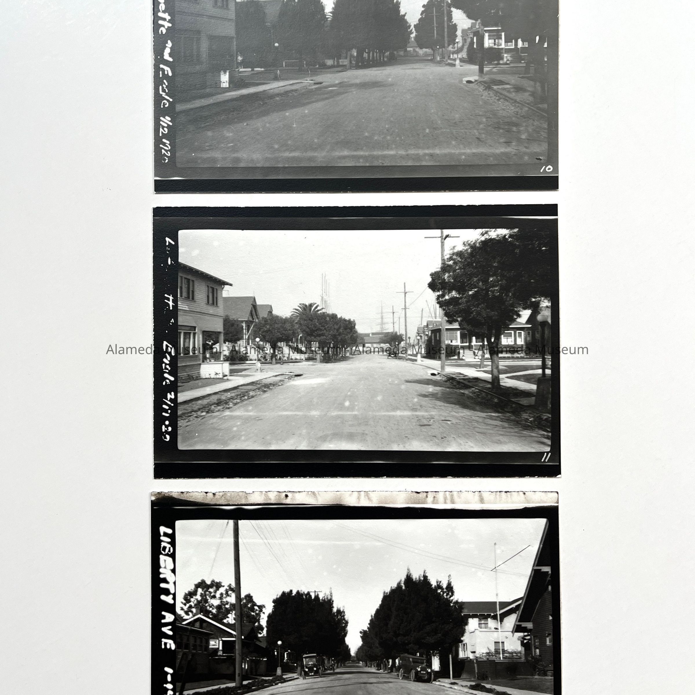 History of Object: Views of Alameda residential streets taken in connection with city maintenance projects: A-B) Clinton Ave.; C-E) Elm St.; F-G) Lafayette St, at Eagle Ave.; H) Liberty Ave. (looking West from Fernside Blvd.).