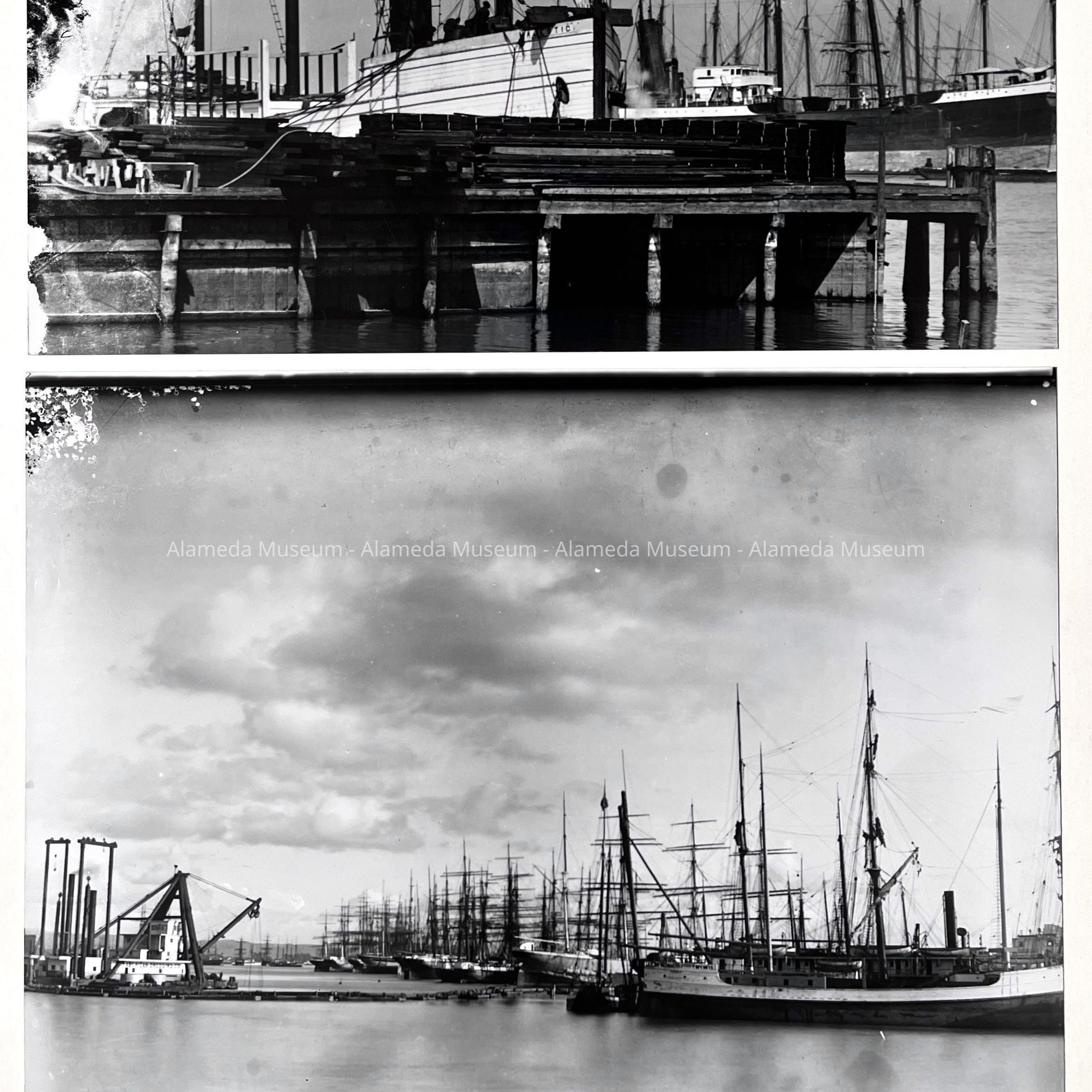 History of Object: Two maritime scenes: #a - the cargo ship "Majestic" at dock in the Oakland-Alameda Estuary; #b - fleet of ships at dock on the Alameda shore of the Estuary, near the Alice Street bridge (present day site of the Posey Tube).