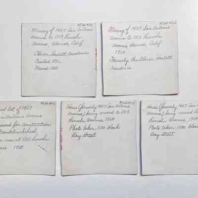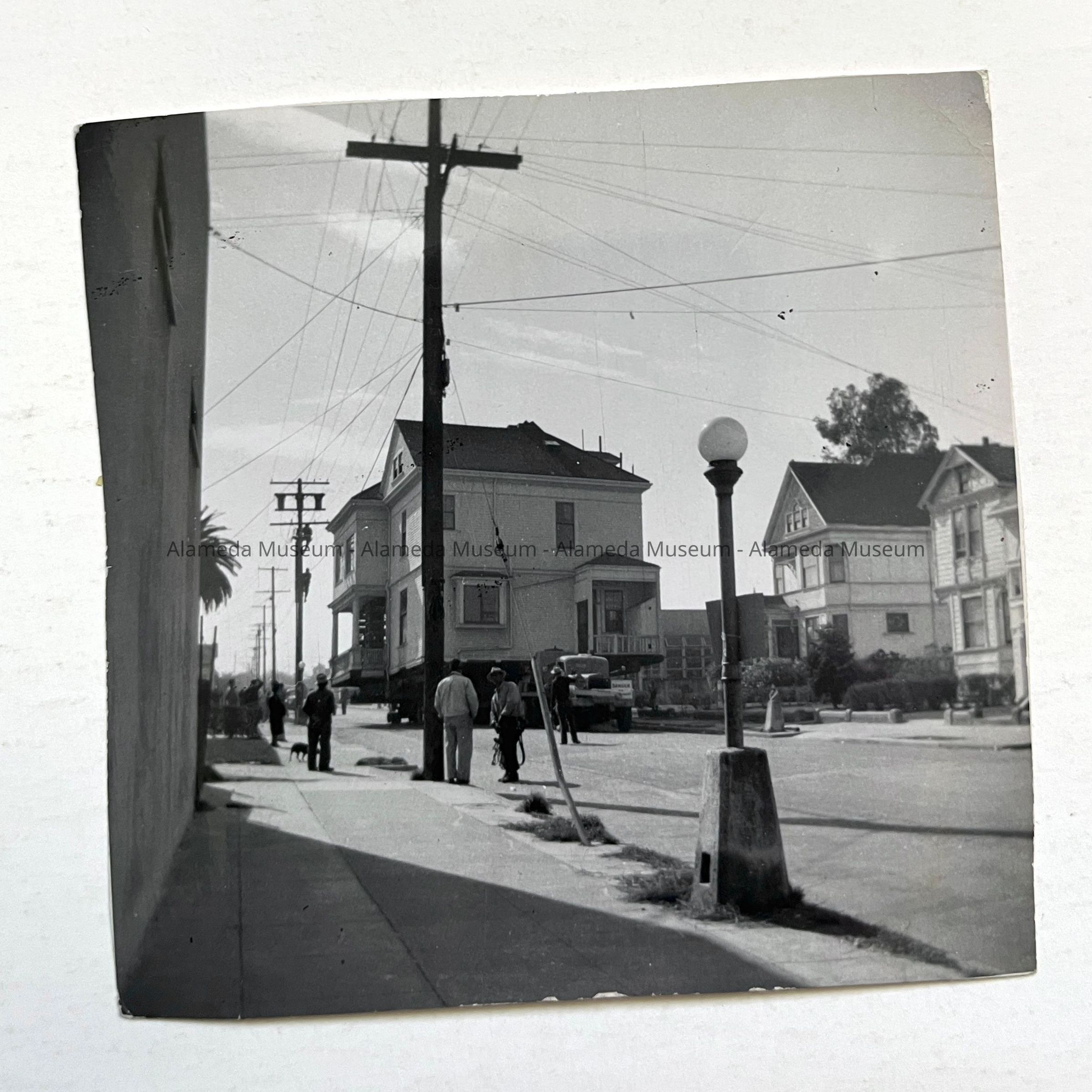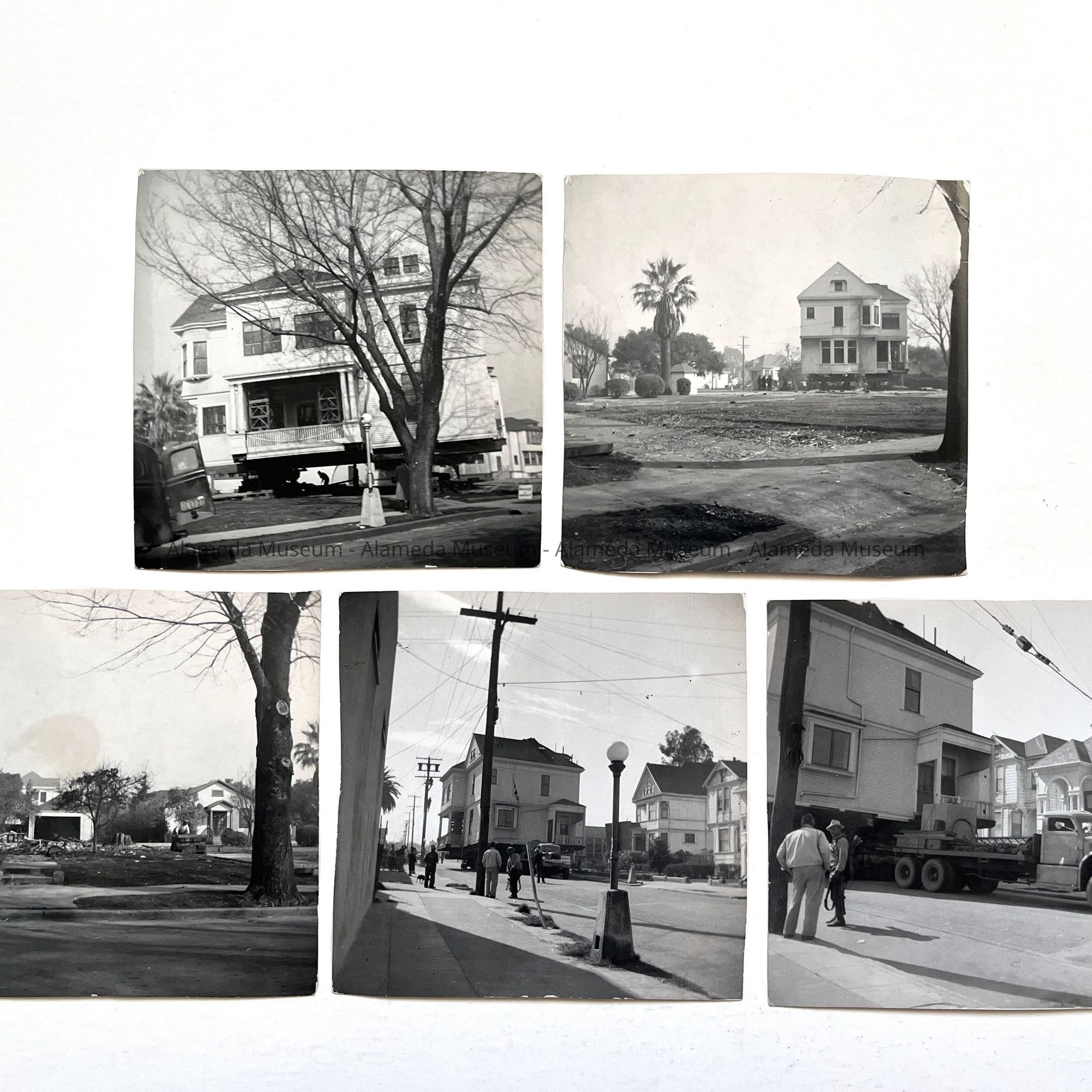 Photos (5) depicting the moving of 1427 San Antonio Avenue (Victorian Queen Anne style residence) to its present location at 1313 Lincoln Avenue. The home was occupied by the Oliver Haslett family for many years. It was removed for the construction of Franklin School. in 1950.