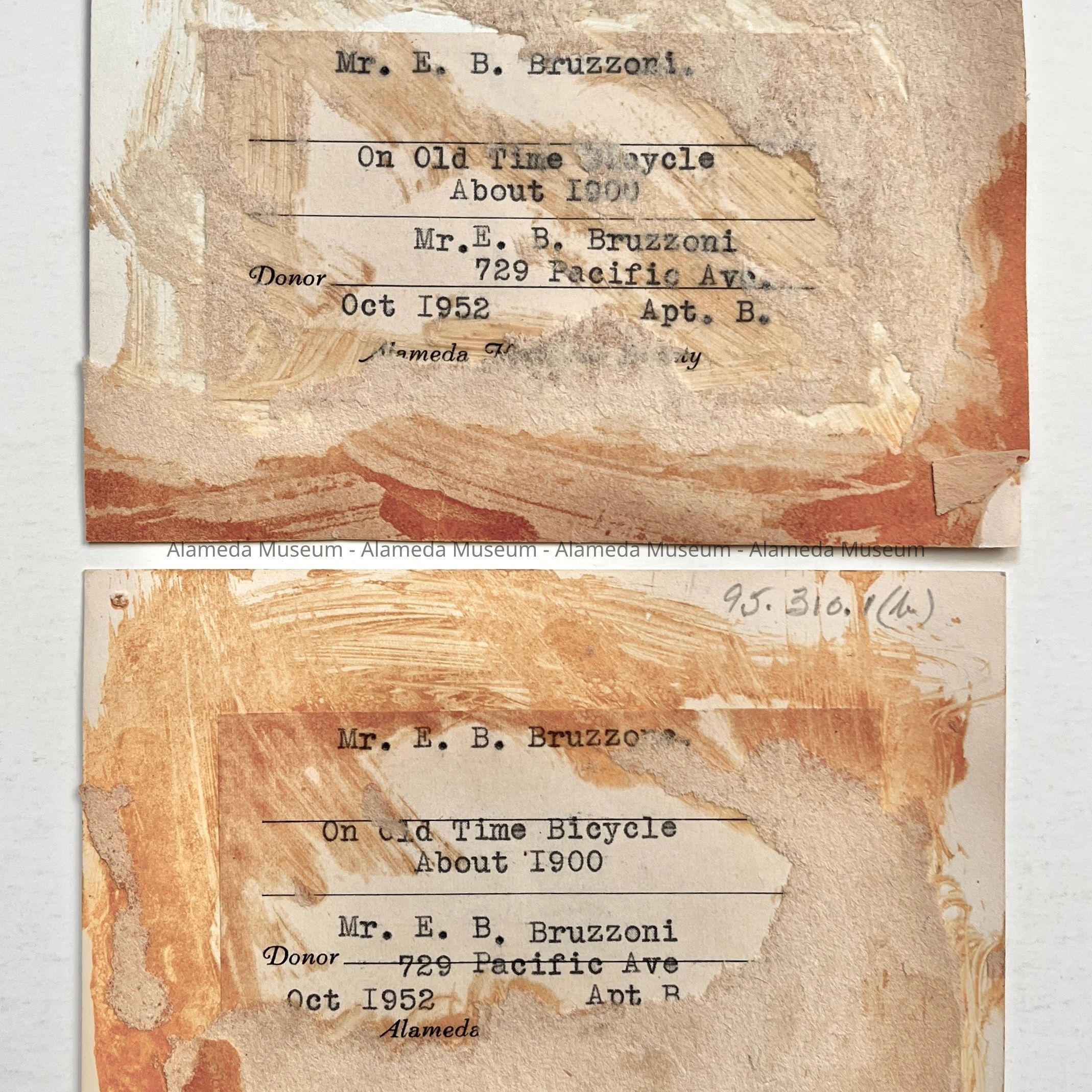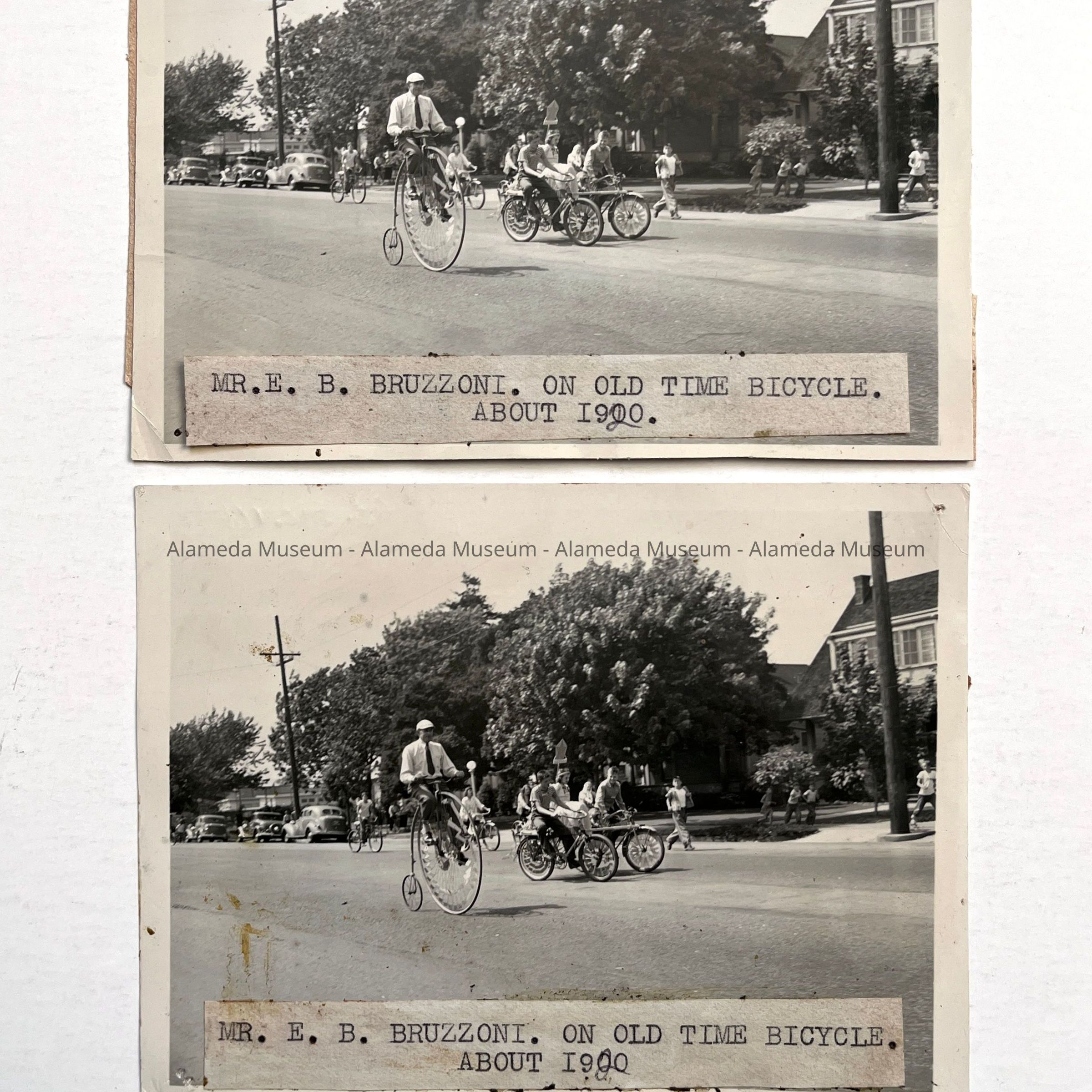 History of Object: View of a man identified as Mr. E. B. Bruzzone riding a high front wheeled bicycle down a residential Alameda street, accompanied by children on conventional bicycles. Images are identical prints.