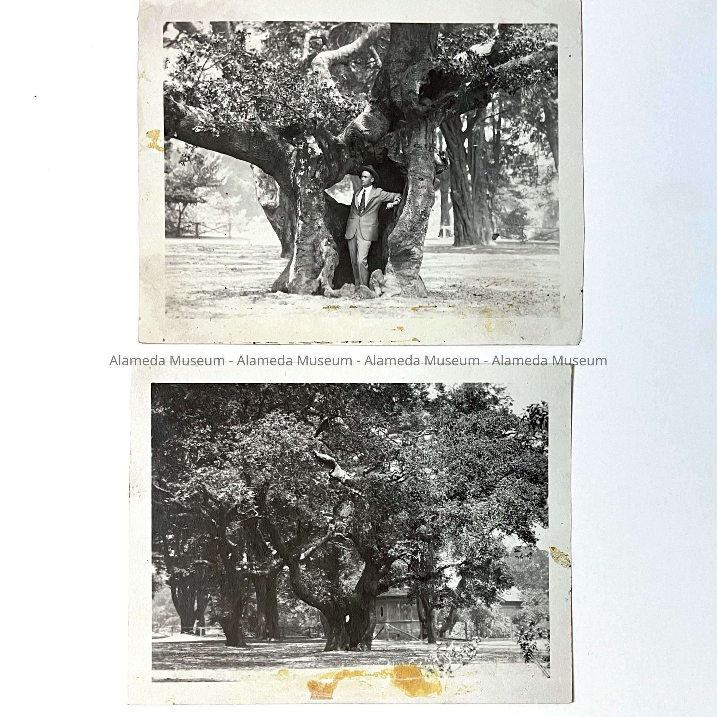 History of Object: Three views of oak trees on the Cohen Estate: image #a - a man standing within the open trunk of an old tree; #b - view of a grove of trees; #c - another view of a grove.