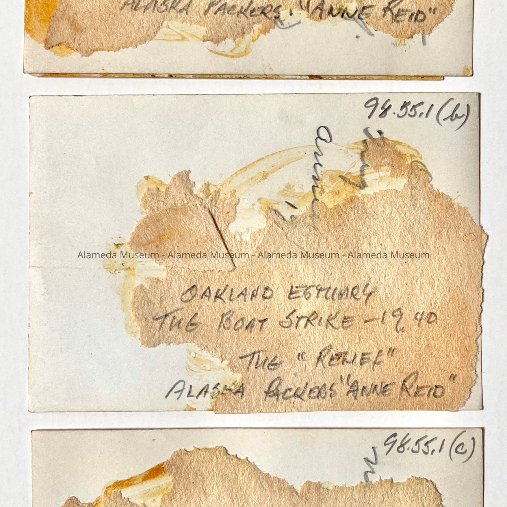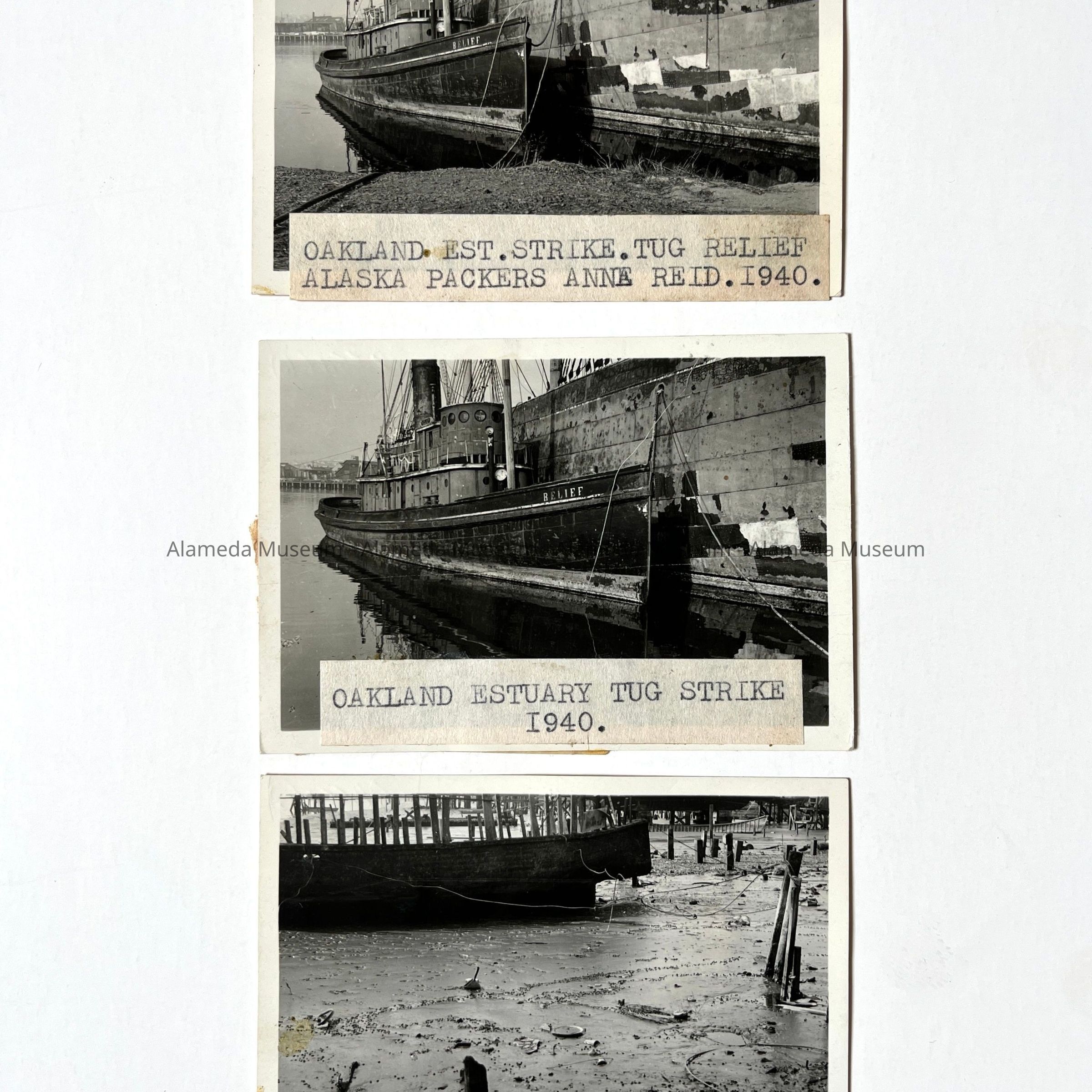 History of Object: Oakland Estuary scenes taken at the time of the tugboat strike: #a - tugboat "Relief" docked next to the alaska Packers ship "Anne Reid"; #b - similar view to #a; #c - a boat beached in the Estuary.