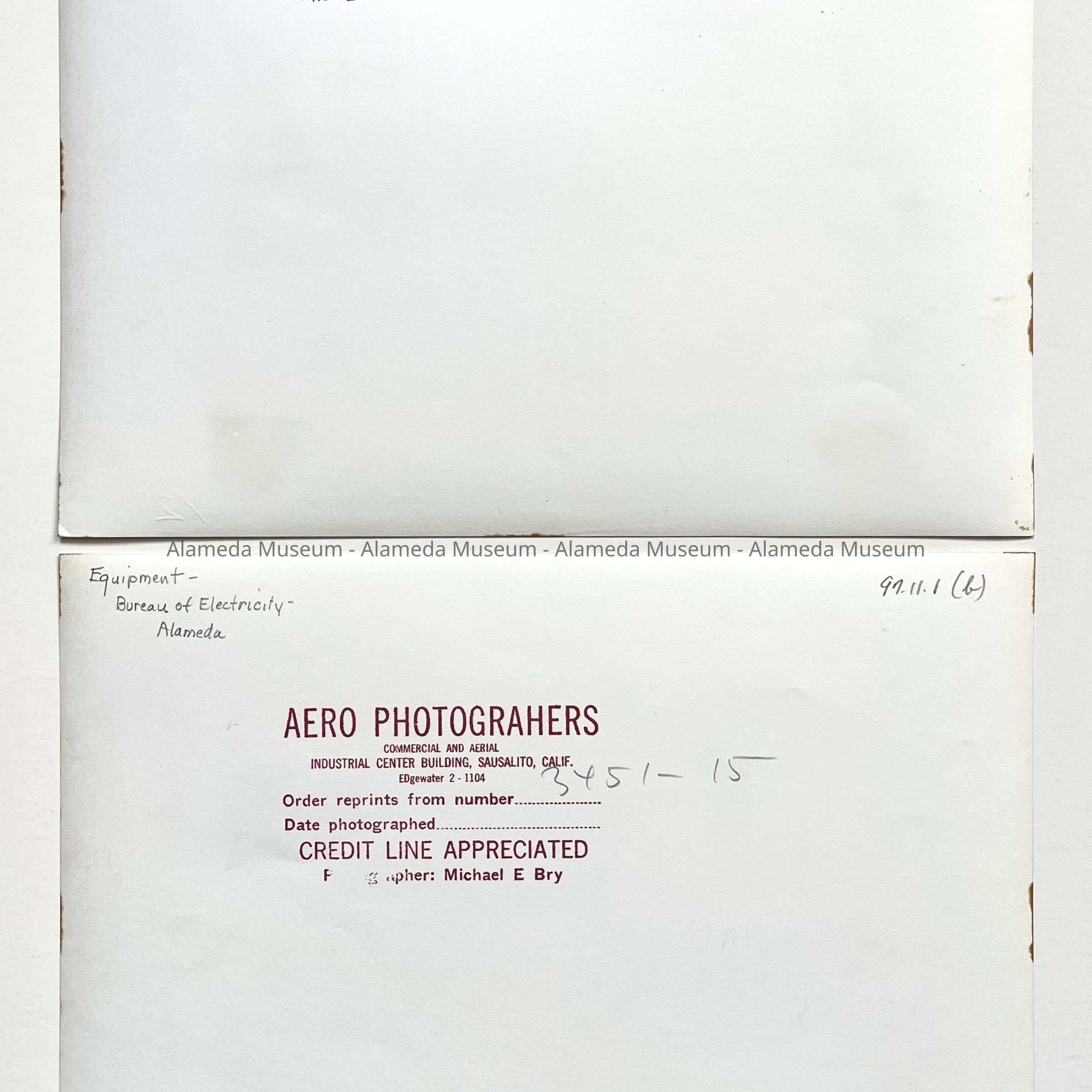 Description: Two glossy black/white photos, unmounted. Photographer: Michael E. Bry of Aero Photographers, Sausalito, CA. Minor marking and Scotch tape remnants are along the bottom margin of both images.