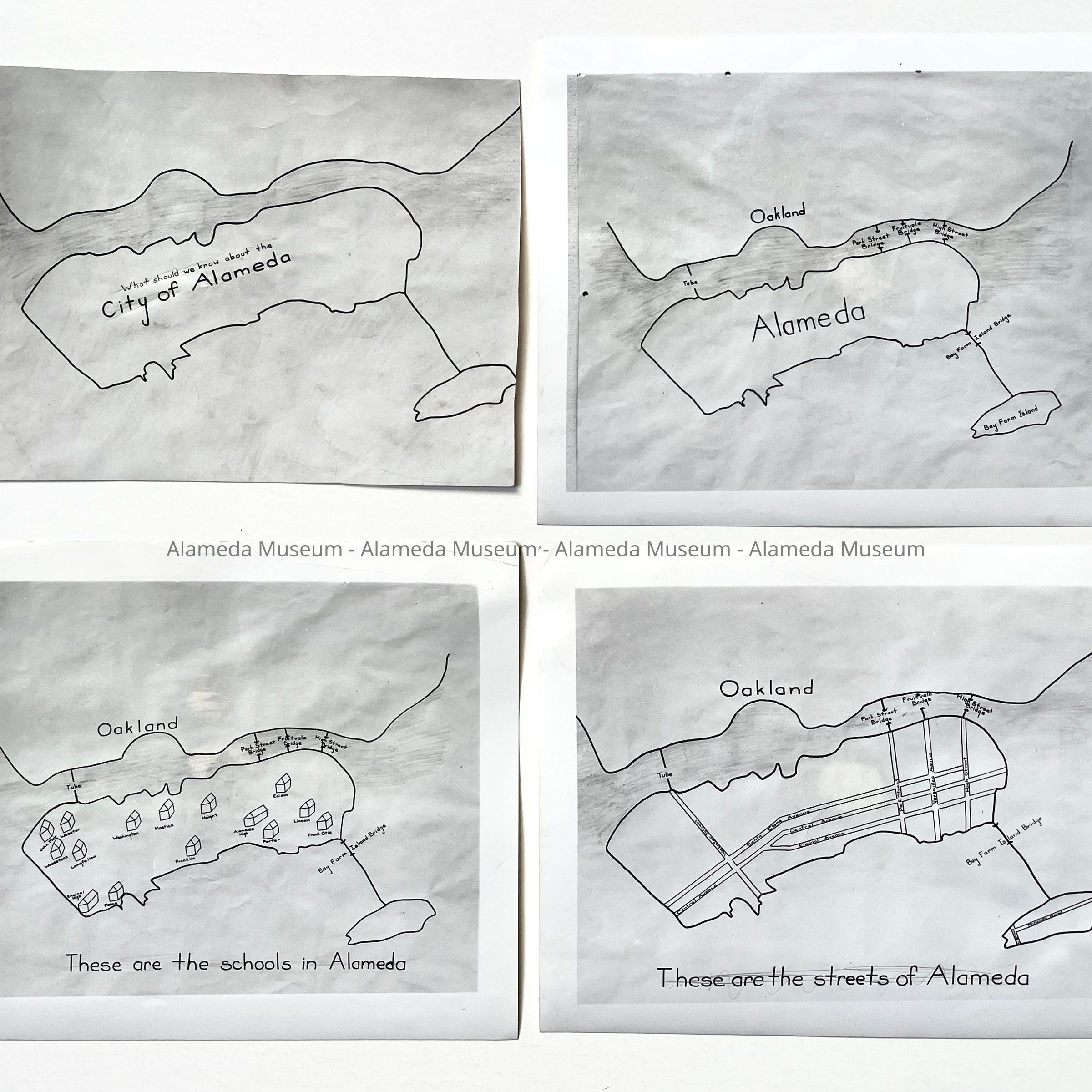History of Object: Photos of pen and ink outline maps of the City of Alameda showing the location of bridges and the Posey Tube, of major streets, and the public schools.