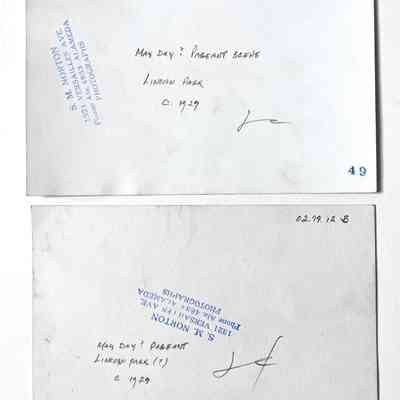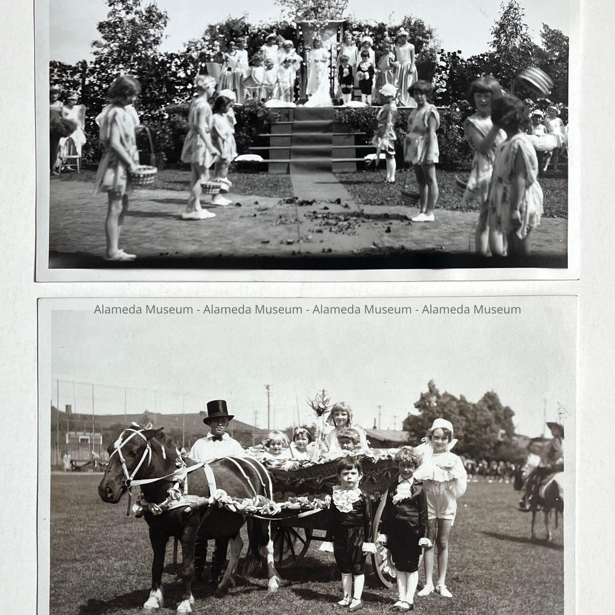 History of Object: Pageant scenes (possibly for May Day) at Lincoln Park: A) pageant tableau showing a royal court scene complete with flower girls; B) donkey-drawn float with court attendants.