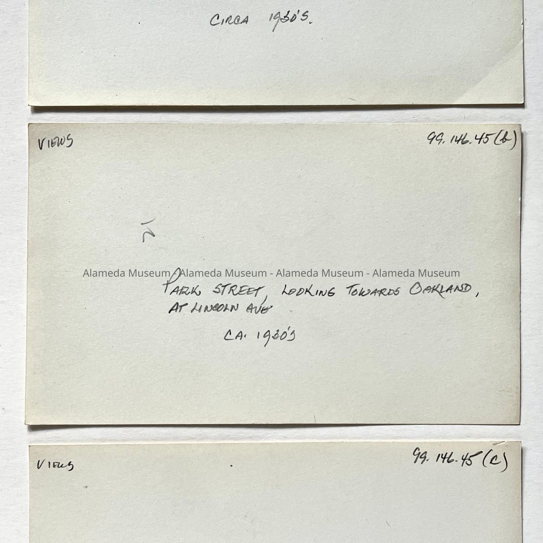 History of Object: Three views of Park Street looking towards Oakland: #a- at Santa Clara Ave., #b- at Lincoln Ave.; #c- at Eagle (or Clement) Ave.