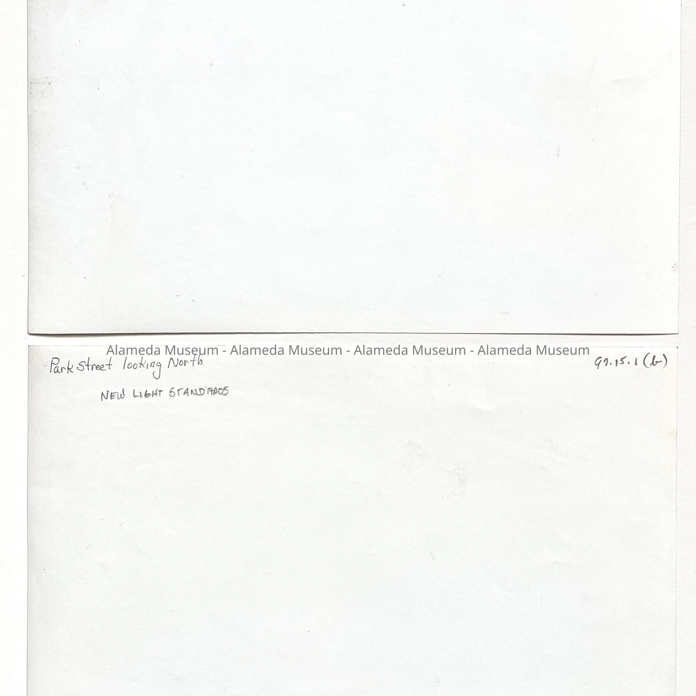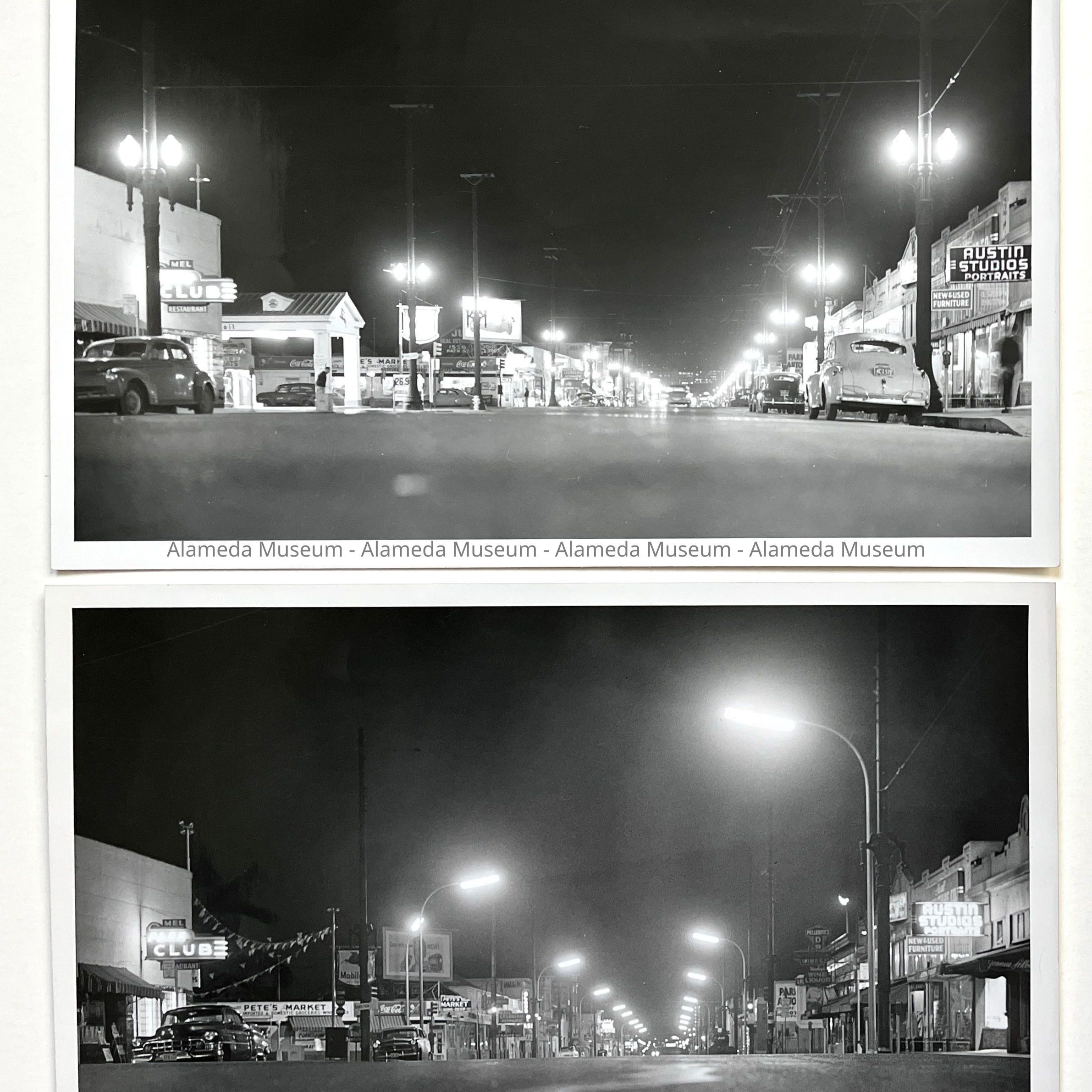 History of Object: Two night views of Park Street, taken from the approximate same location: a) showing old light standards; b) showing the new light standards.