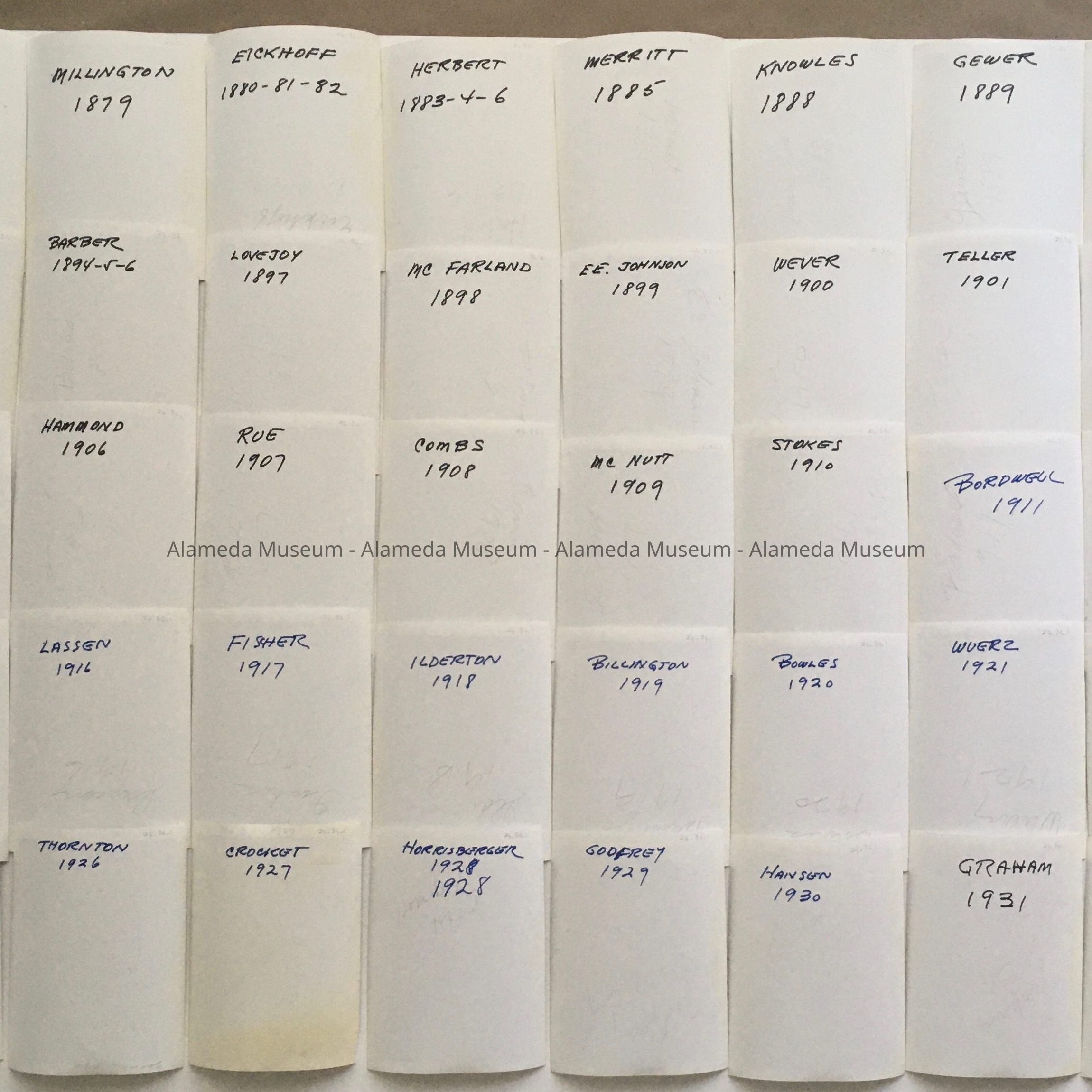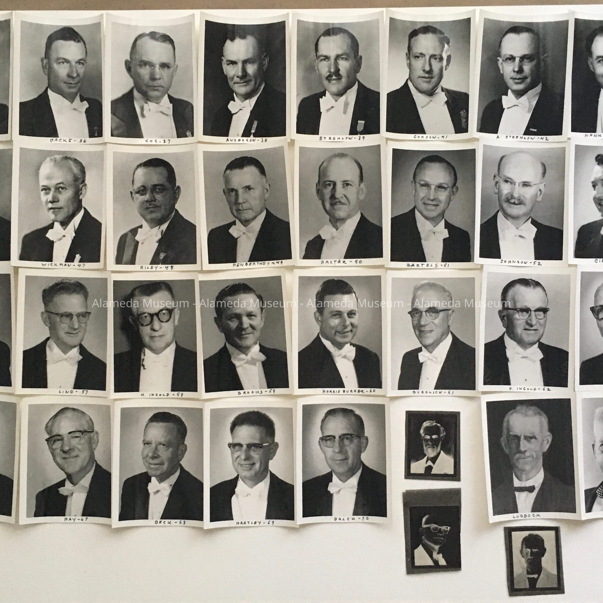 History of Object: Photographs of some past officers (Master, Secretary) of the Oak Grove Lodge, #215, Free and Accepted Masons, of the Masonic Order from the first Master, Eliphalet Minor Smith, 1871, To Master Balch, 1970. Among the officers are Alameda City community leaders, political figures, and business owners, so relevance extends beyond the Masonic Order.
