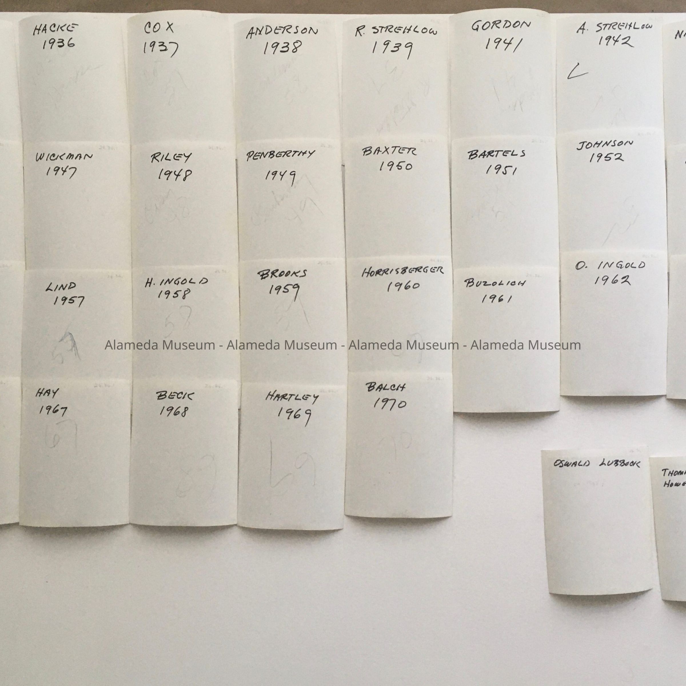 Full list based on information on reverse: masters: Eliphalet Minor Smith, 1st Master Oak Grove Lodge, 1871 [ - 1872 - 1873 - 1874 - 1877 - 1878]; McGoun [McGowan] - 1875 - 1876 - 1877; Millington - 1879; Eickhoff, - 1880 - 1881 - 1882; Herbert - 1883 - 1884 - 1886; Merritt -1885; Knowles - 1888; Gewer - 1889; Yablonsky - 1890; Collins - 1891; Cormeny - 1892; Sullivan - 1893; Barber - 1894 - 1895 - 1896; Lovejoy - 1897; McFarland - 1898; E.E. Johnson - 1899; Wever - 1900; Teller - 1901; Baurhyte - 1902; Youngbert - 1903; Knowland - 1904; Simpson - 1905; Hammond - 1906; Rue - 1907; Combs - 1908; McNutt - 1909; Stokes - 1910; Bordwell - 1911; Robinson - 1912; Eschen - 1913; Allardyce - 1914; Strachan - 1915; Lassen - 1916; Fischer - 1917; Ilderton - 1918; Billington - 1919; Bowles - 1920; Wuerz - 1921; Thompson - 1922; Howen - 1923; Bettencourt - 1924; Oehlmann - 1925; Thornton - 1926; Crocket - 1927; Horrisberger - 1928; Godfrey - 1929; Hansen - 1930; Graham - 1931; Cunningham - 1932; Snead, Jr. - 1933; Nobmann - 1934; Garratt - 1935; Hacke - 1936; Cox - 1937; Anderson - 1938; R. Strehlow - 1939; [? - 1940?]; Gordon - 1941; A. Strehlow - 1942; Nankervis - 1943; Gleb - 1944; Thomason - 1945; Teakle - 1946; Wickman - 1947; Riley - 1948; Penberthy - 1949; Baxter - 1950; Bartels - 1951; Johnson - 1952; Geisert - 1953; Carlile - 1954; Mutch - 1955; Benson - 1956; Lind - 1957; H. Ingold - 1958; Brooks - 1959; Horrisberger - 1960; Buzolich - 1961; O. Ingold - 1962; Harris - 1963; Murray - 1964; Miller - 1965; Stickney - 1966; Hay - 1967; Beck - 1968; Hartley - 1969; Balch - 1970.