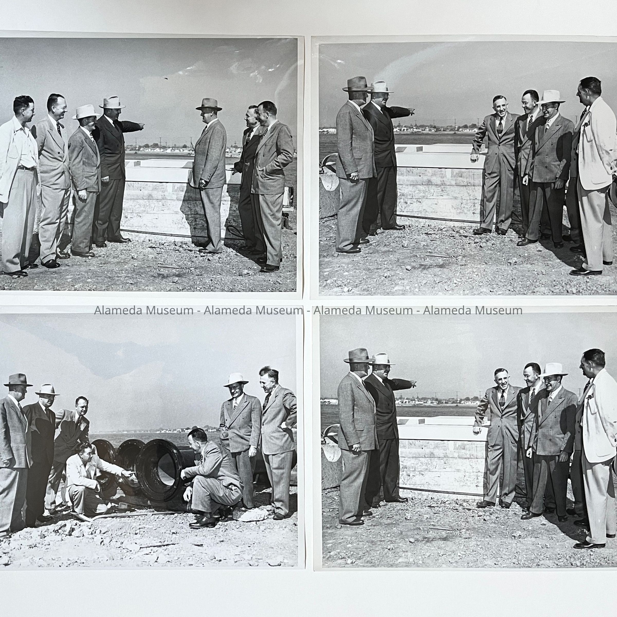 SERIES OF PHOTOGRAPHS DEPICTING A GROUP OF INDIVIDUALS POINTING OUT THE DIRECTION OF THE SAN LEANDRO CHANNEL CROSSING, NOW BAY FARM ISLAND PIPELINE. PICTURED ARE JIM MCCALL AND OTHERS.