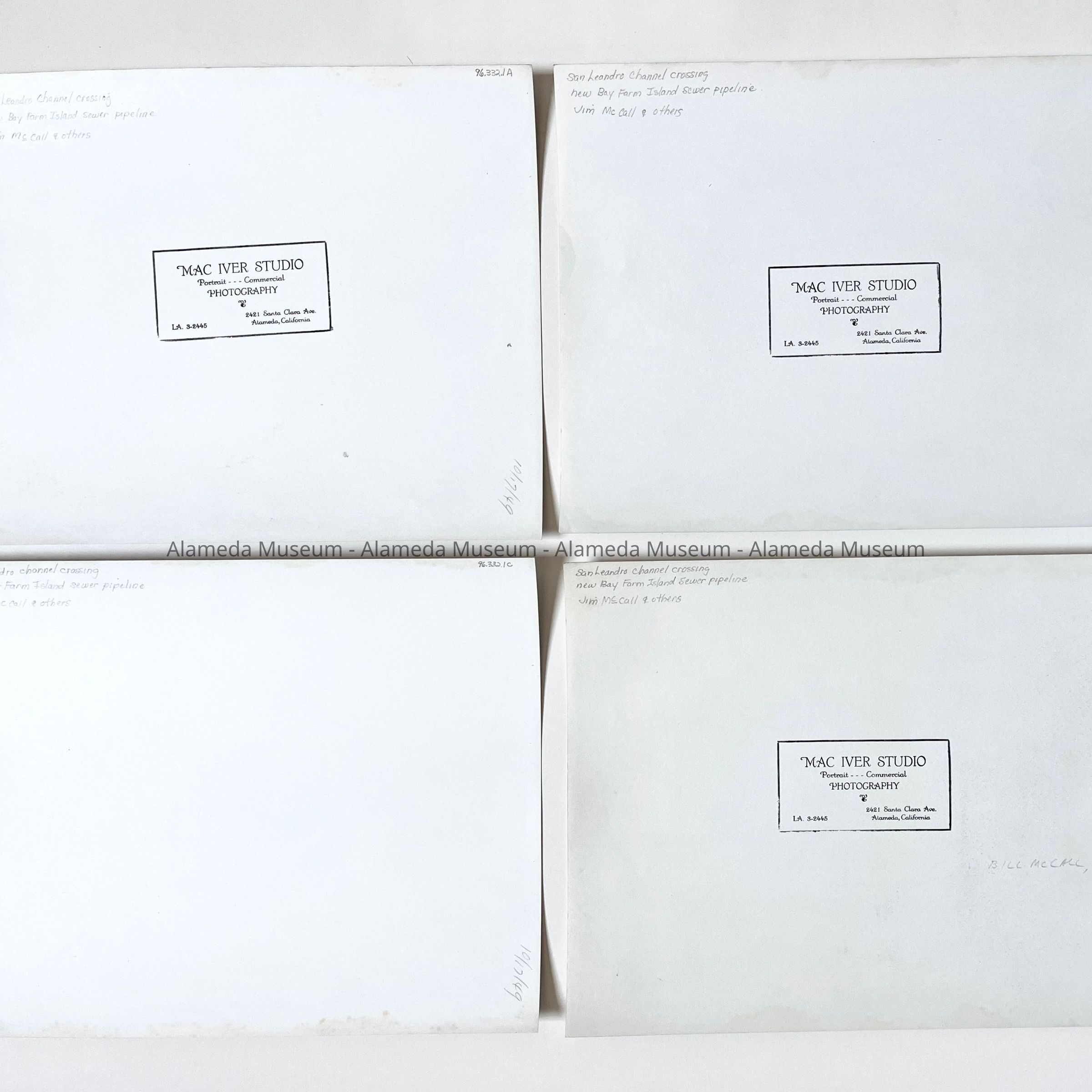 SERIES OF FOUR BLACK AND WHITE GLOSSY PHOTOGRAPHS, SIGNED ON THE REVERSE SIDE, "MAC IVER STUDIO, ALAMEDA, CALIFORNIA."