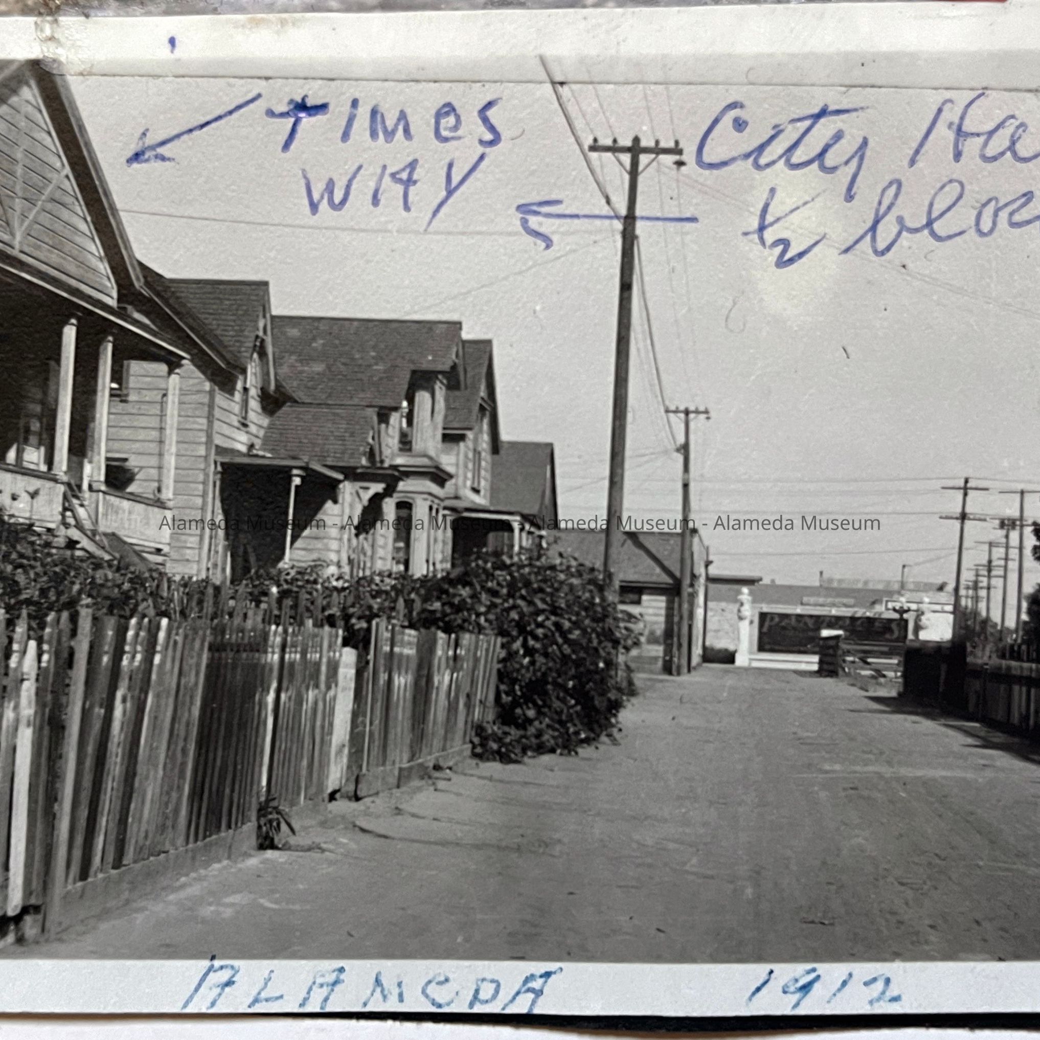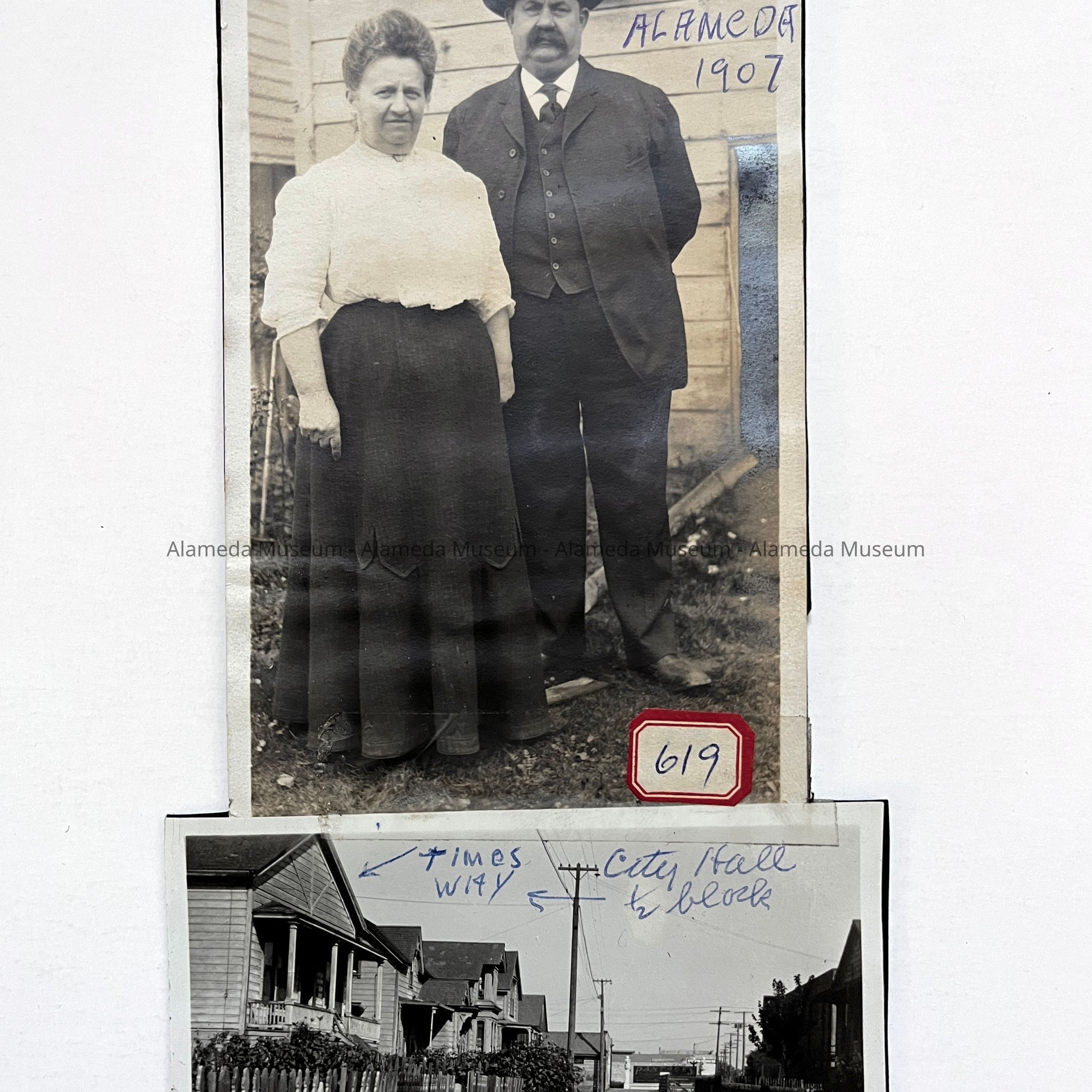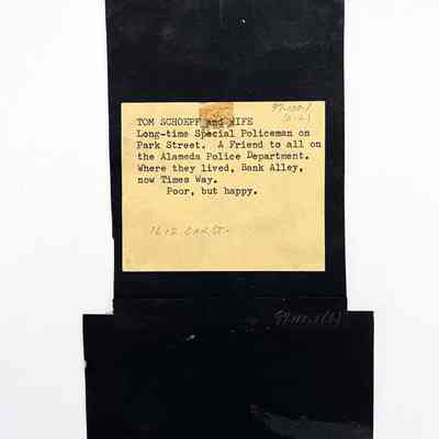 History of Object: Image #a - special policeman Tom Schoepf and his wife, Gertrude, taken in 1907 (the Alameda City Directory of 1912 lists his occupation as "night watchman"). Image #b - view of his residence on Times Way (formerly "Bank Alley"), 1912.