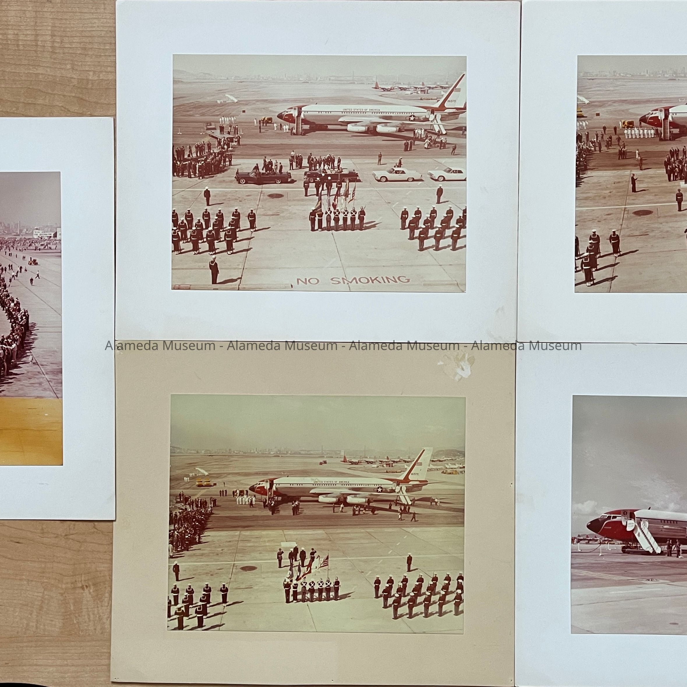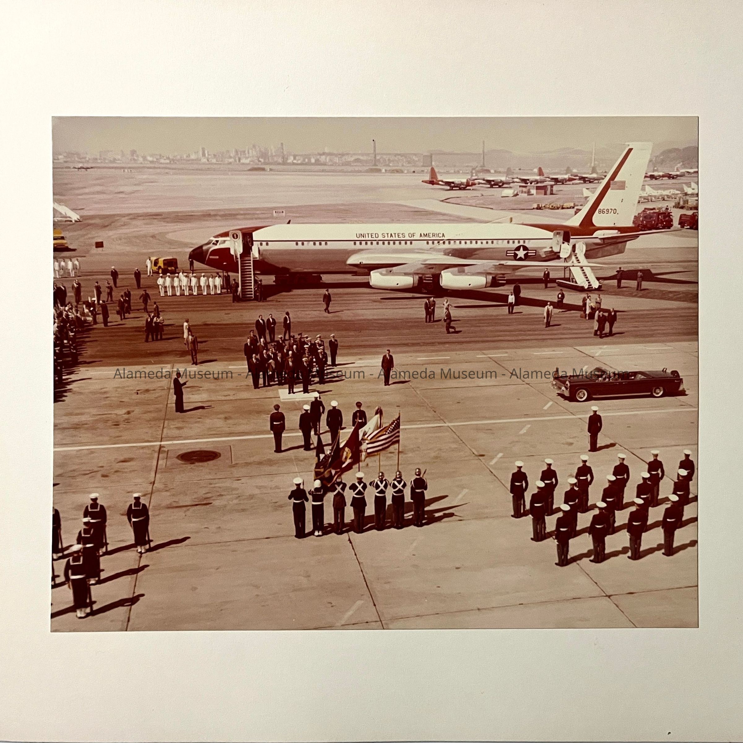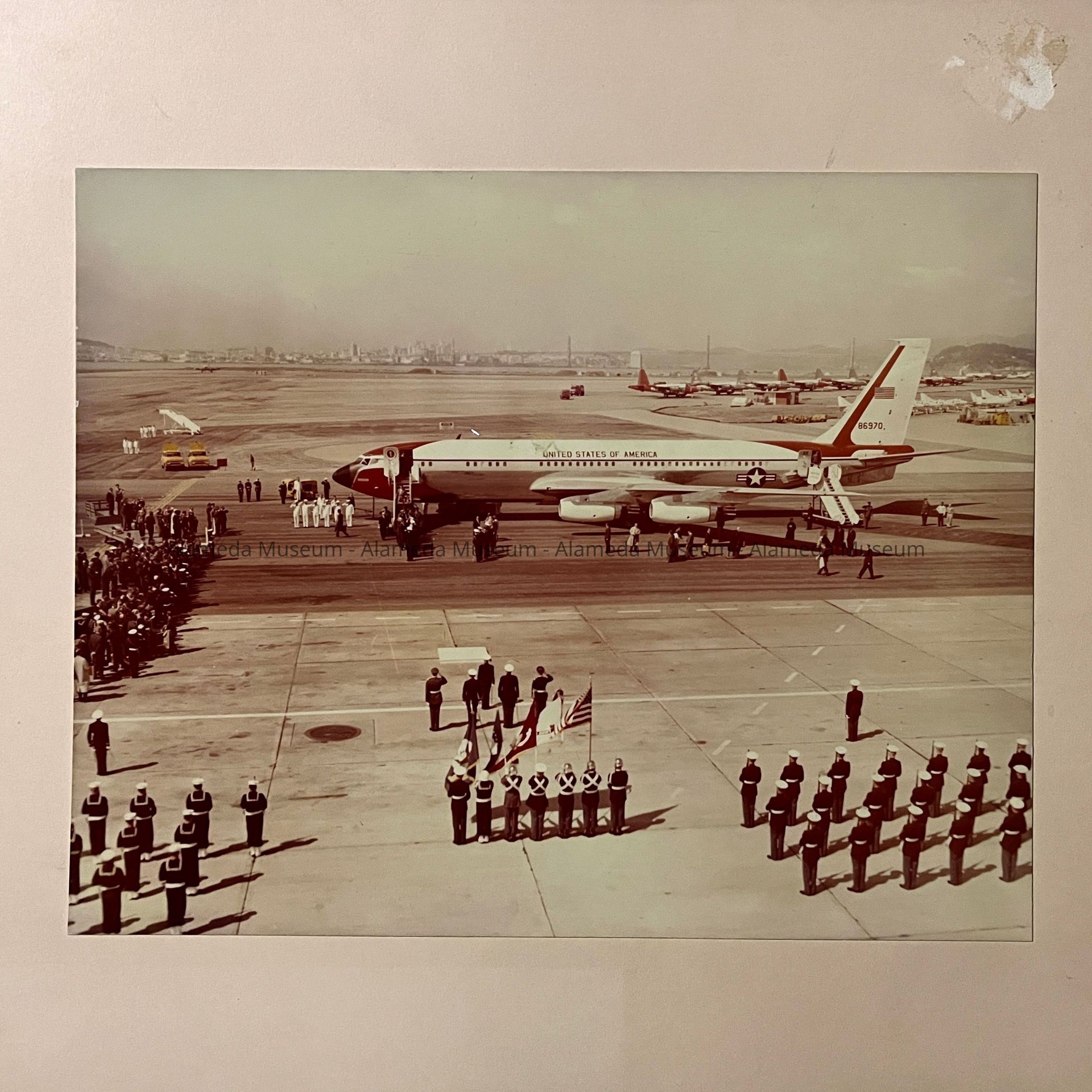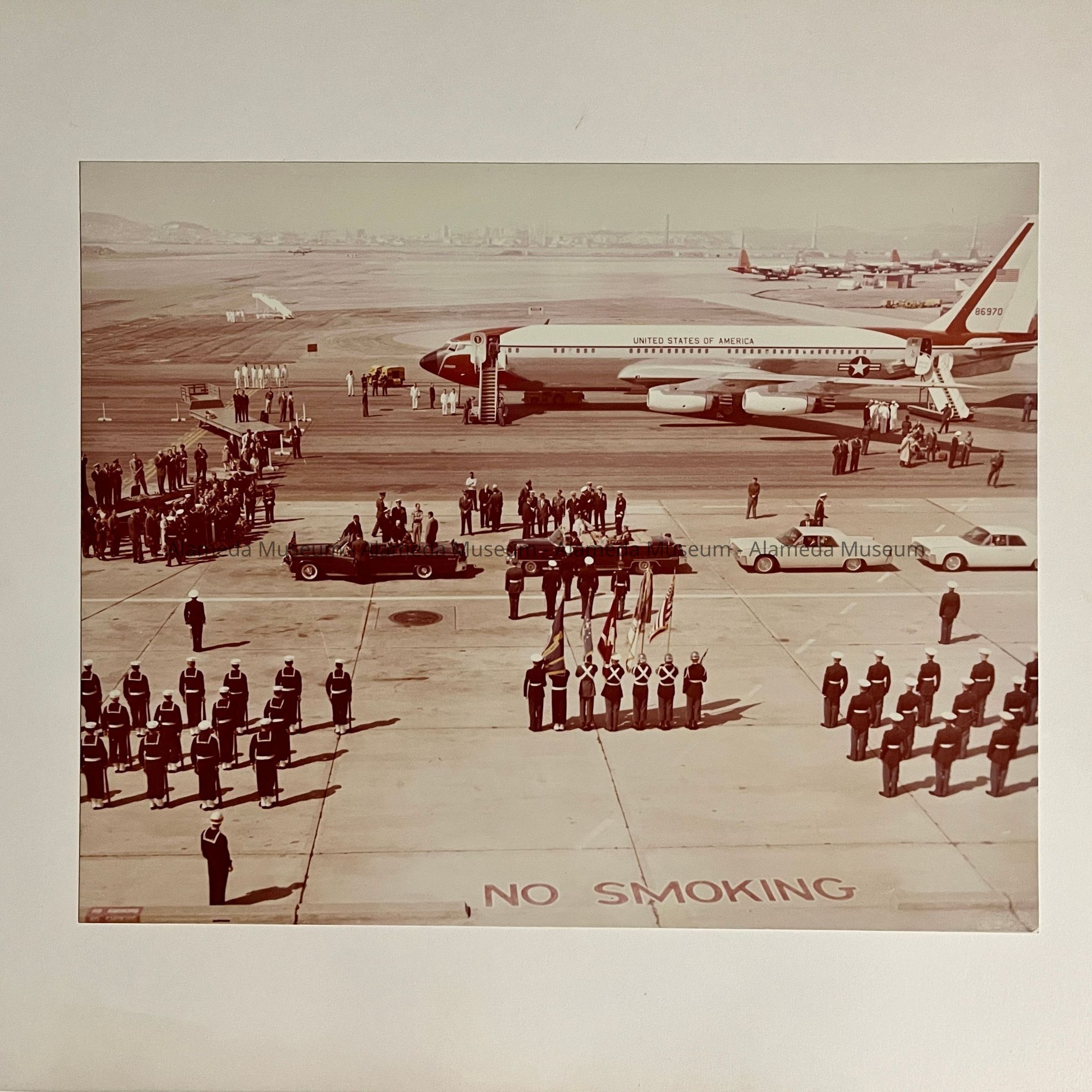PHOTOS DEPICTING THE OFFICIAL AIRPLANE AND ARRIVAL OF PRESIDENT JOHN F KENNEDY, ON THE ALAMEDA NAVAL AIR STATION RUNWAY. INCLUDED IN THE PHOTOS ARE THE MOTOR CAVALCADE, WITH DIGNITARIES AND UNIFORMED NAVAL AND MARINE PERSONNEL. PHOTOS ARE DATED MARCH 23, 1962 ON REVERSE SIDES.