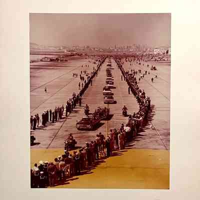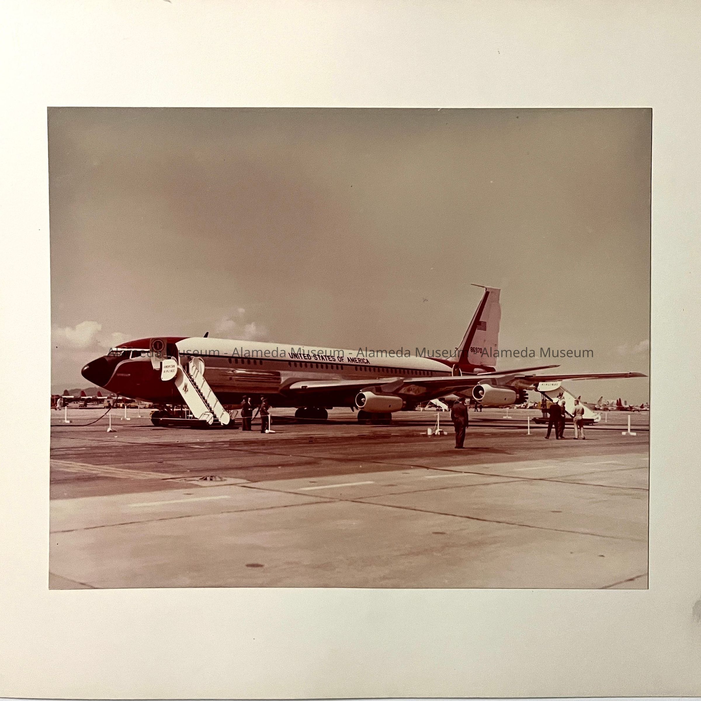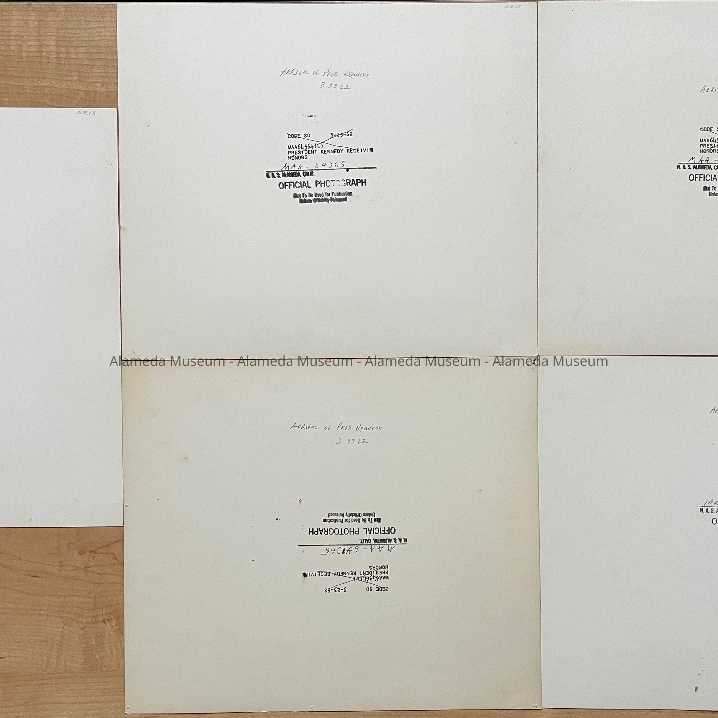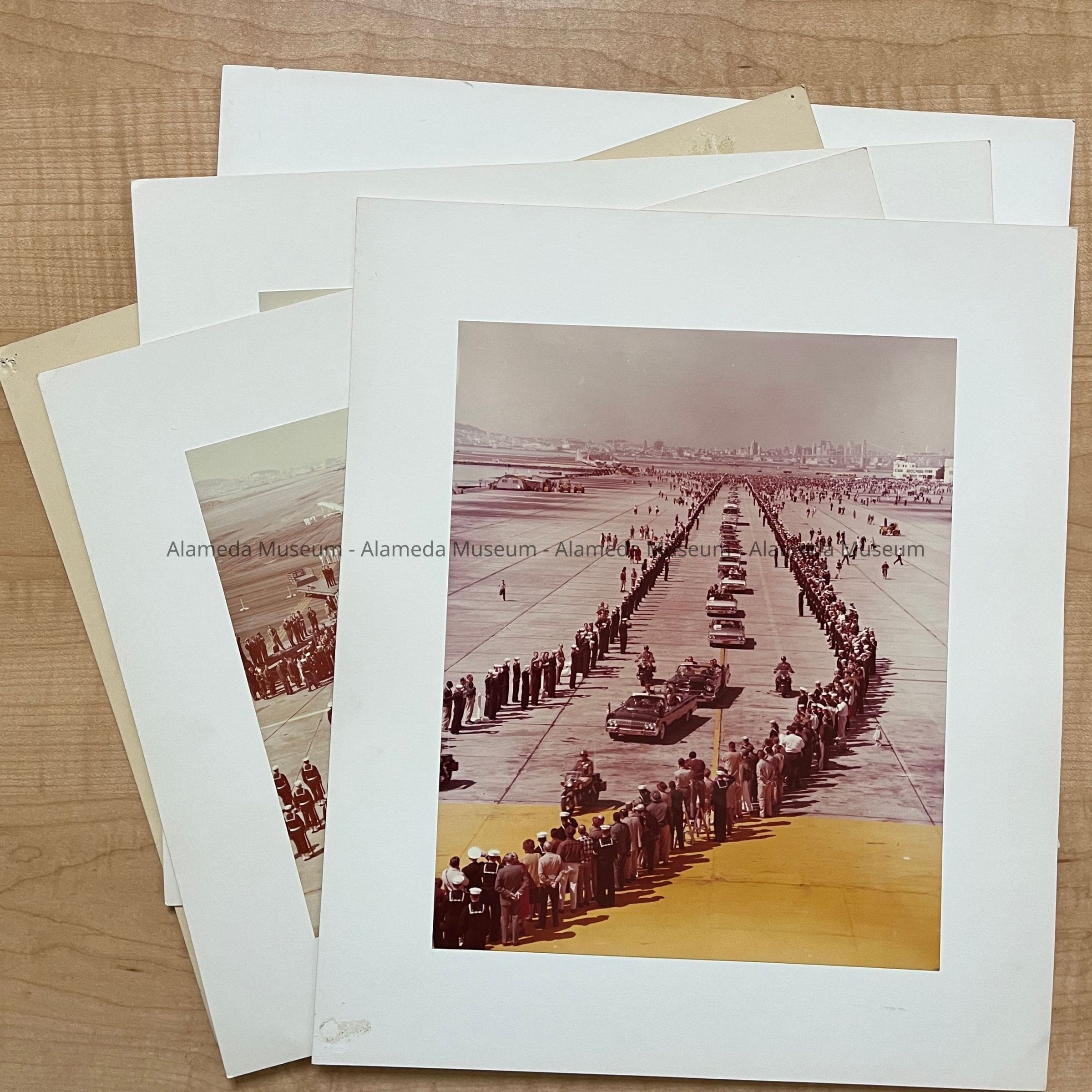 PHOTOS DEPICTING THE OFFICIAL AIRPLANE AND ARRIVAL OF PRESIDENT JOHN F KENNEDY, ON THE ALAMEDA NAVAL AIR STATION RUNWAY. INCLUDED IN THE PHOTOS ARE THE MOTOR CAVALCADE, WITH DIGNITARIES AND UNIFORMED NAVAL AND MARINE PERSONNEL. PHOTOS ARE DATED MARCH 23, 1962 ON REVERSE SIDES.