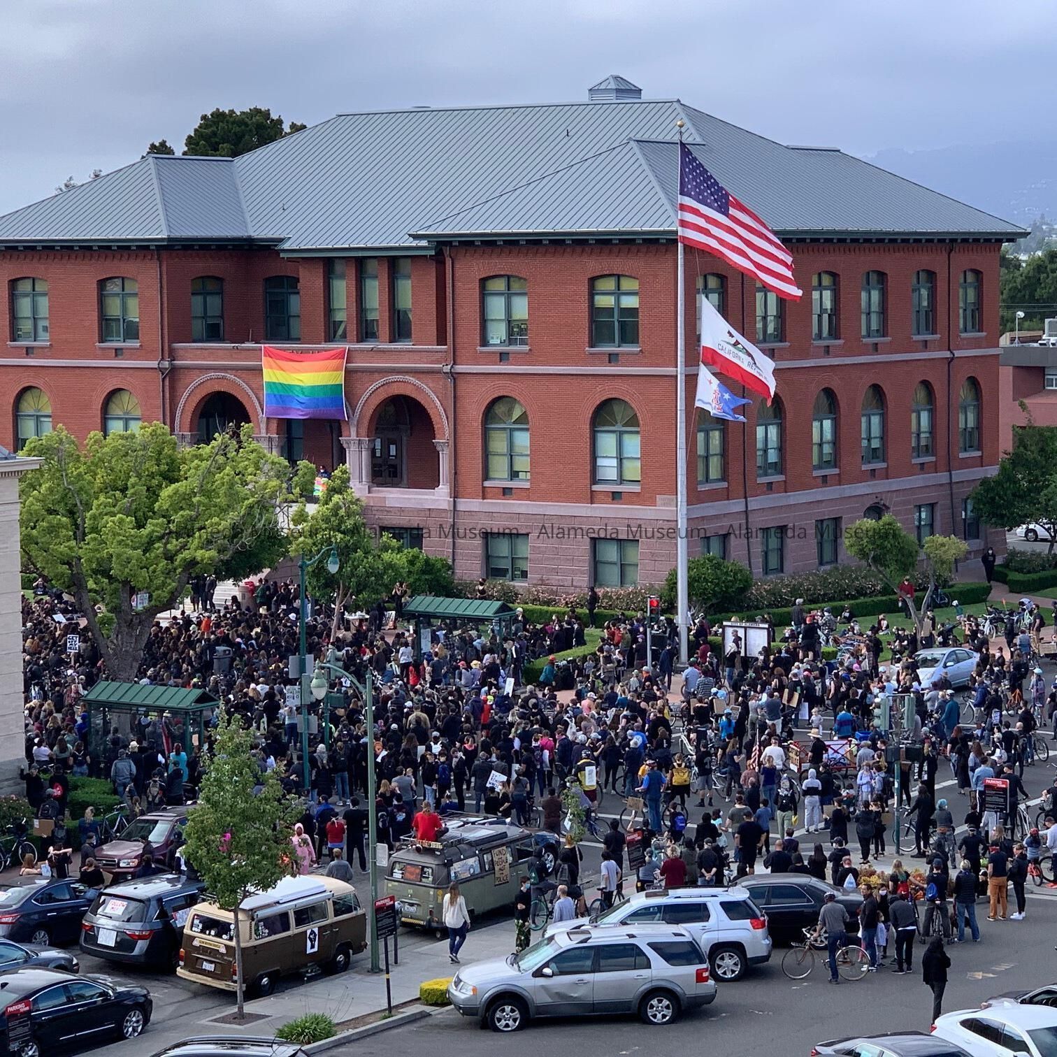 J. Photo of the crowds in front of City Hall, and the intersection of Oak and Santa Clara, taken from the Alameda Theatre Parking Structure. The Library can be seen on the left, and the Police Station on the right. City Hall is sporting a Gay Pride rainbow flag, and on the flag mast are from top to bottom, the Stars-and-Stripes, the California Bear Flag, and the Alameda City (Anchor) flag. By Sofia B. Coffin