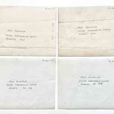 Description: Black/white photos, unmounted. Photographer unknown. Damage noted to the images: #a) minor creasing in center, notation in blue ink on the upper right corner; #b) minor creasing in center, a typed description label is glued to the bottom edge; #c) two full-width horizontal creases, a typed description label is glued to the bottom edge; #d) two full-width horizontal creases.