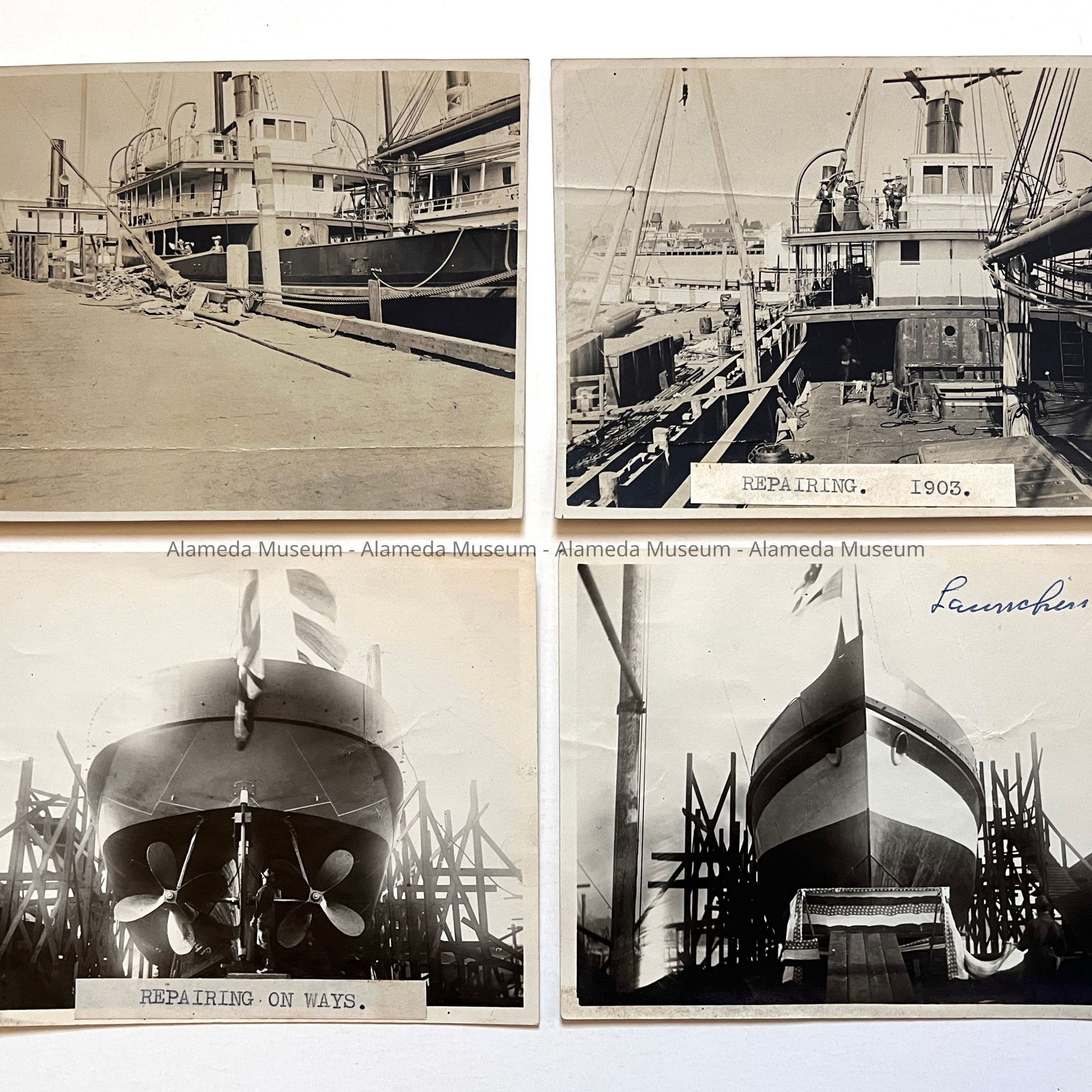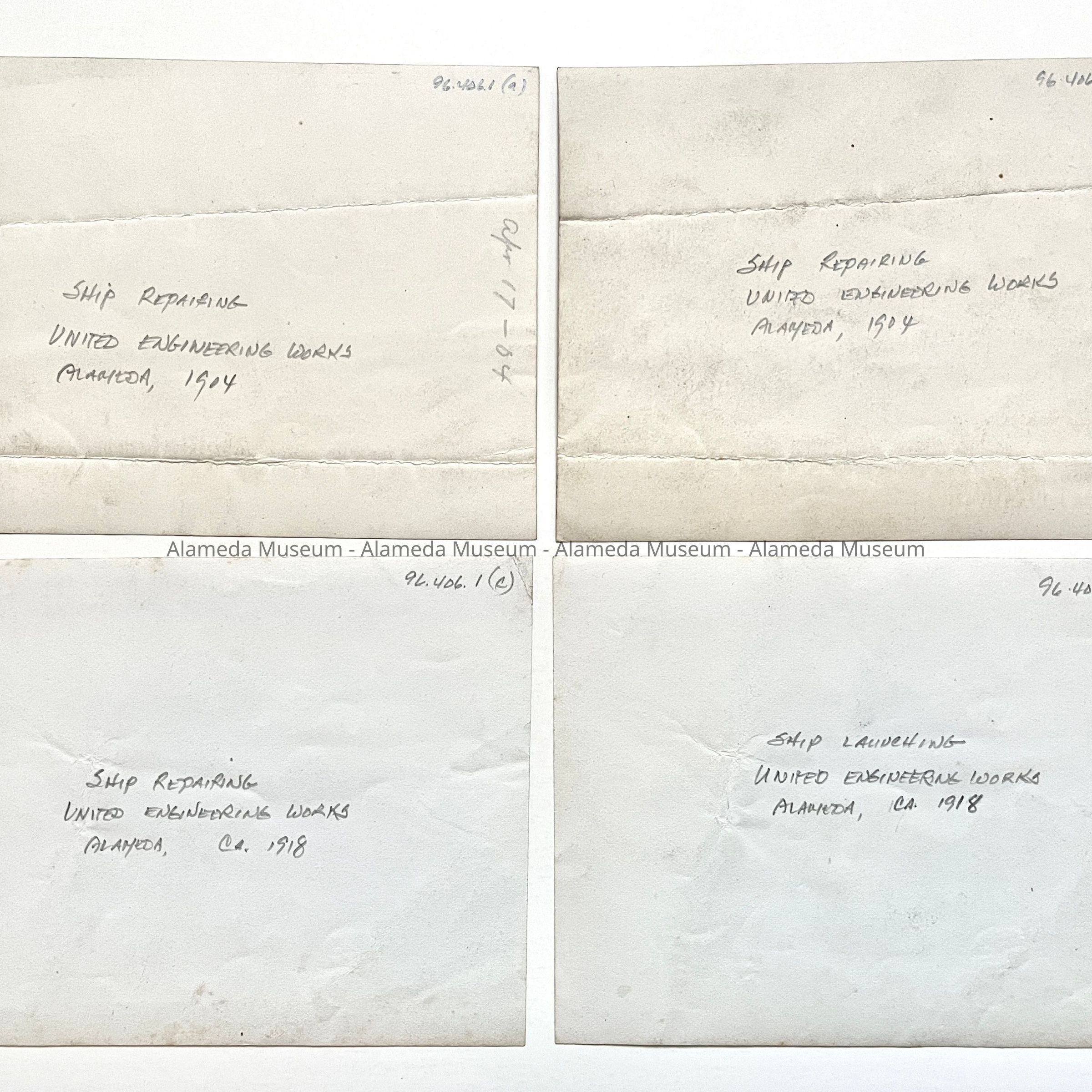History of Object: Scenes at the United Engineering Works shipyard taken at various dates: a) ship prepared for its launching ceremony, ca. 1918; b) ship undergoing repair in drydock, ca. 1918; c) ship undergoing repair on its deck, ca. 1904; d) same vessel, view from an adjacent pier, ca. 1904.